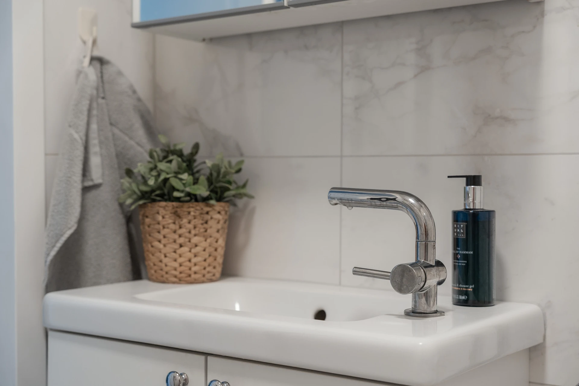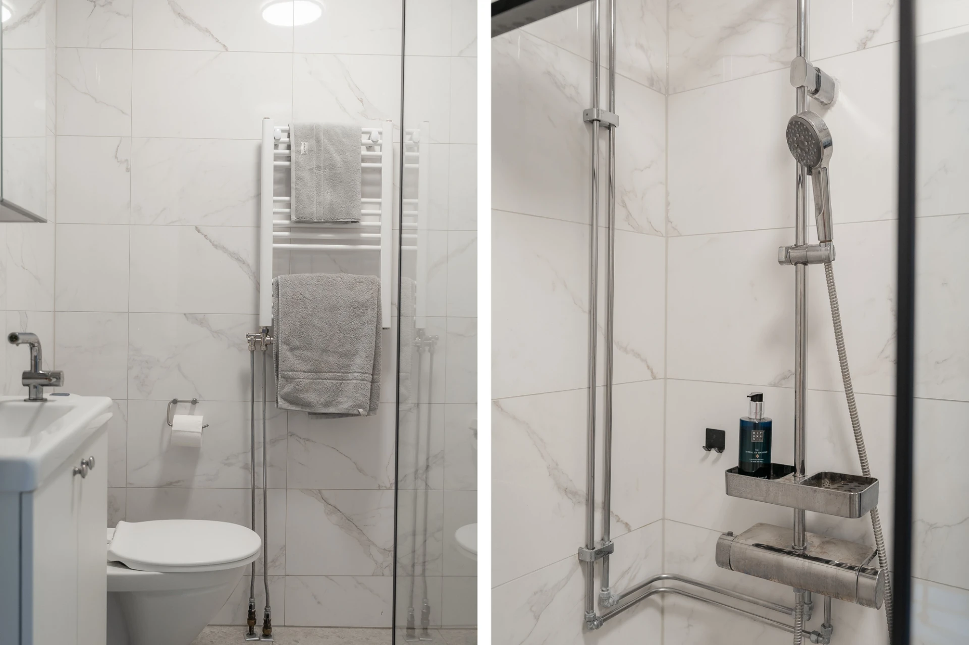 Helkaklat badrum med beige klinker på golvet och marmormönstrat kakel på väggarna. Badrummet är utrustat med wc, dusch och handfat med kommod (Renoverat 2021, våtrumsintyg finns).