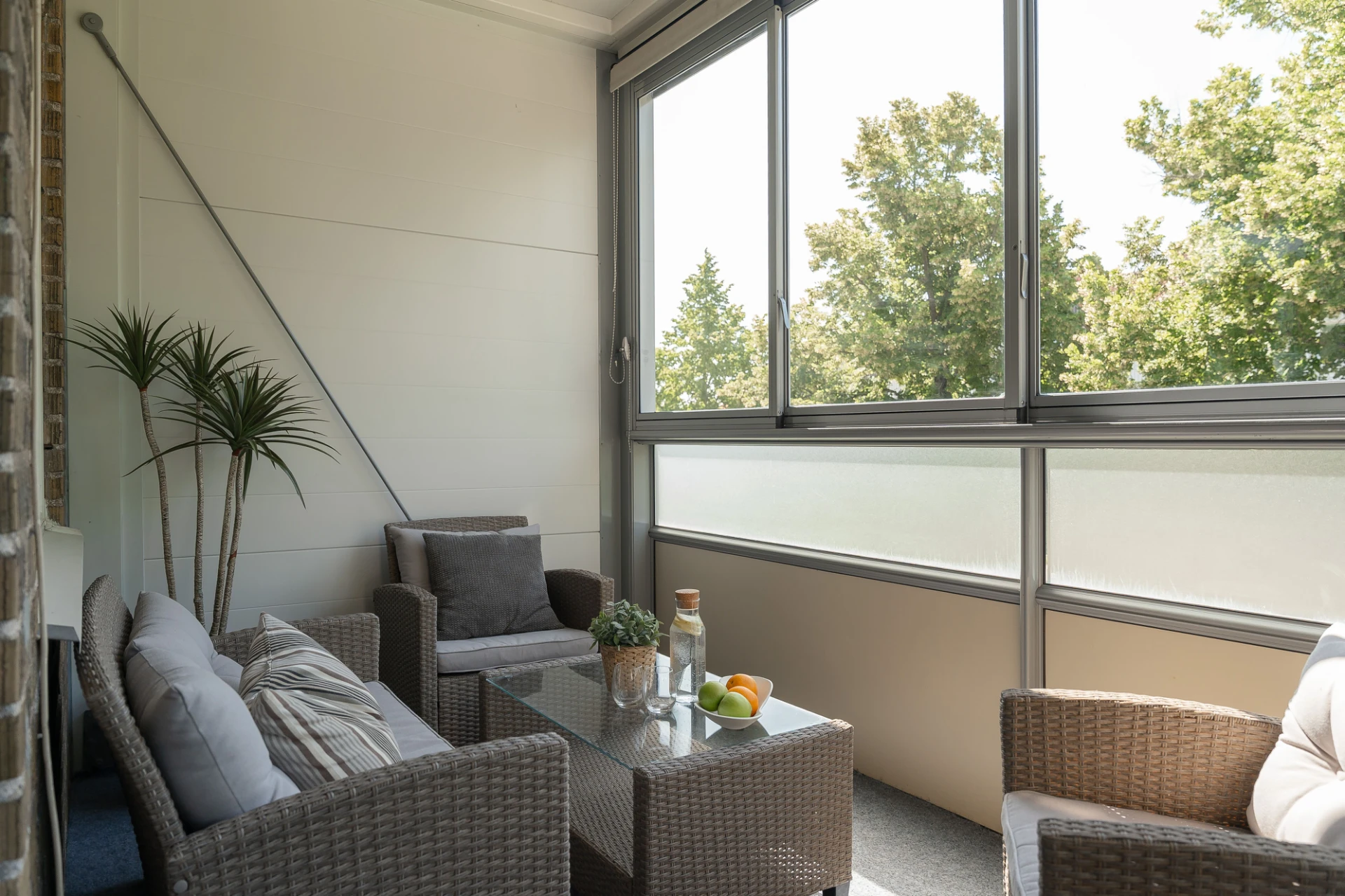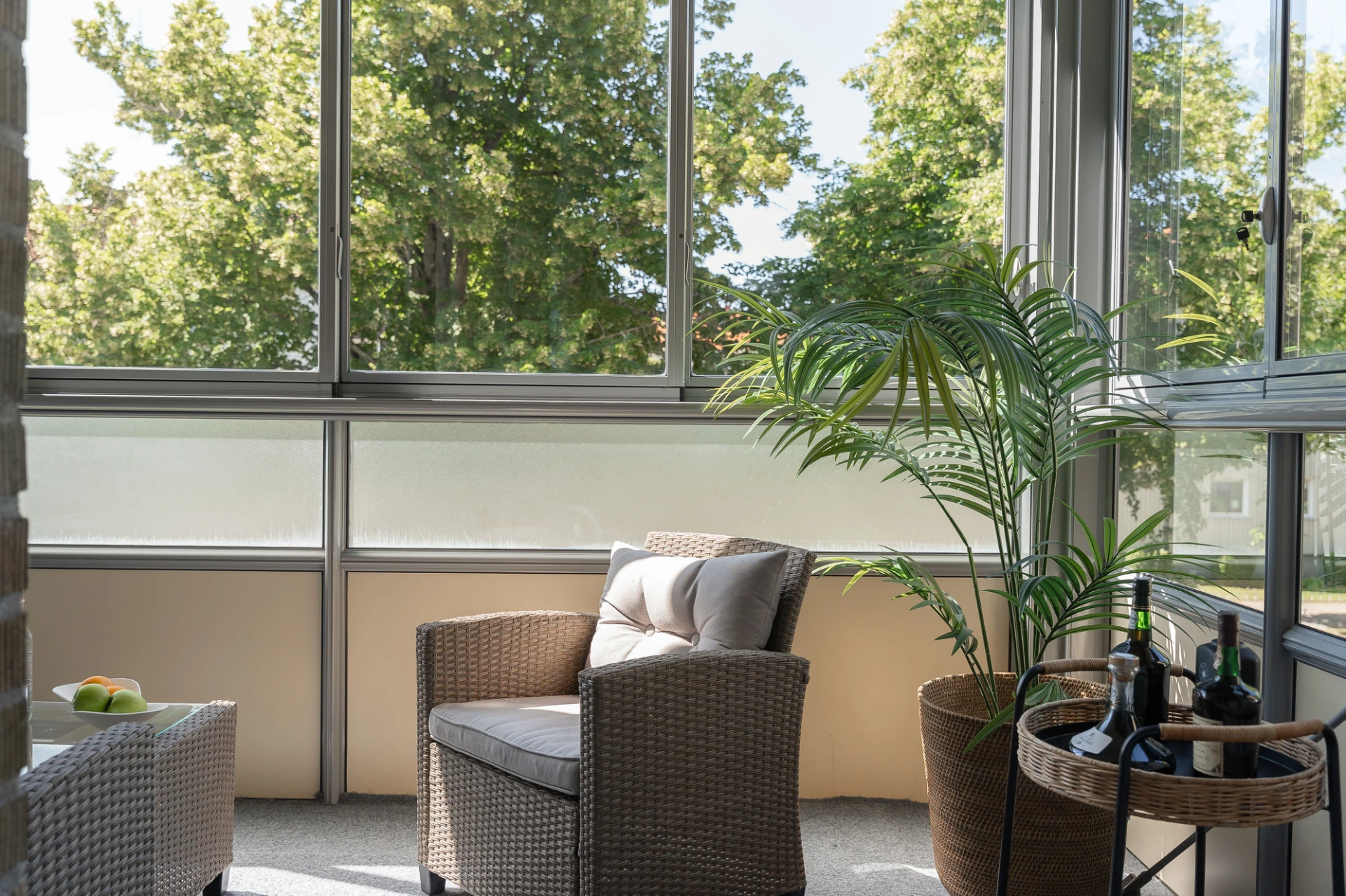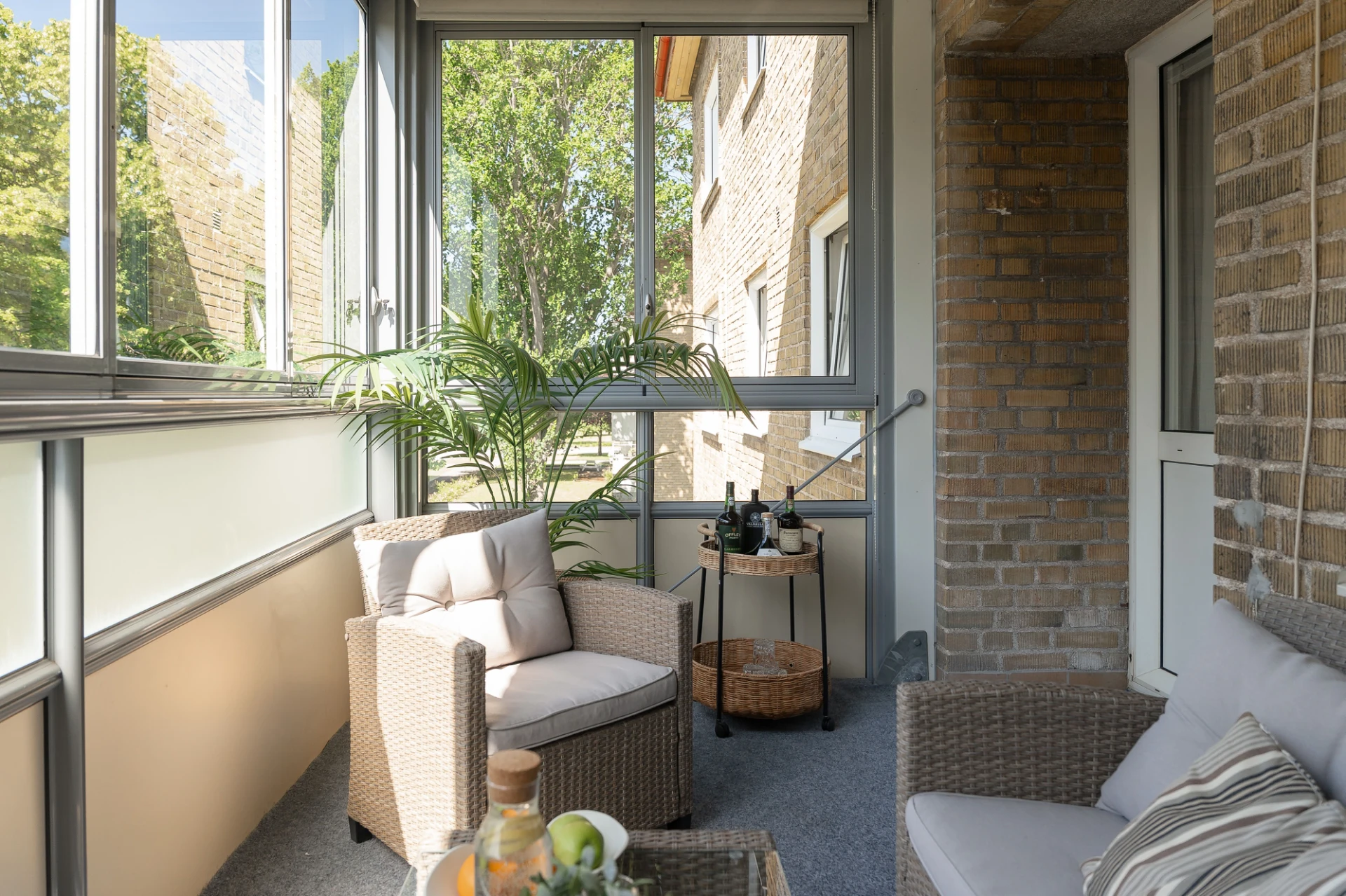 Inglasad balkong med sol hela dagen (ca 8 kvm).