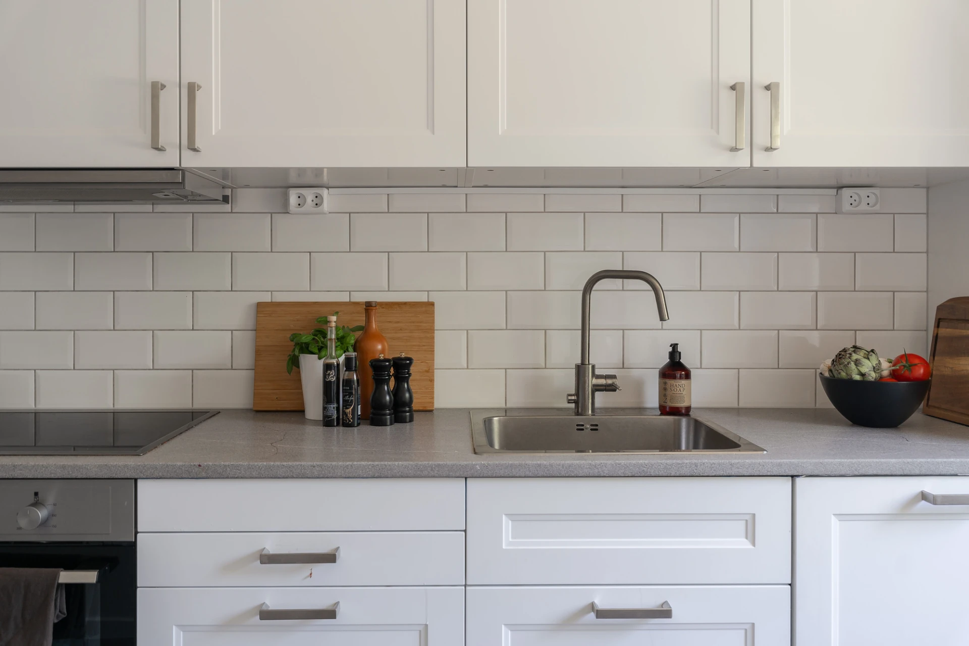 Vit köksinredning utrustad med ugn, induktionshäll, fläkt, vask, integrerad diskmaskin, kyl och frys (väggfärg ebba grey). I köket finns yta för matplats 3-4 personer (Renoverat 2021)