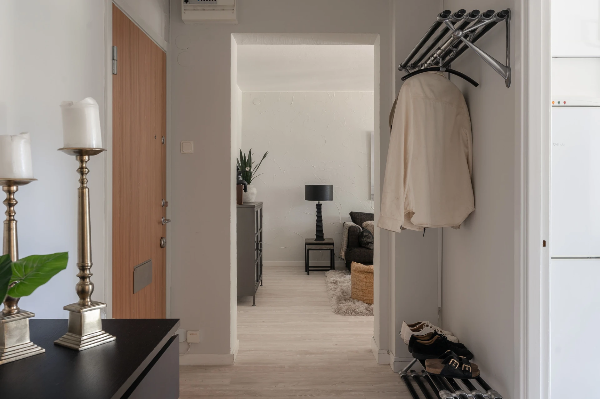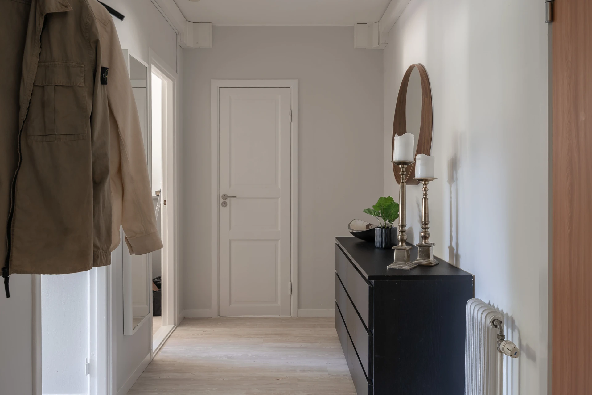 Ljust laminatgolv och vit väggfärg med förvaringsmöjligheter.