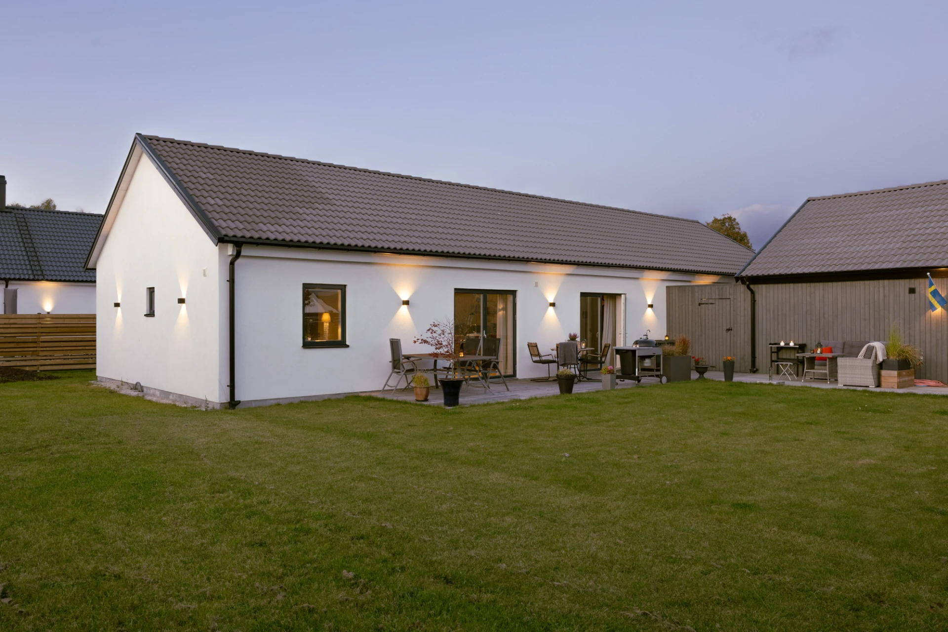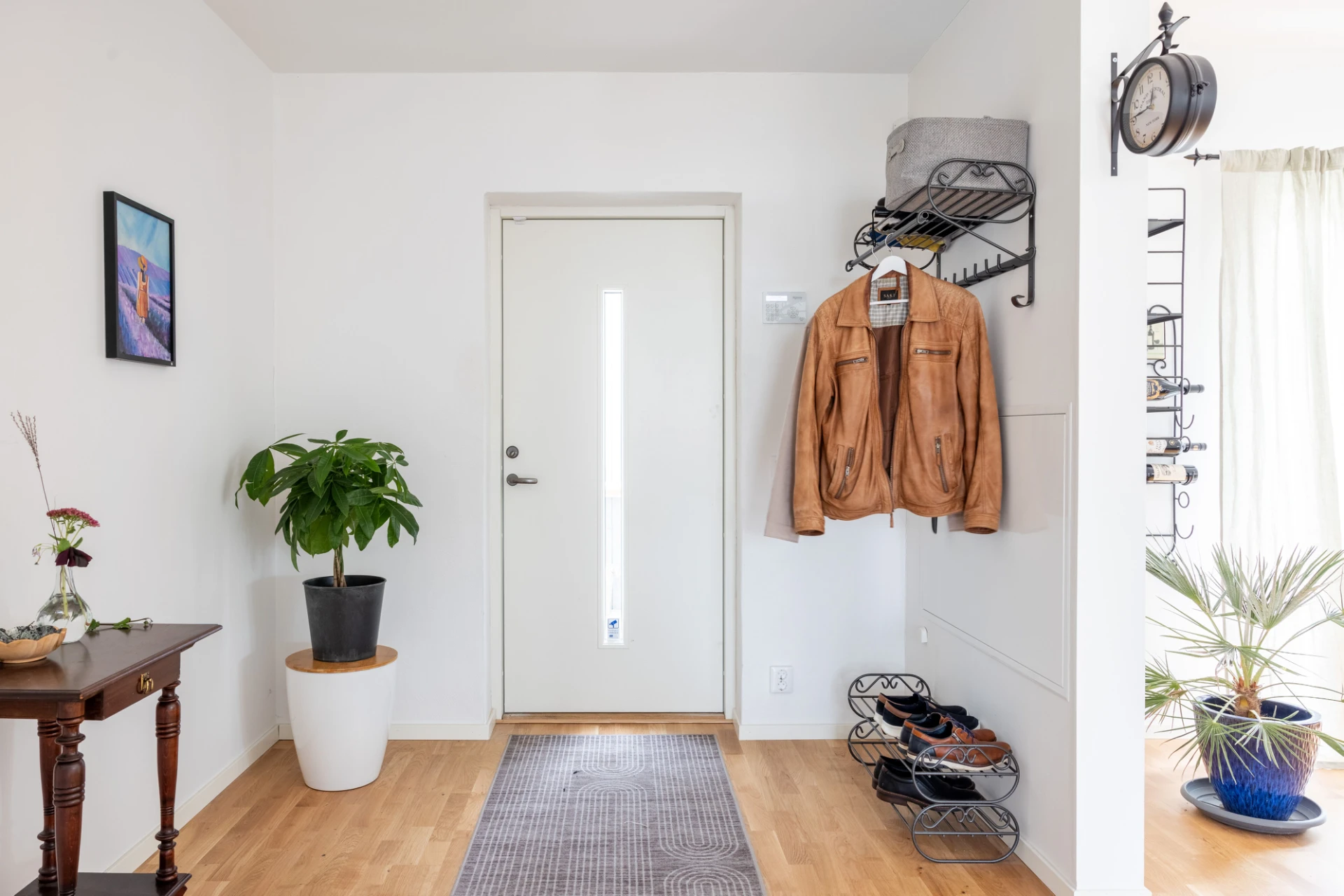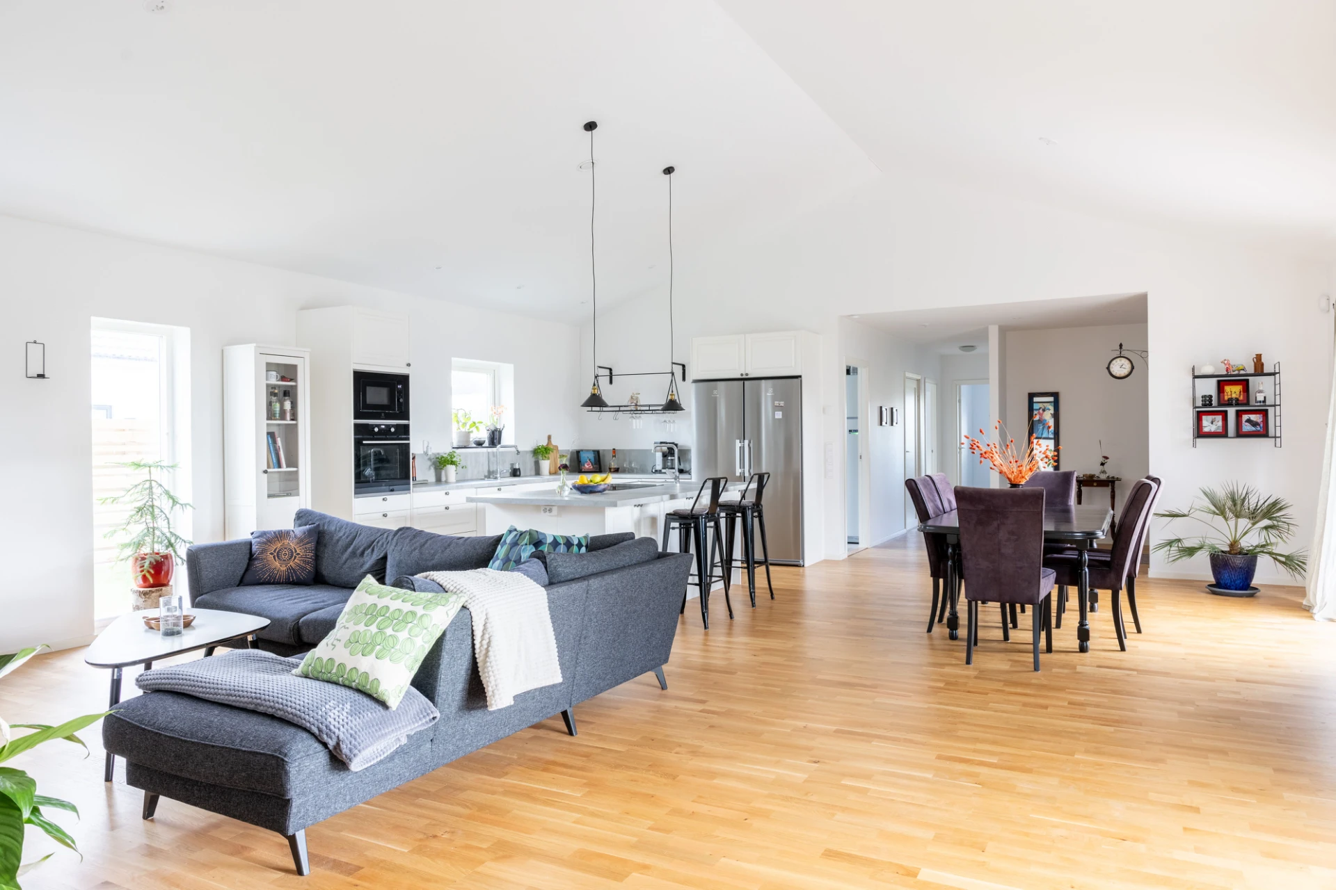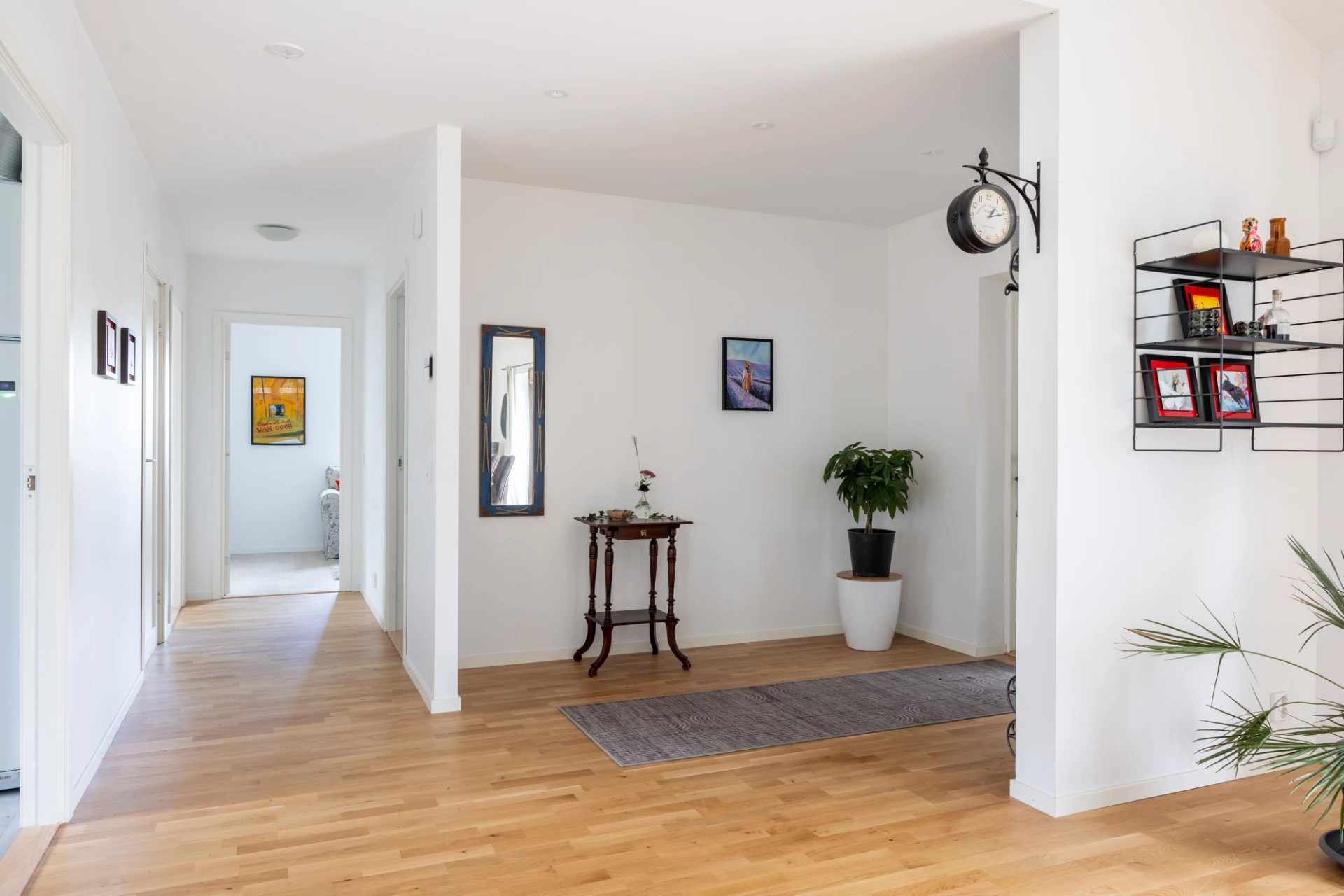 Ekparkett med vita väggar. Utgång till uteplats och trädgården.