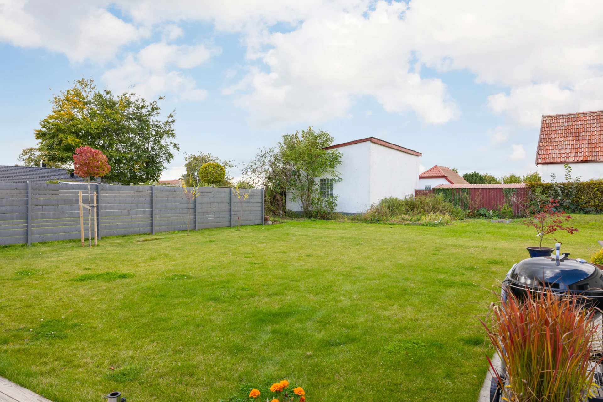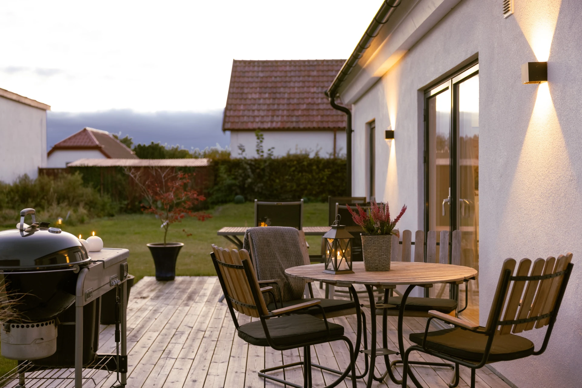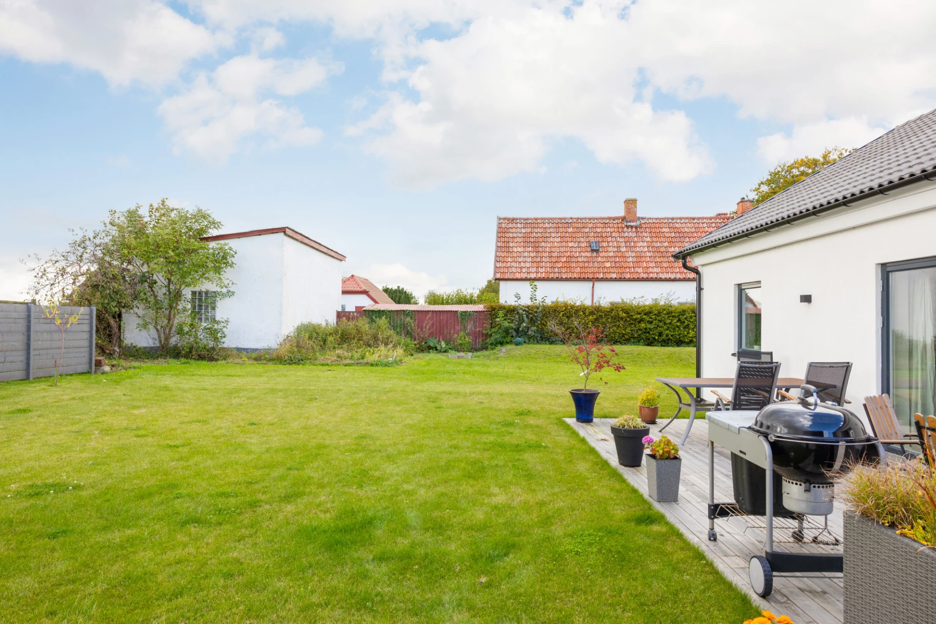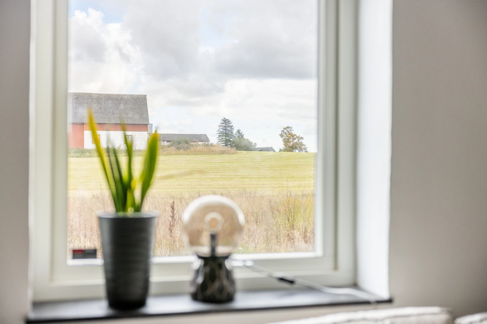Ekparkett med vita väggar. Utgång till uteplats och trädgården.