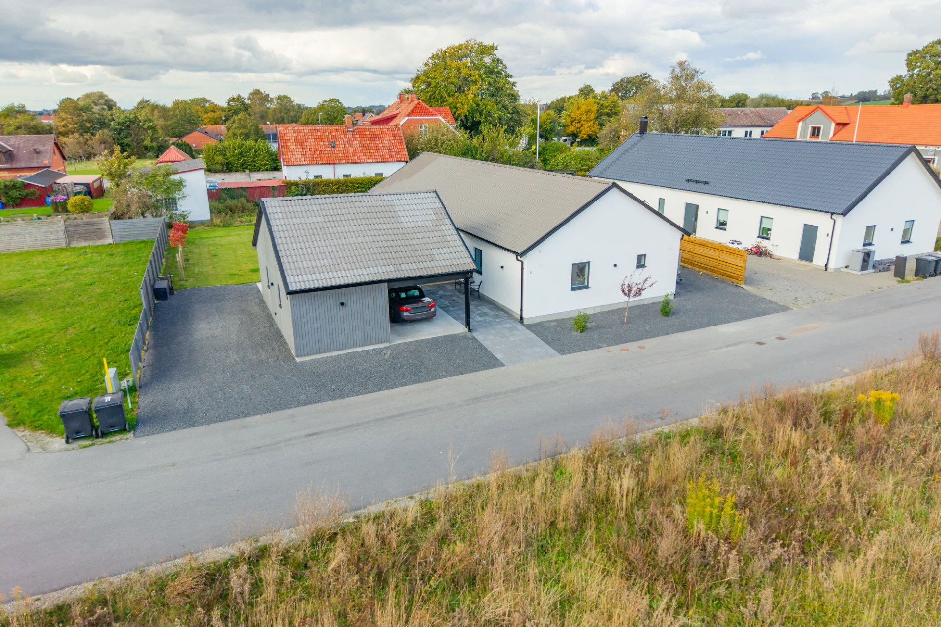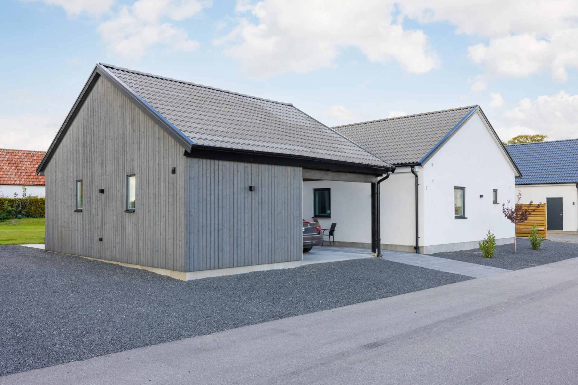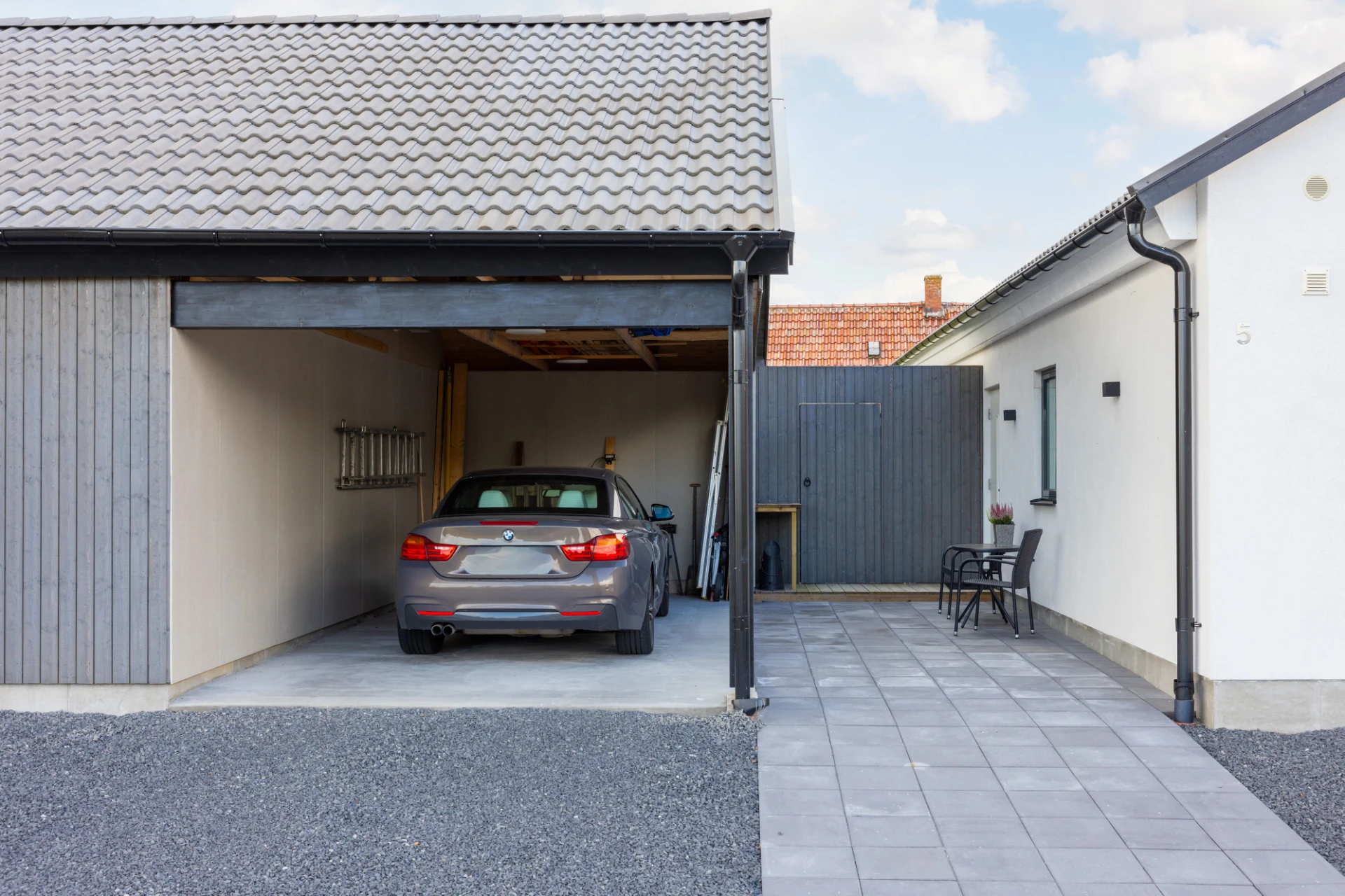 Stor carport och förråd med mycket förvaring målat i tjärvitriol.