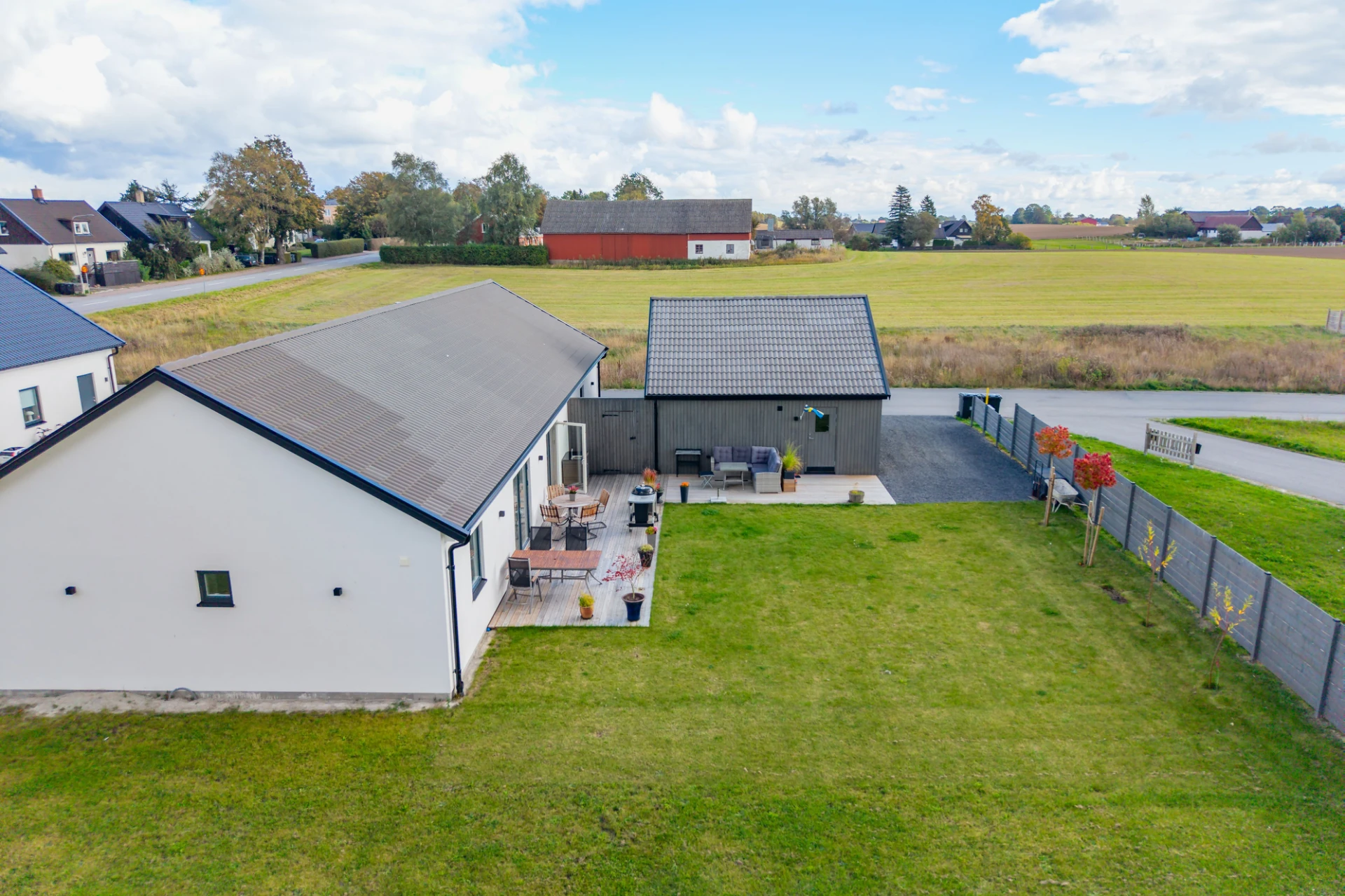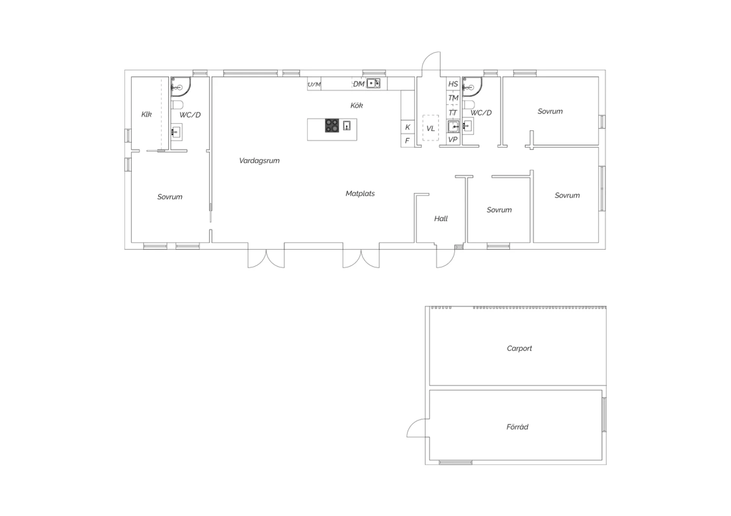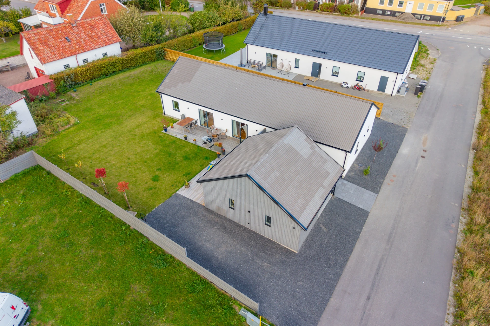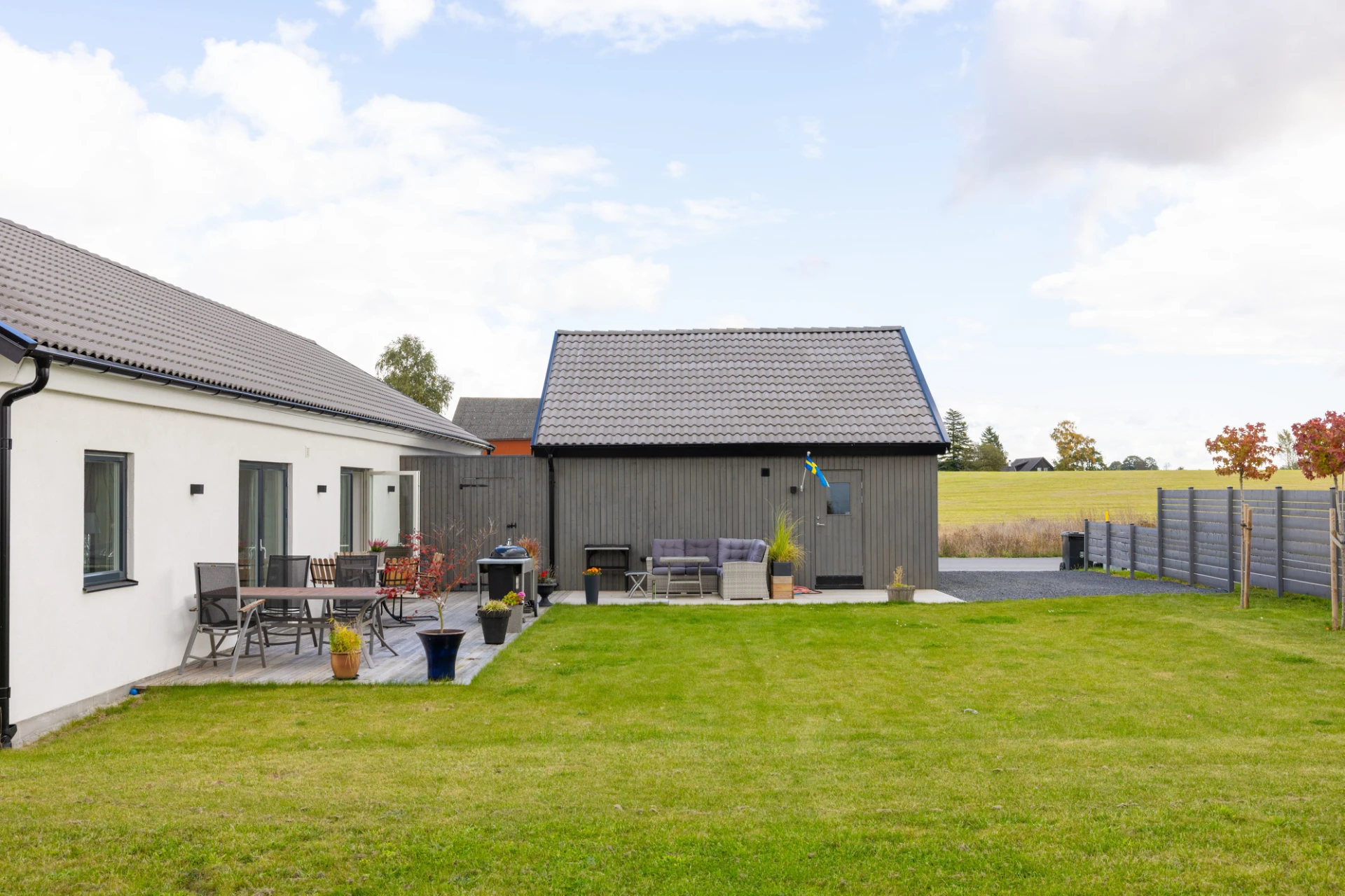 Stor carport och förråd med mycket förvaring målat i tjärvitriol.