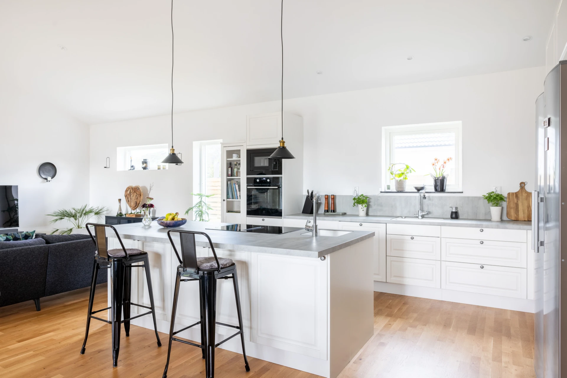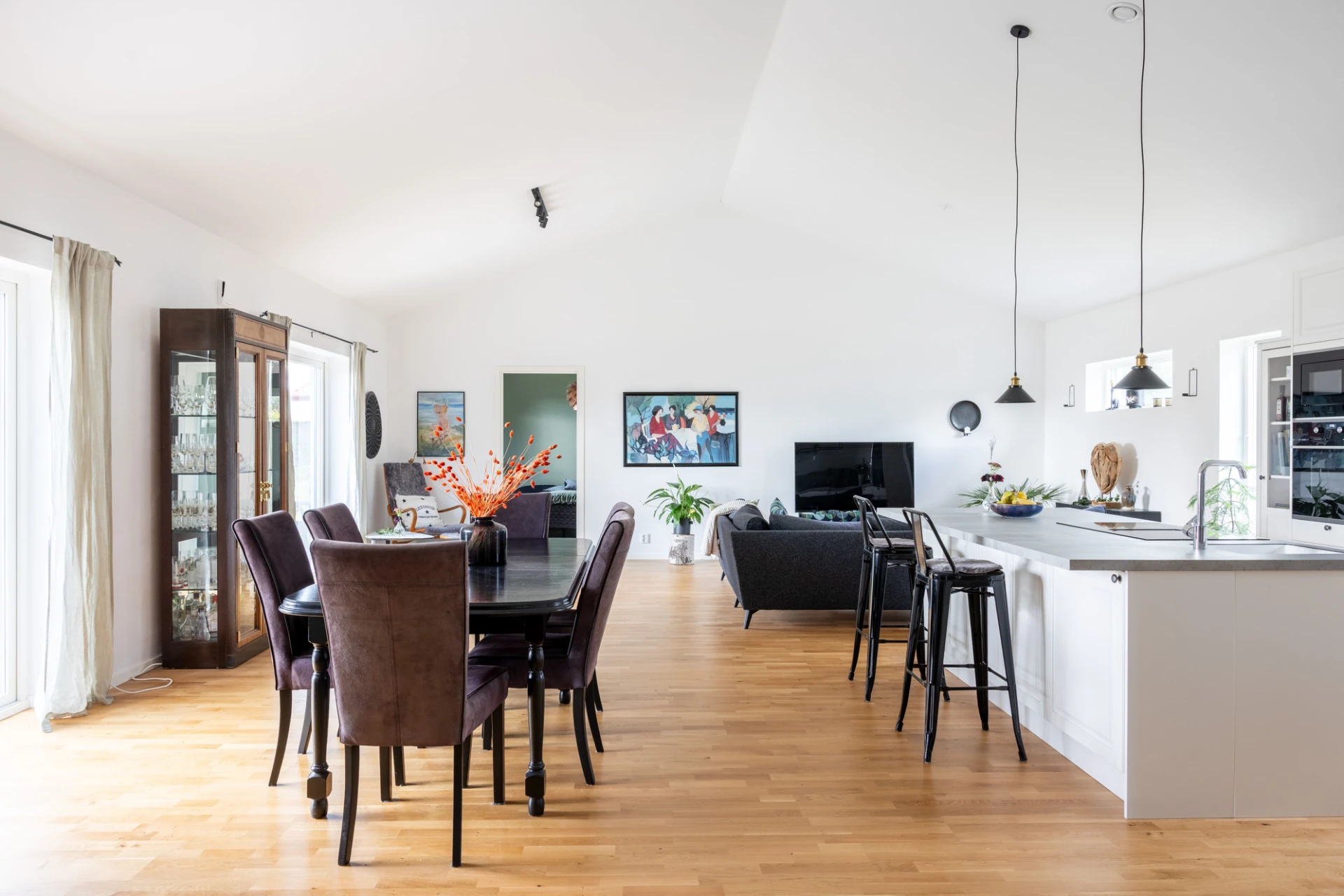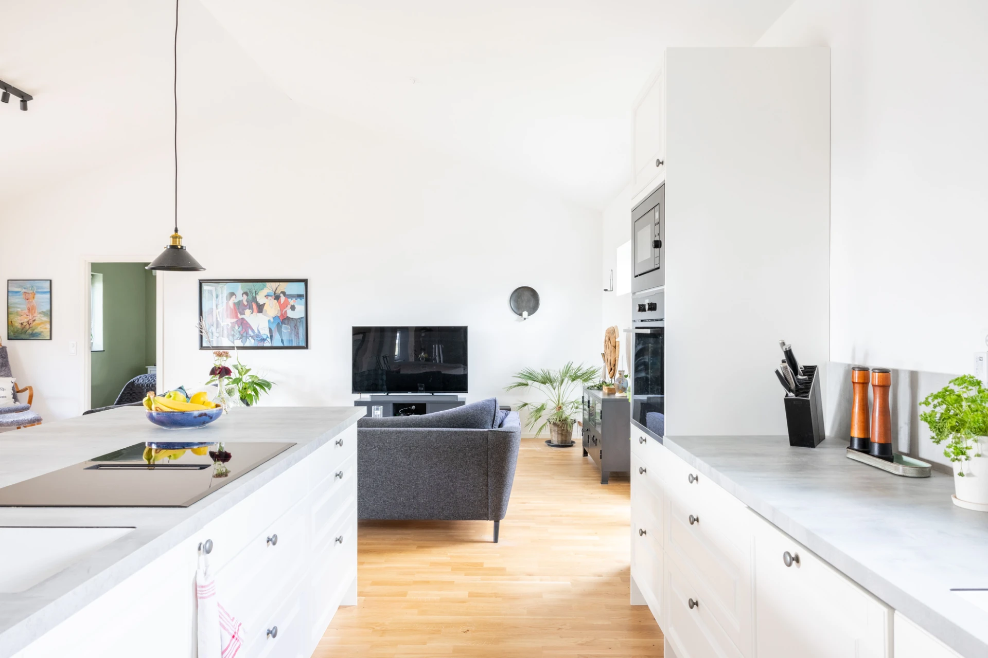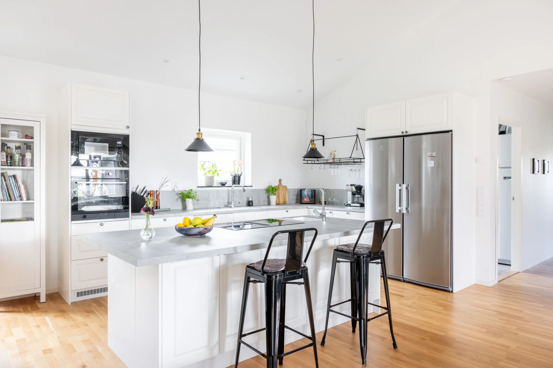 Ekparkett med vita väggar. Köksinredning i vita luckor med grå bänkskiva och stänkskydd samt en stor köksö. Utrustad med induktionshäll med inbyggd fläkt, två vaskar, ugn, mikrovågsugn, integrerad diskmaskin, kyl och frys. Här finns även matplats för stora sällskap.