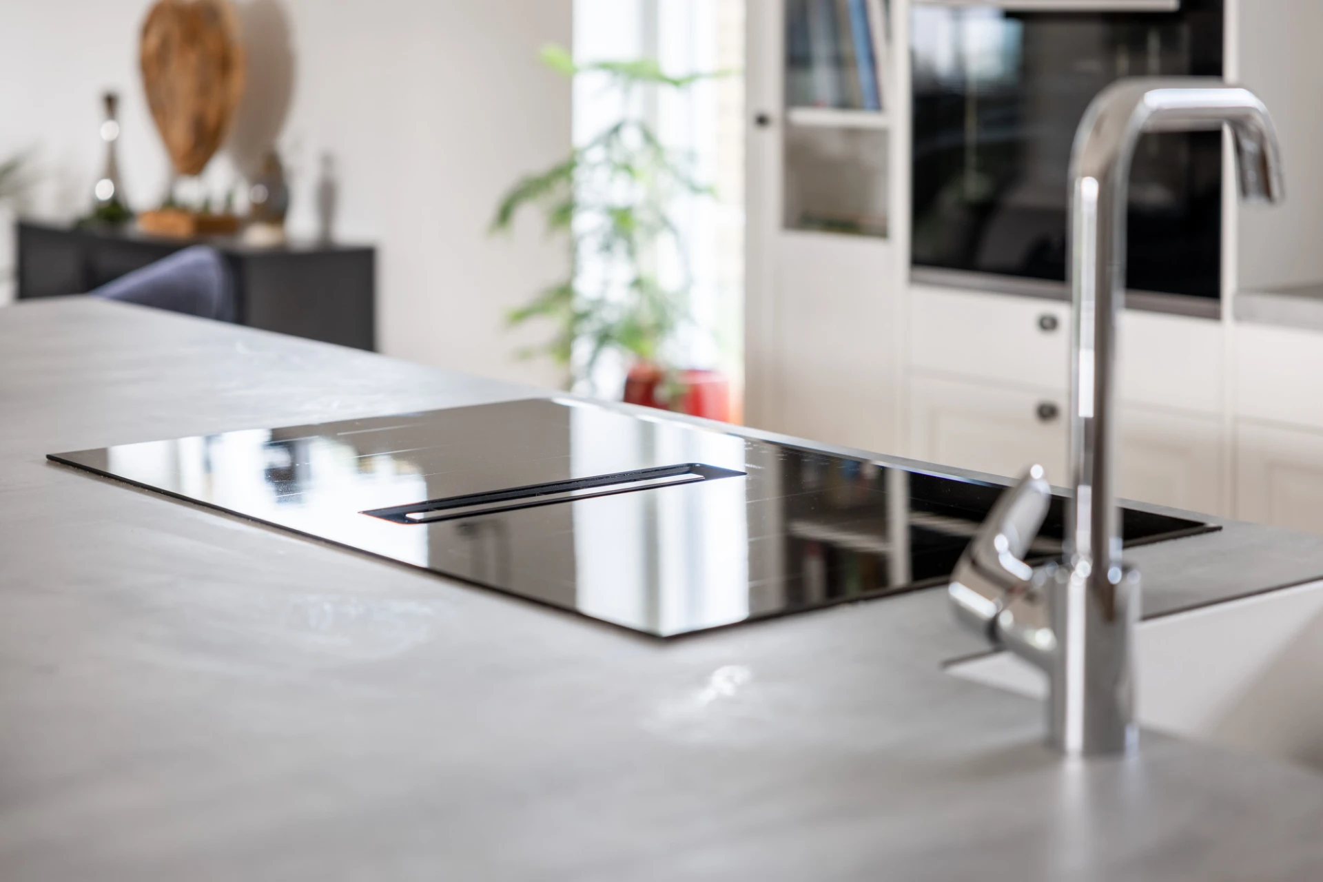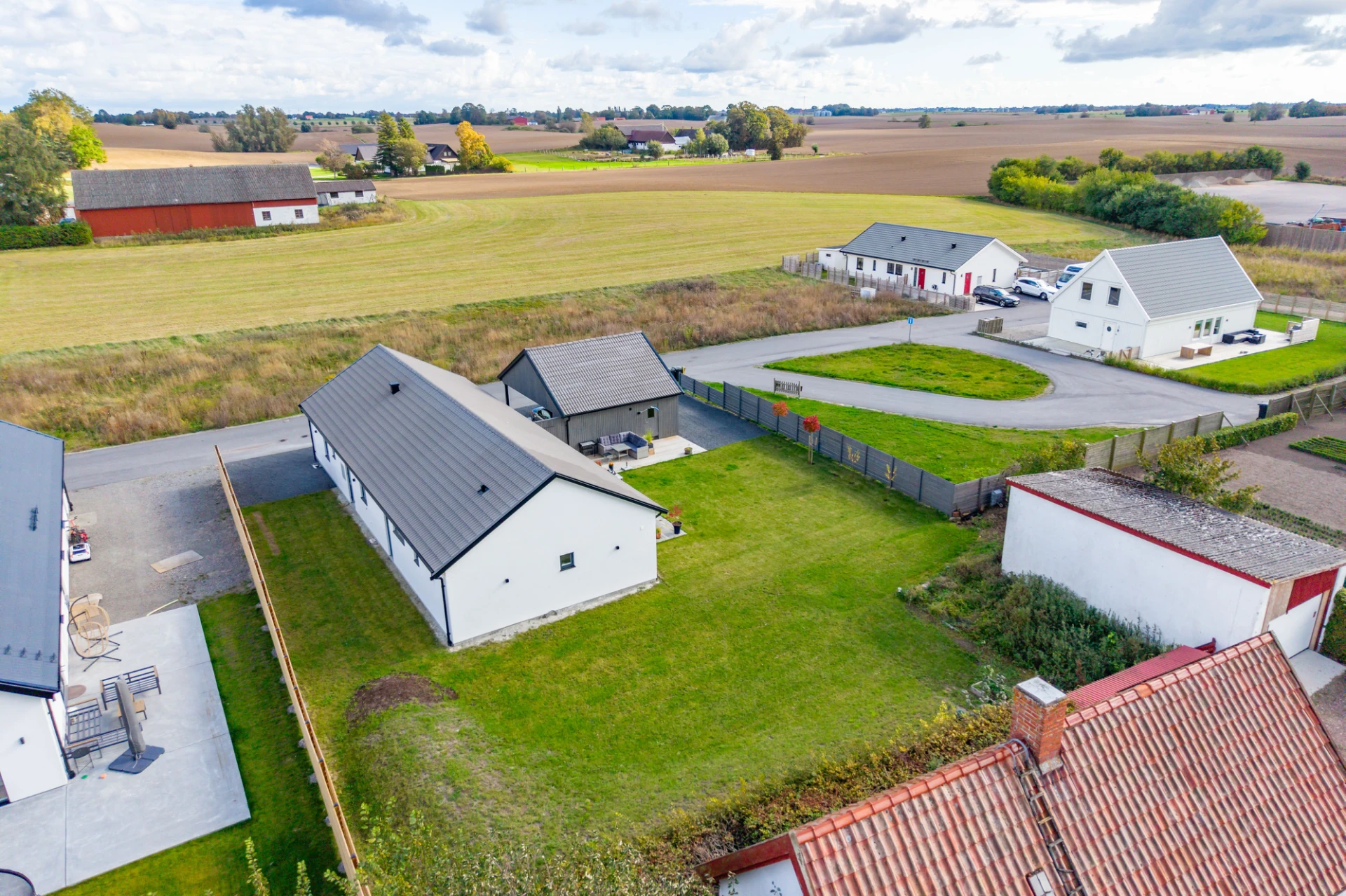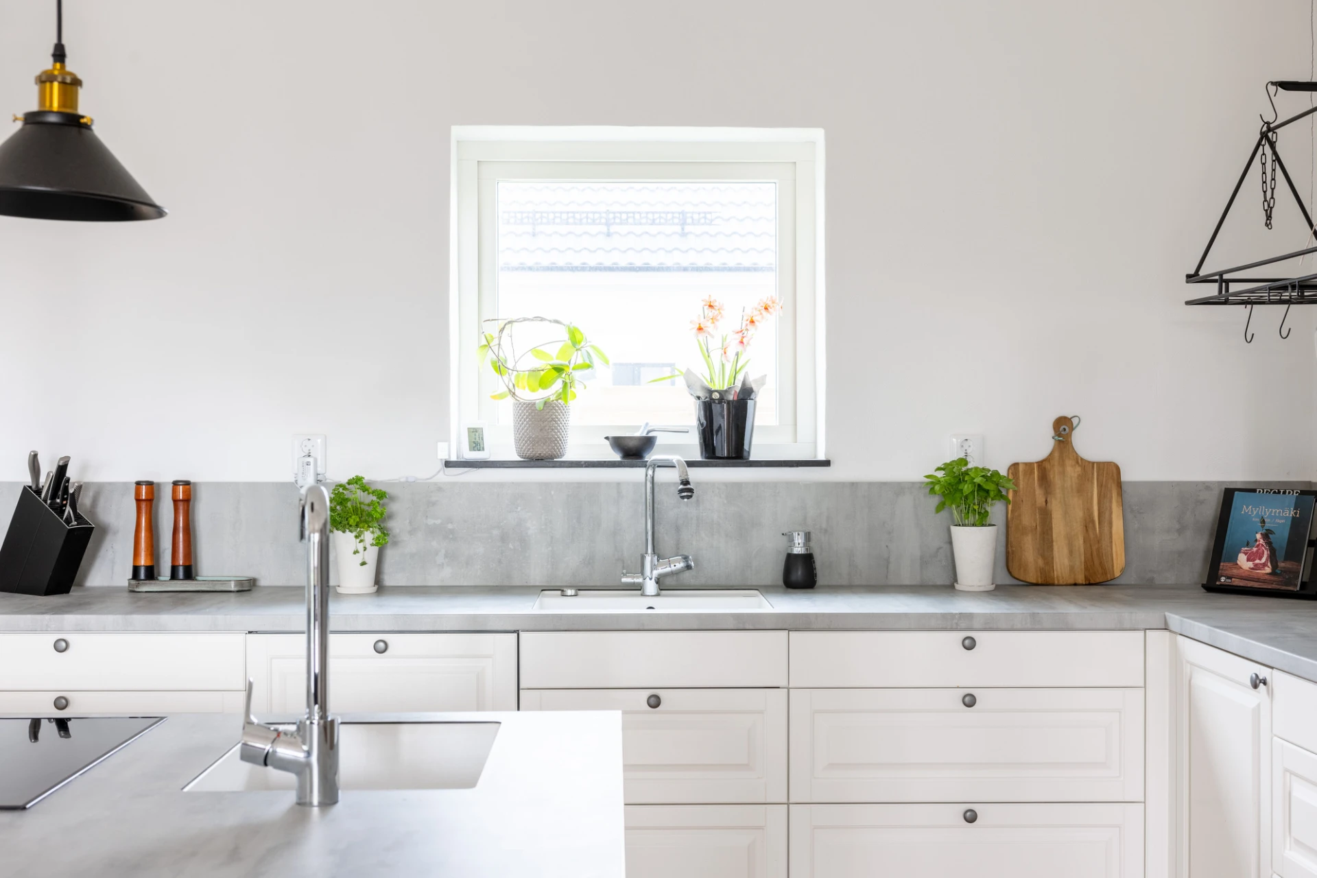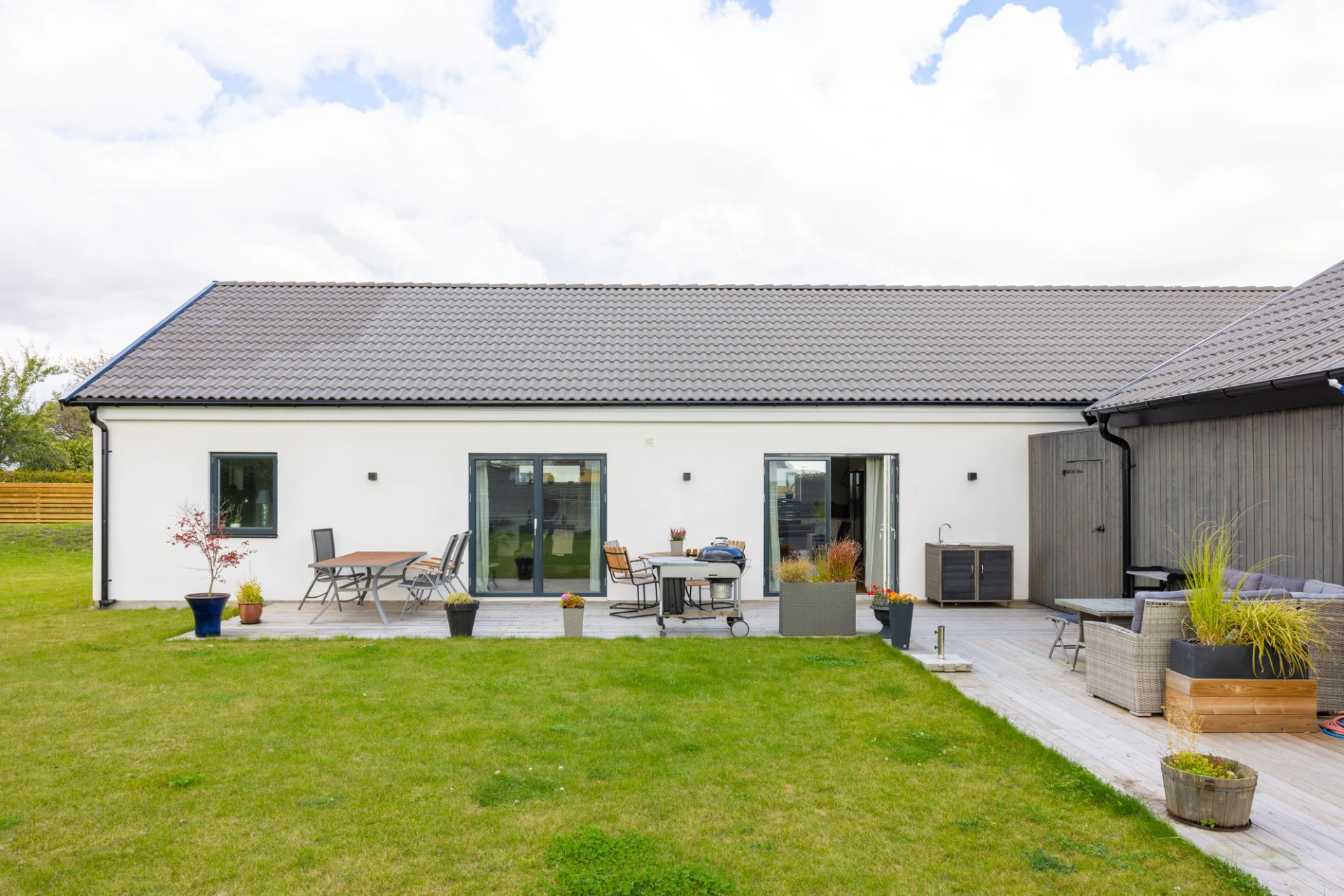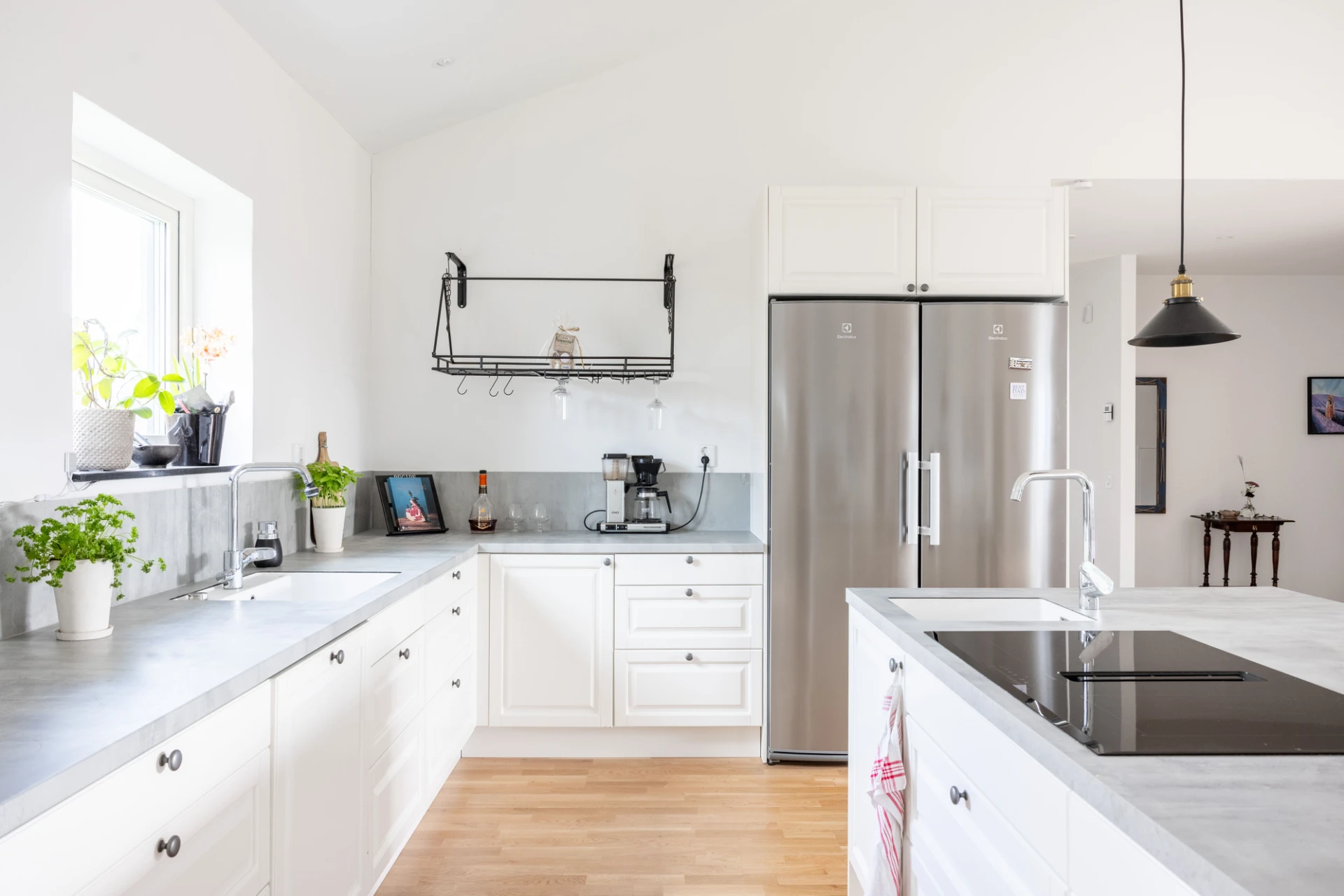 Ekparkett med vita väggar. Köksinredning i vita luckor med grå bänkskiva och stänkskydd samt en stor köksö. Utrustad med induktionshäll med inbyggd fläkt, två vaskar, ugn, mikrovågsugn, integrerad diskmaskin, kyl och frys. Här finns även matplats för stora sällskap.