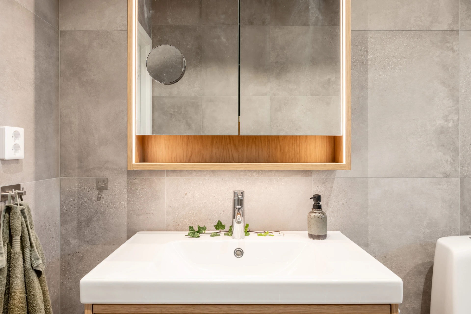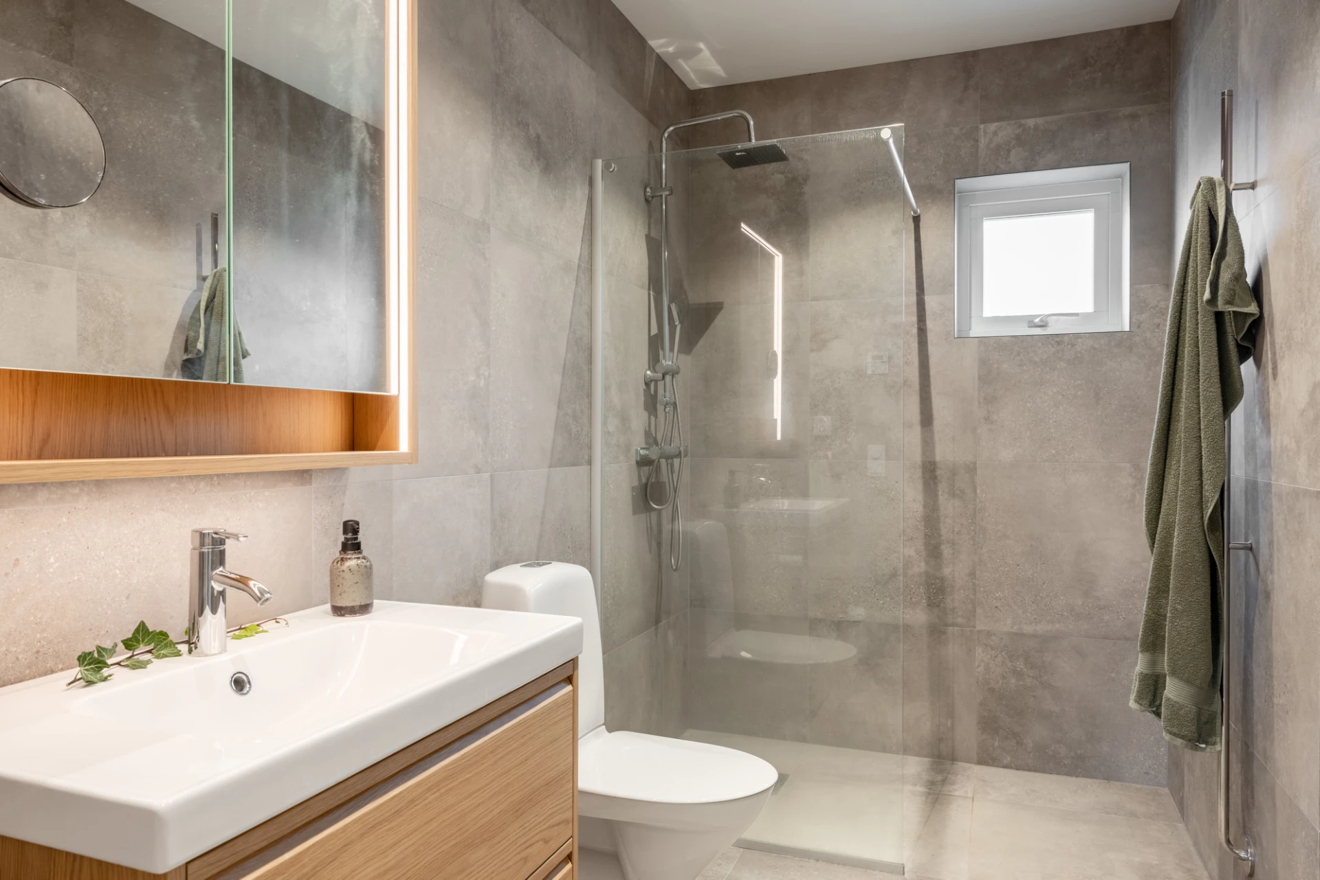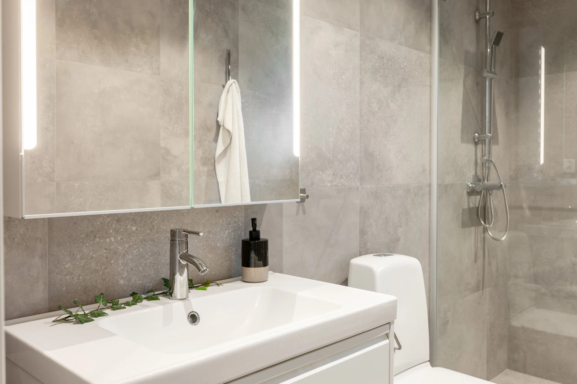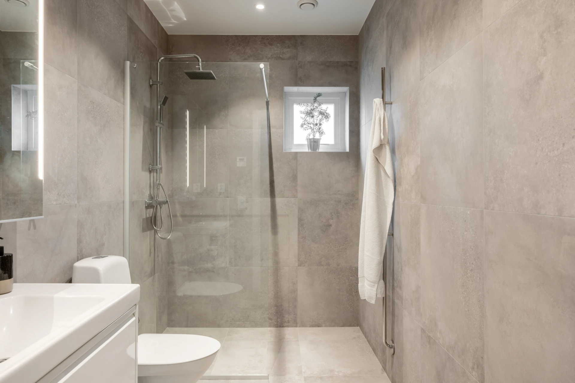 Helklaklat badrum i grå stora kakelplattor. Badrummet är utrustad med dusch med glasvägg, wc, handfat med kommod, handdukstork och spegelskåp med belysning.