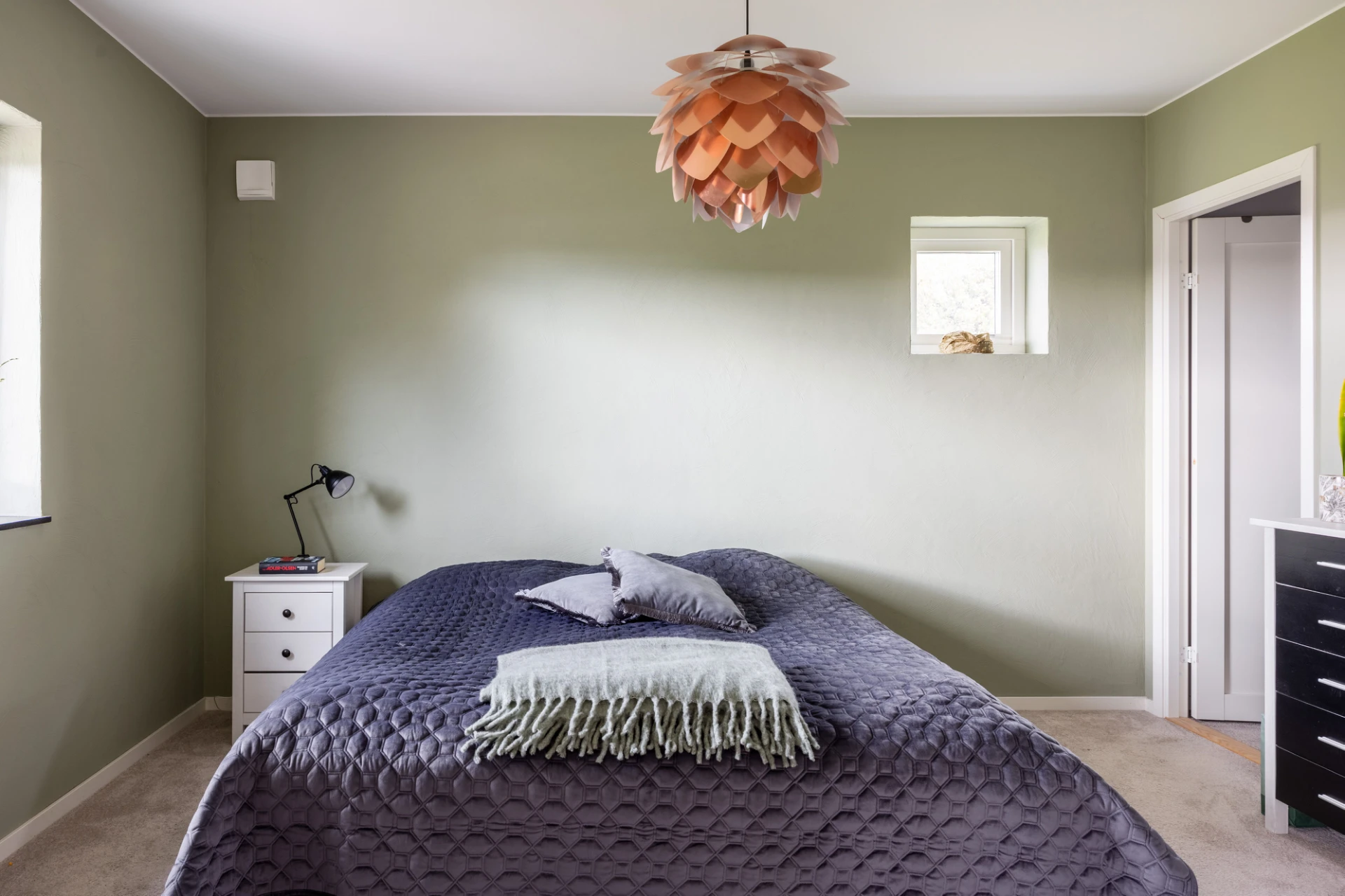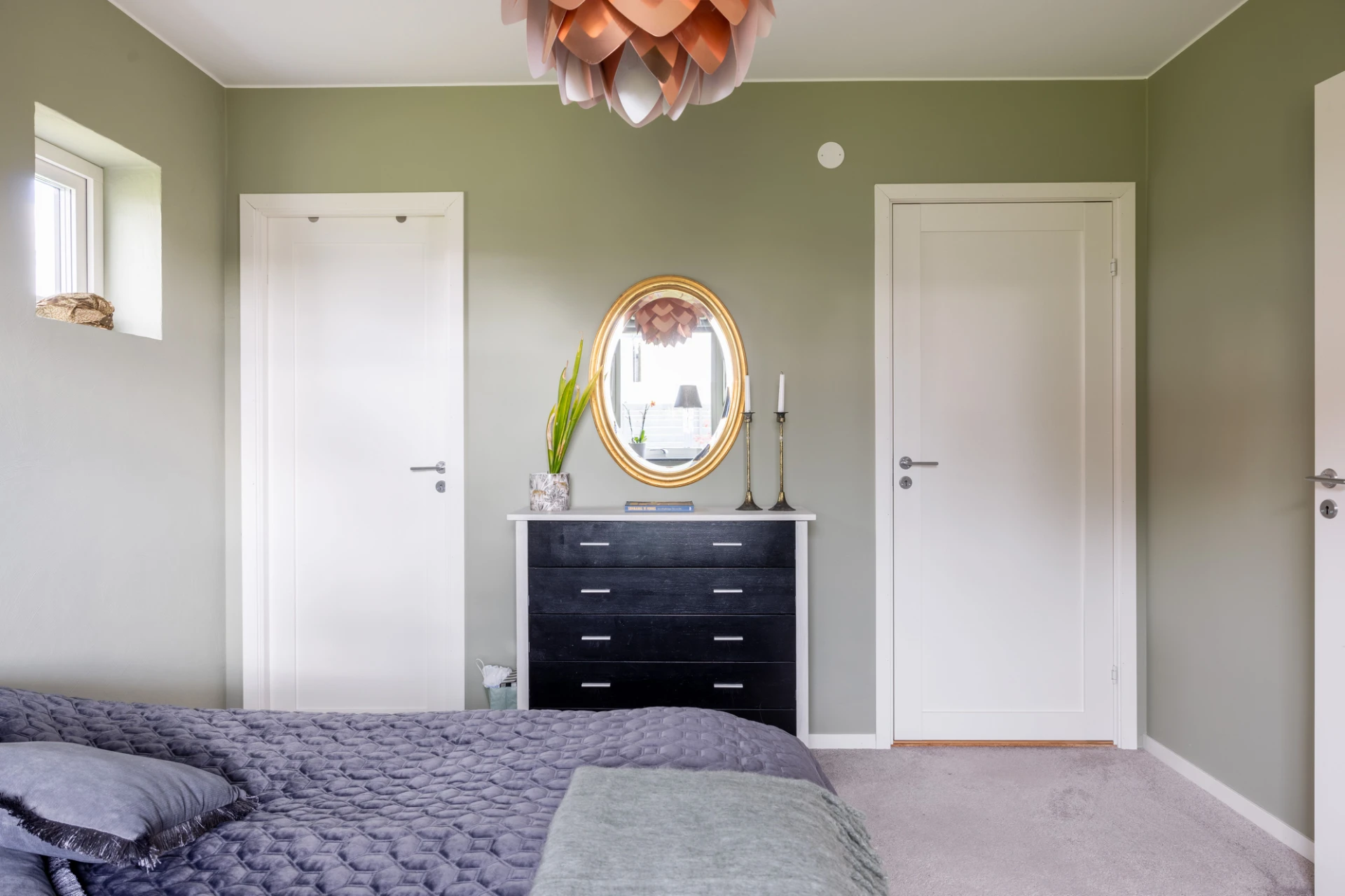 Heltäckningsmatta och ljusgröna väggar. Vidare finns en stor klädkammare och badrum.