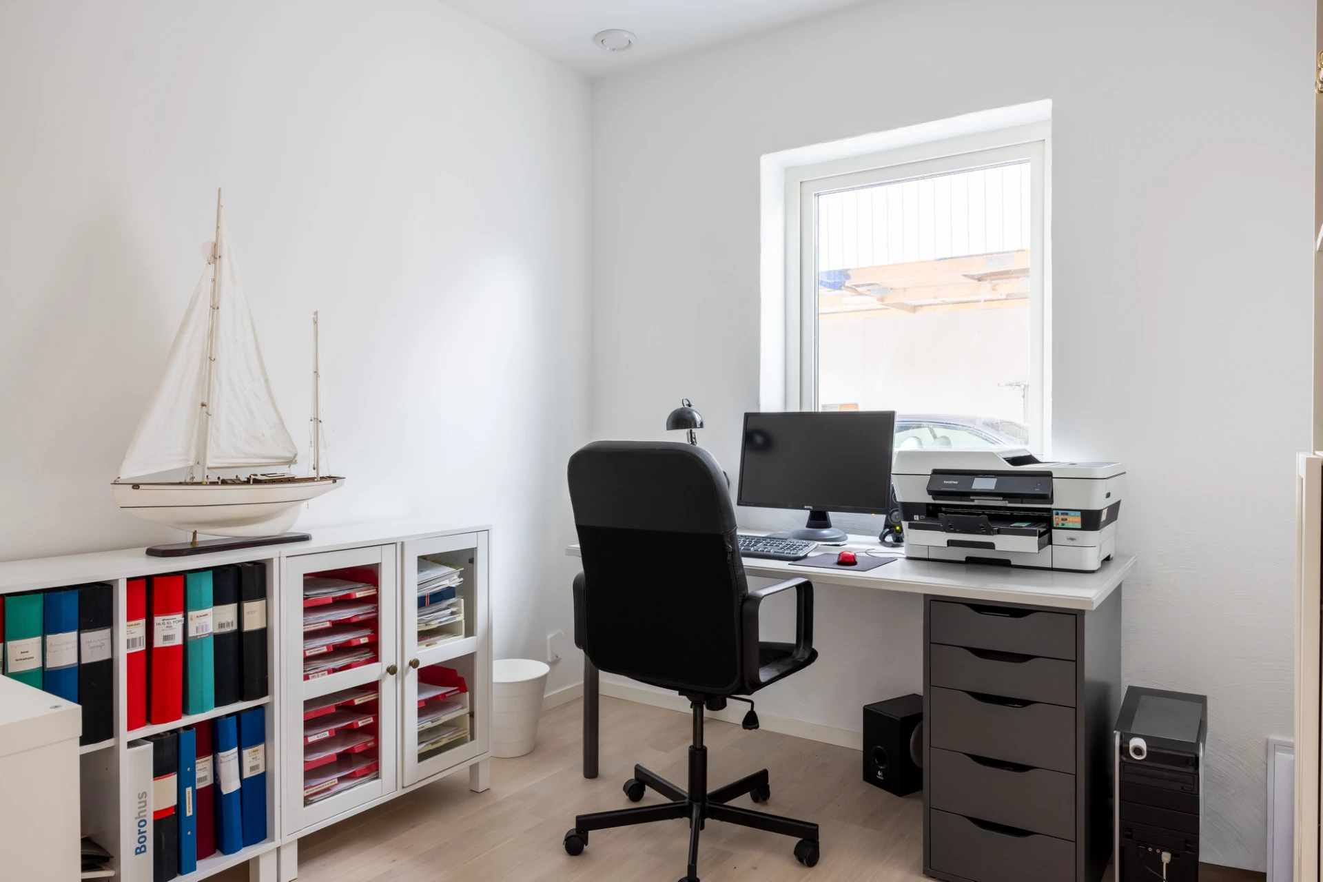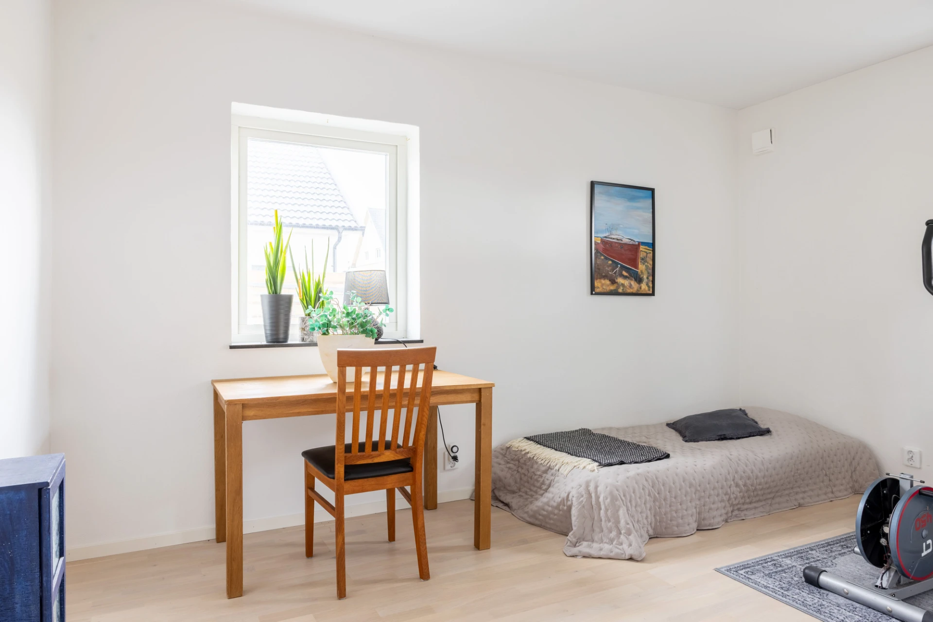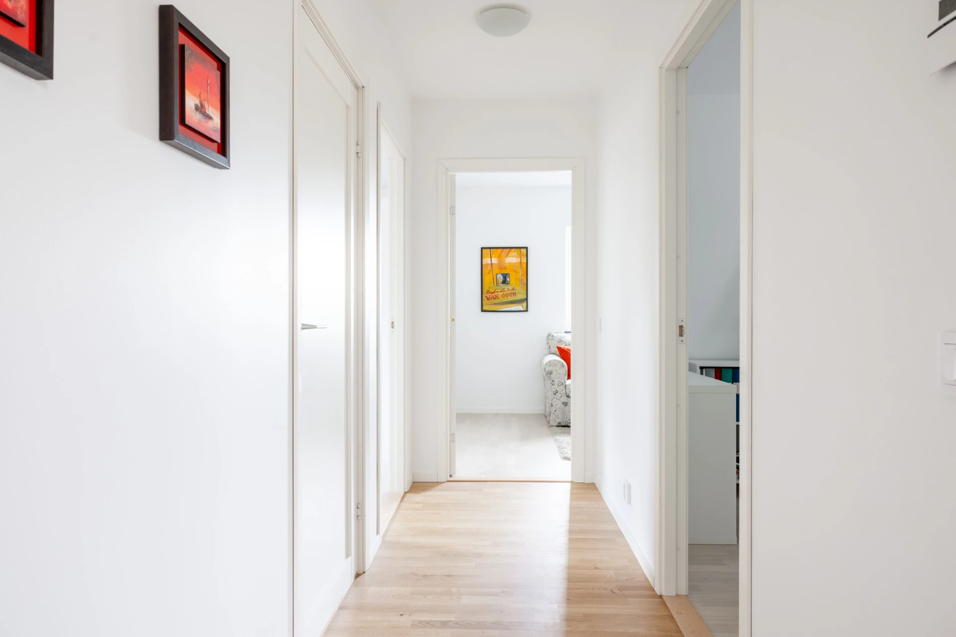 Vitpigmenterat ekgolv och vita väggar. Med plats för garderober.