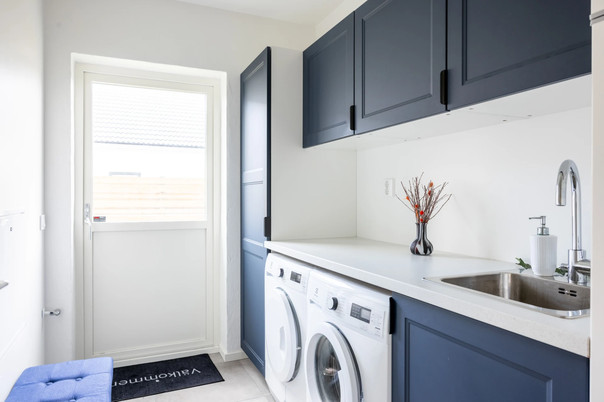 Grå klinkerplattor och vita väggar. Blå inredning utrustad med tvättmaskin, torktumlare och vask. Utgång till trädgården.
