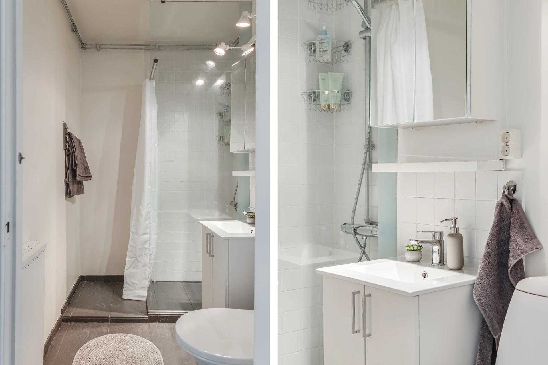 Grå klinker och vitt kakel. Badrummet är utrustat med wc, dusch med duschvägg, handfat med kommod, spegelskåp.