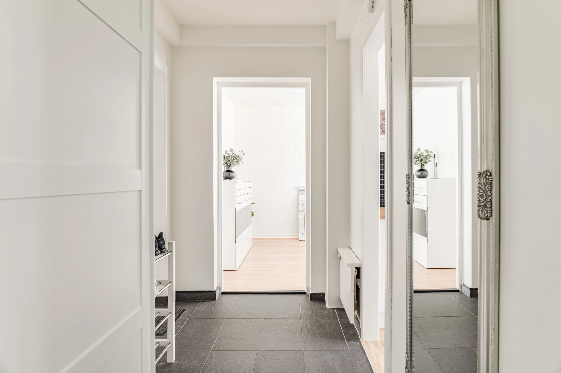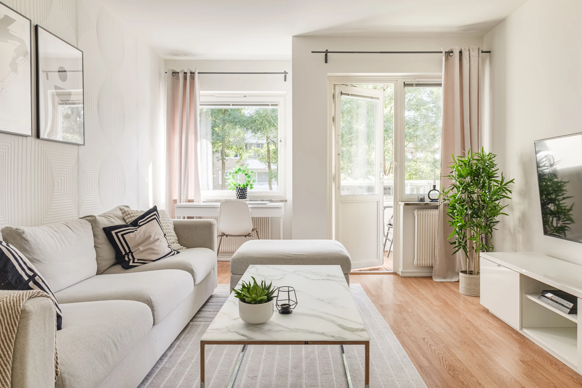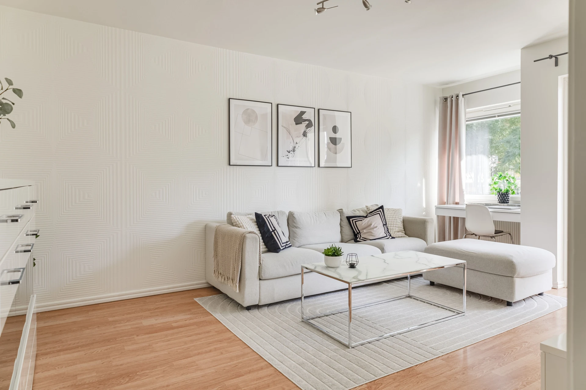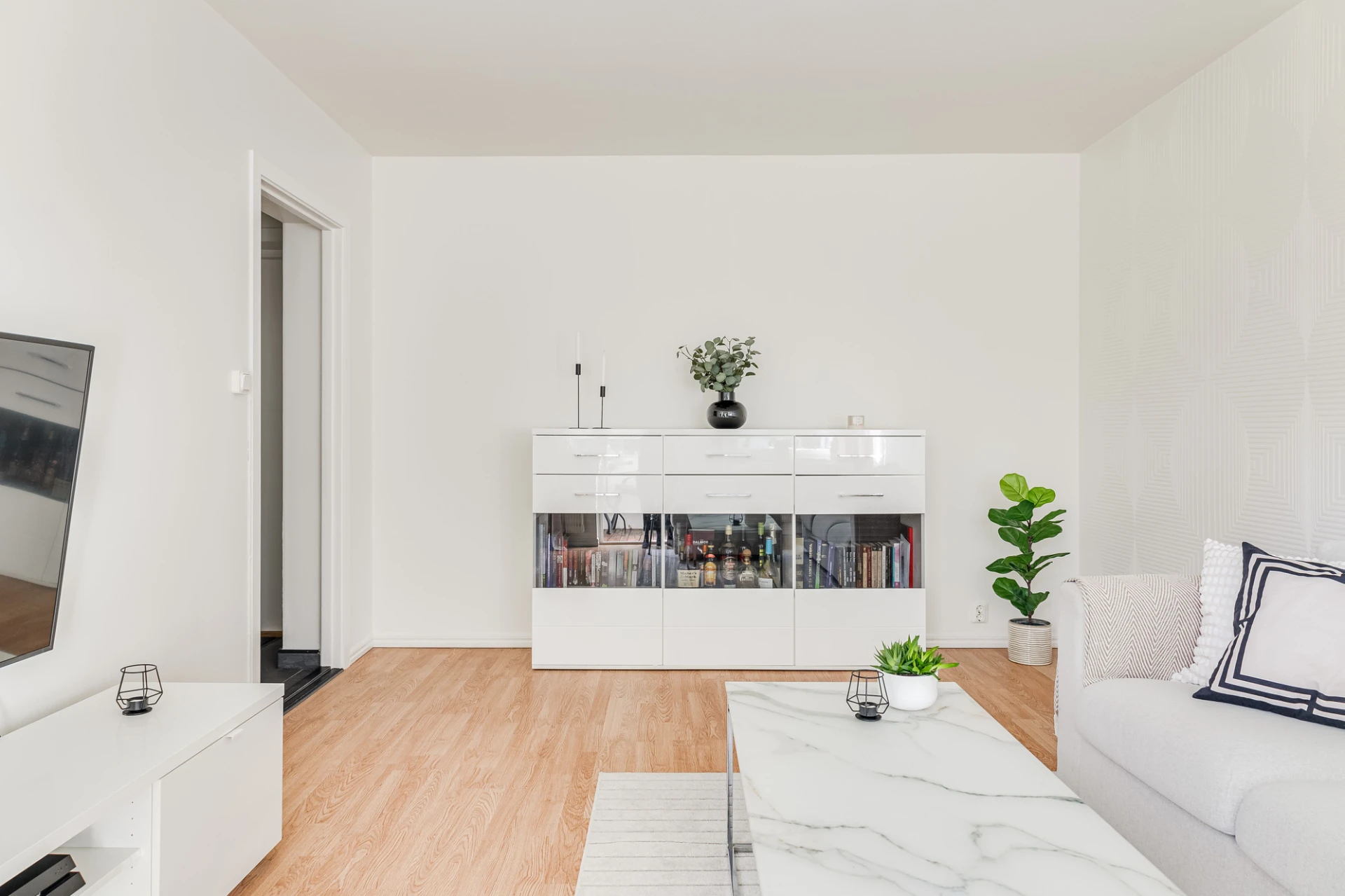 Laminatgolv och vita väggar. I vardagsrummet finns utgång till balkong.
