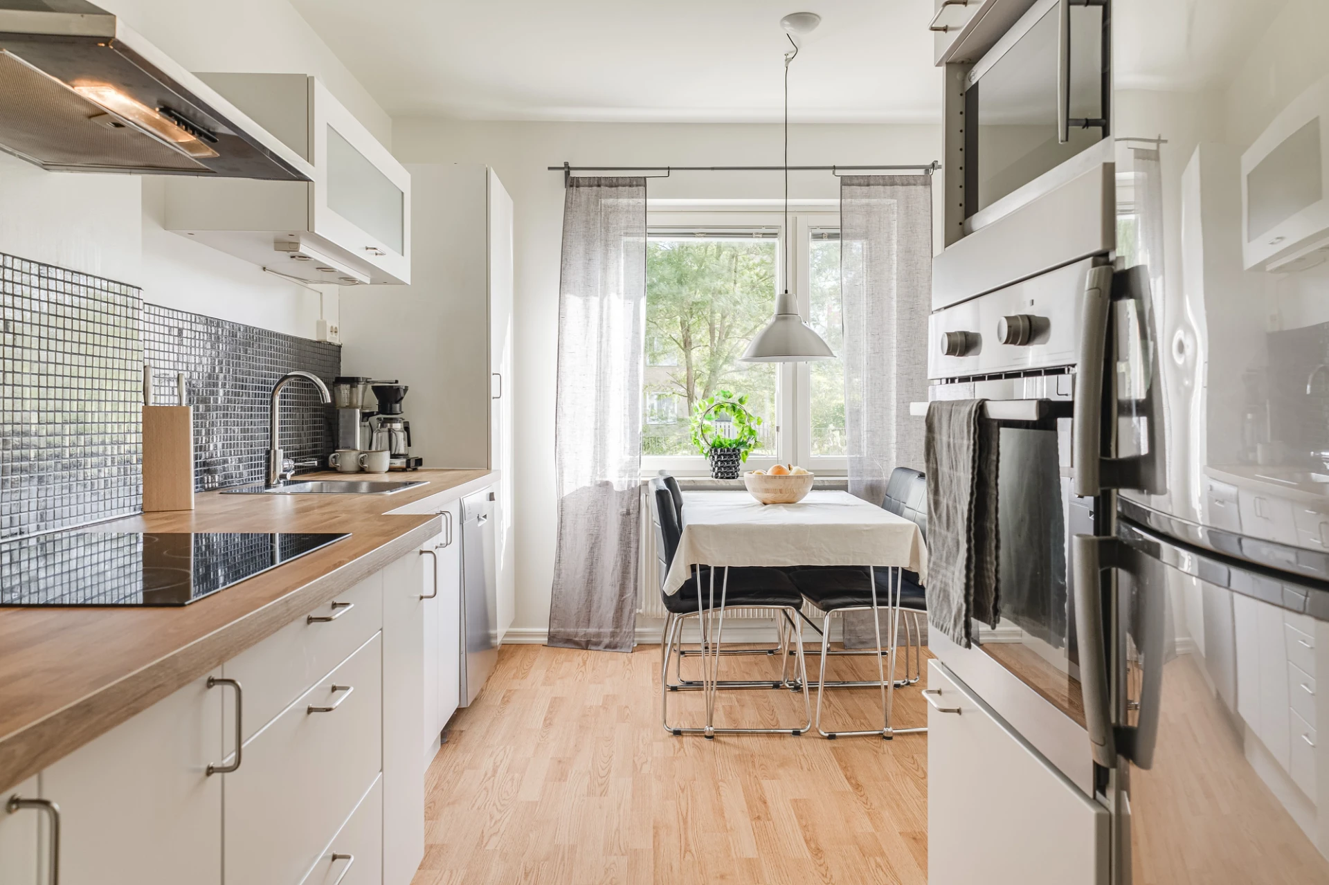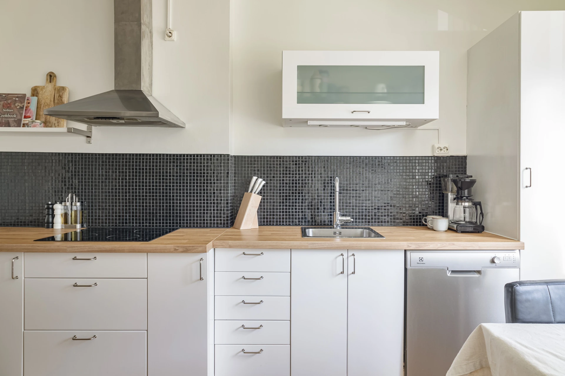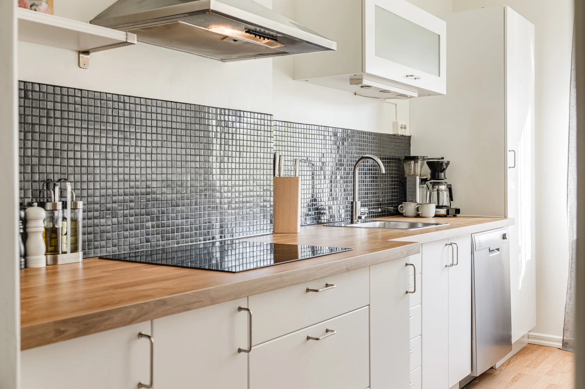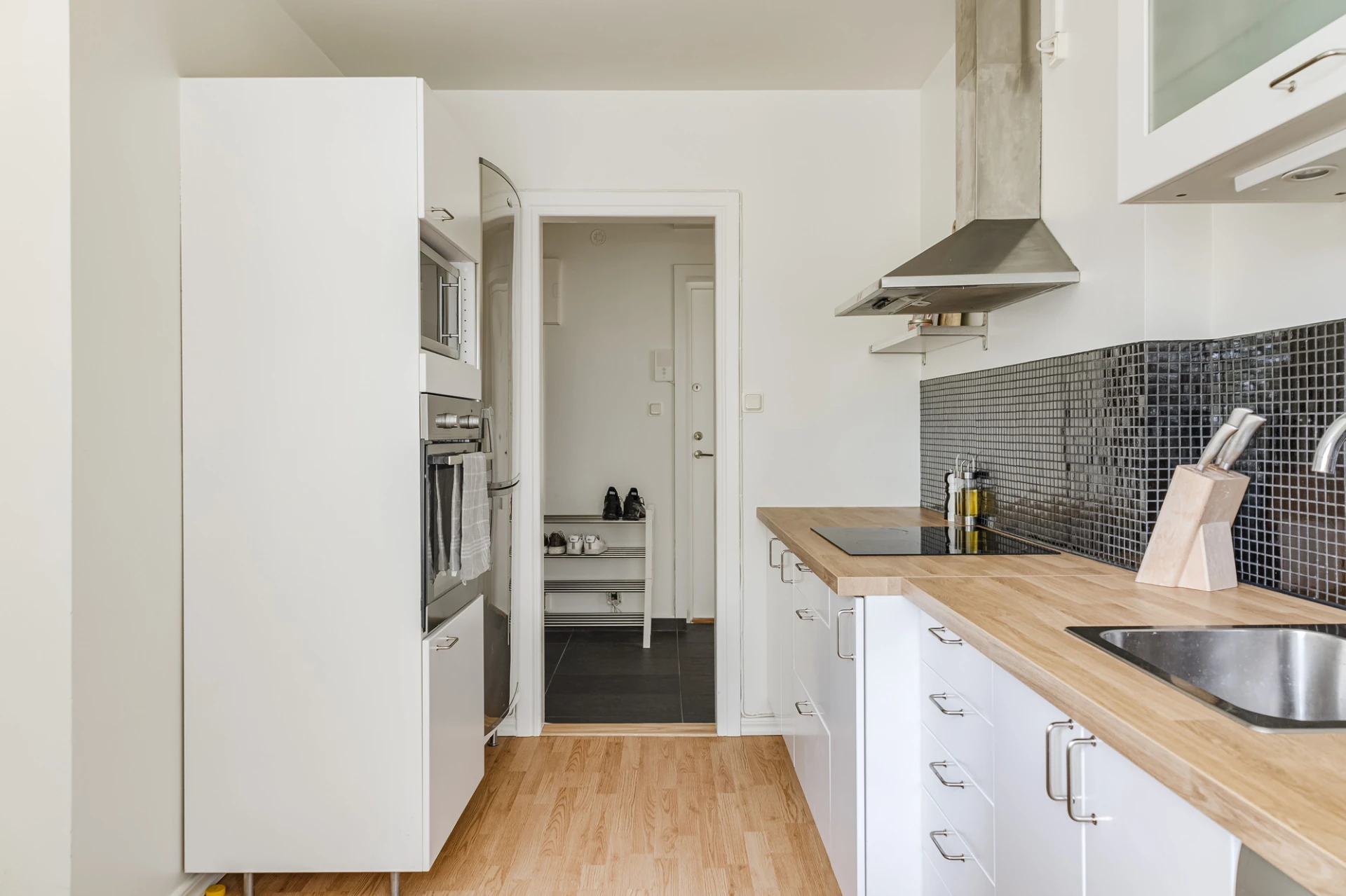 Laminatgolv och vita väggar. Vit köksinredning med mörkt kakel ovanför bänkskiva i trä. Köket är utrustat med ugn, spishäll, diskmaskin, fläkt, kyl och frys.