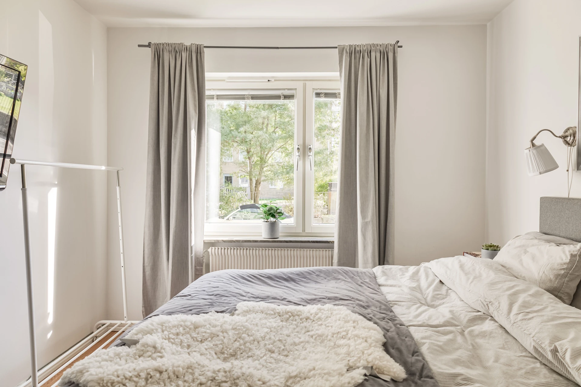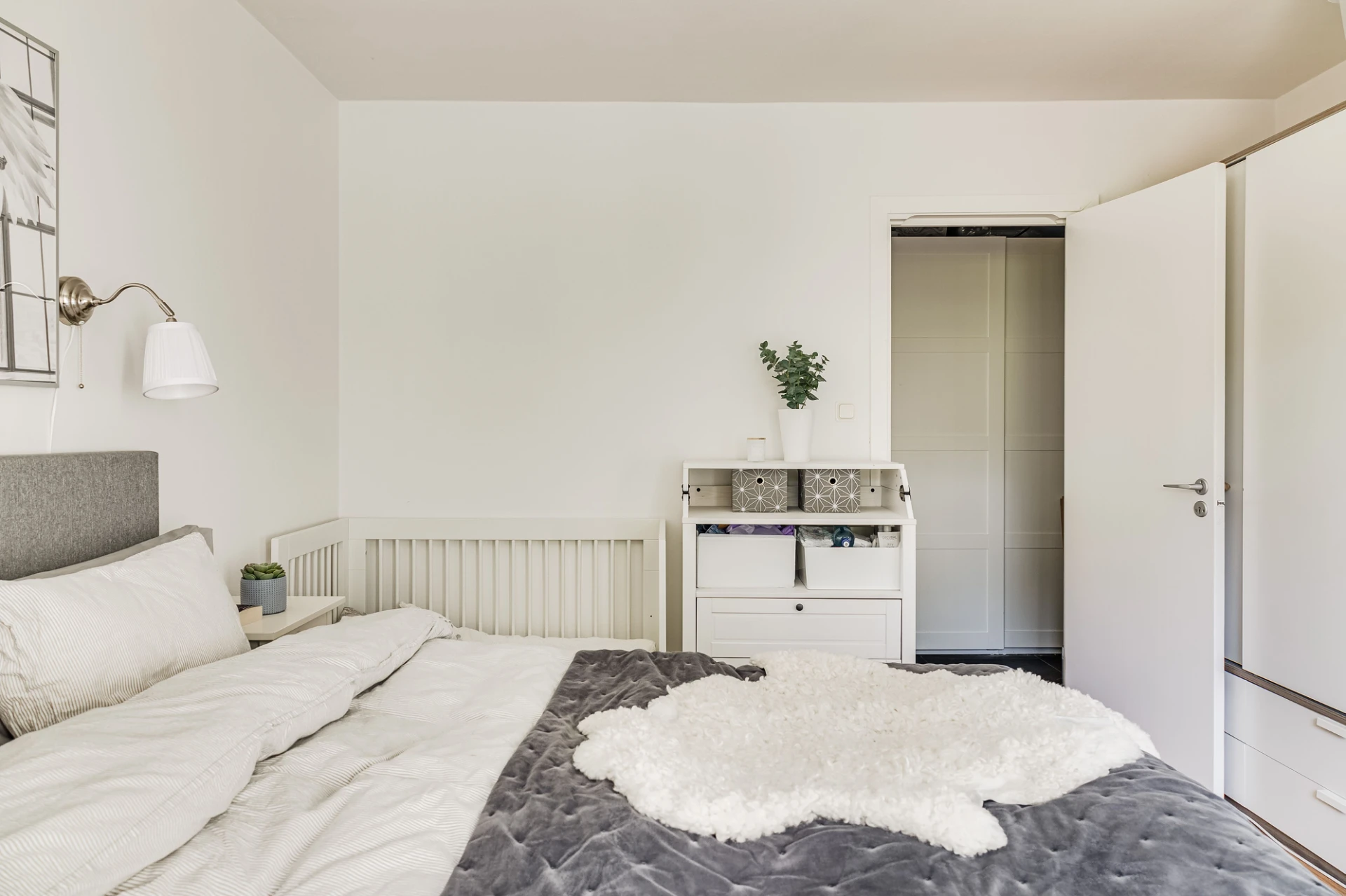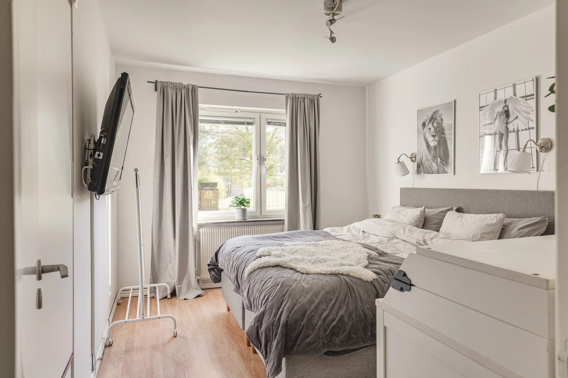 Laminatgolv och vita väggar. I sovrummet finns garderober.