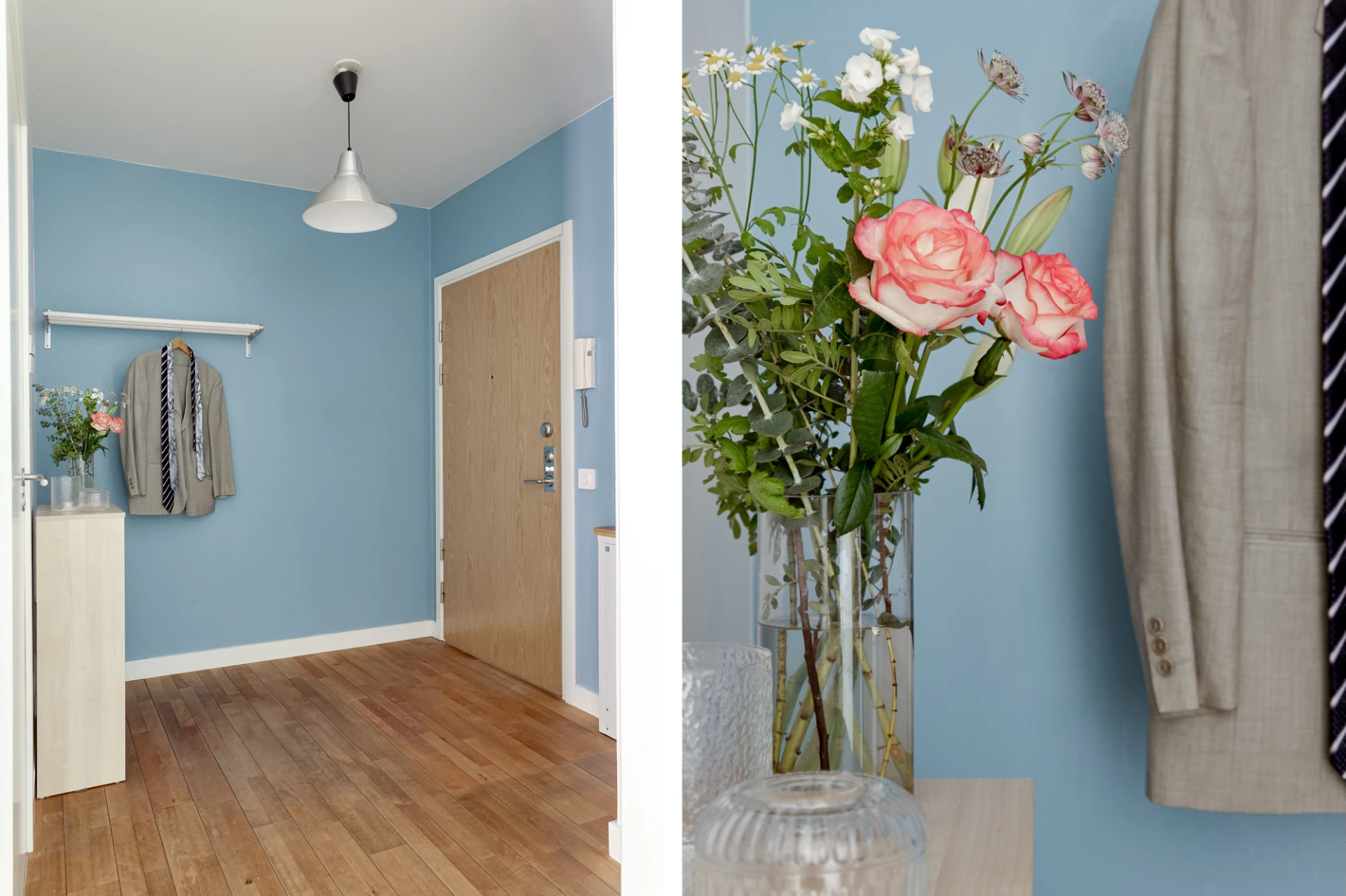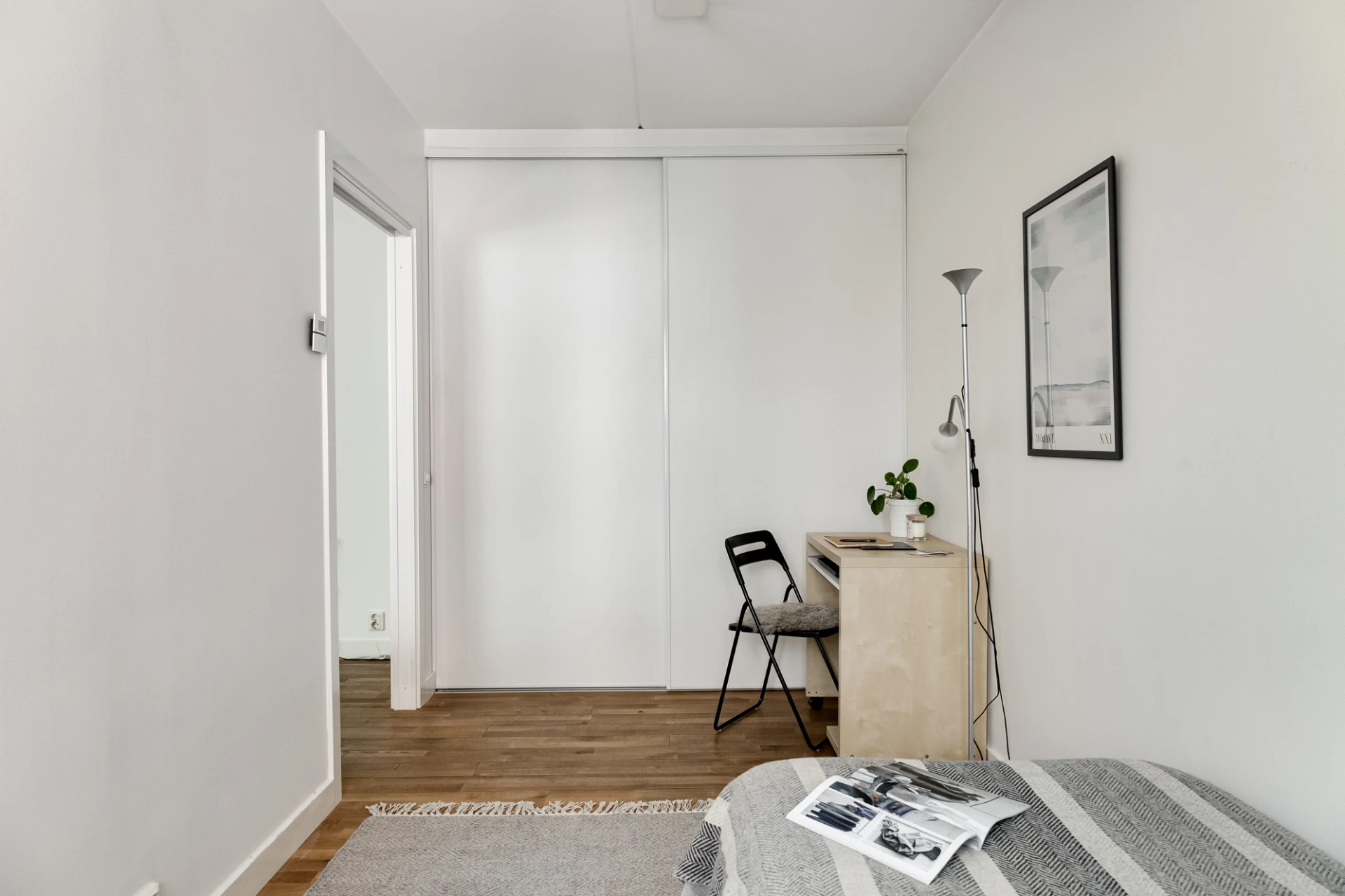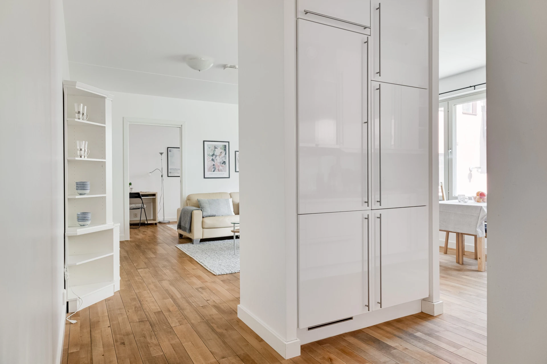 Skeppsgolv och vita väggar. Goda förvaringsmöjligheter i garderober med skjutdörrar.