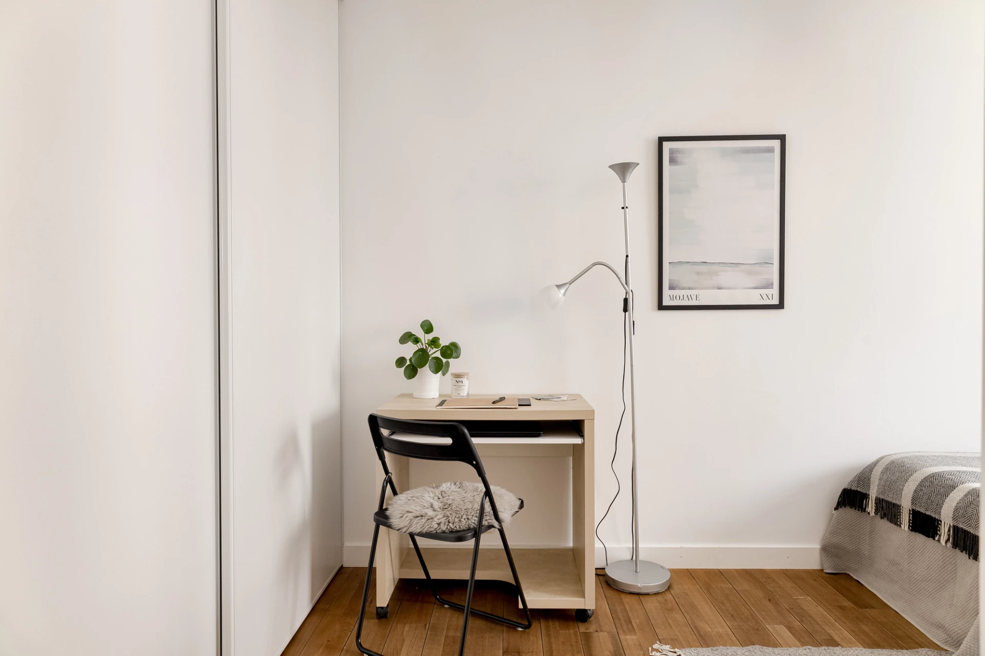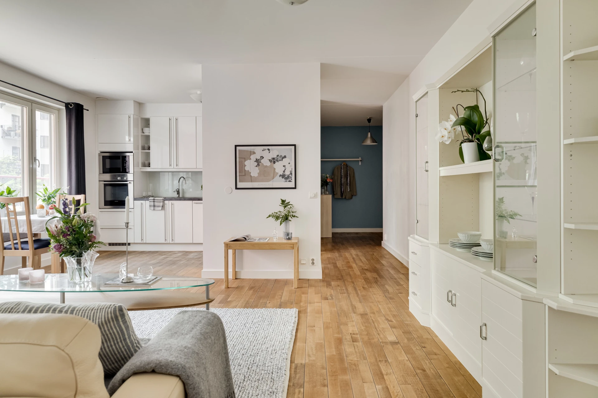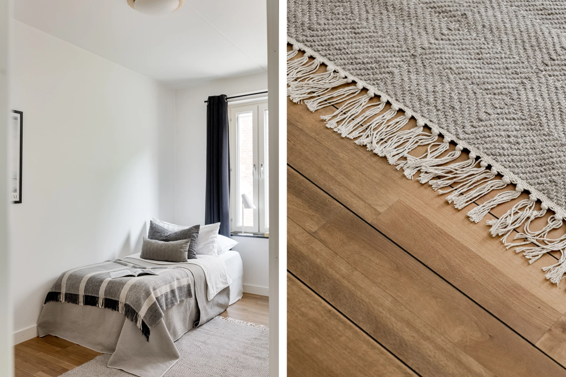 Skeppsgolv och vita väggar. Goda förvaringsmöjligheter i garderober med skjutdörrar.