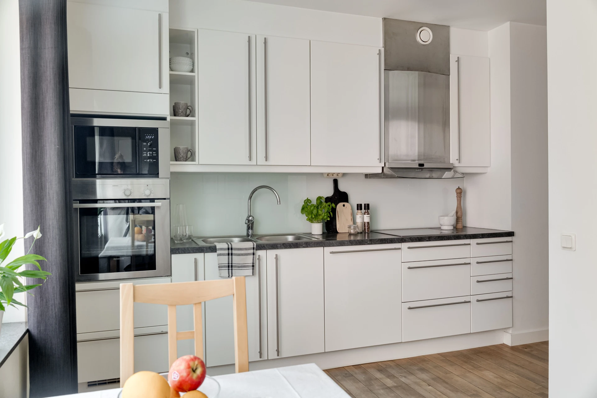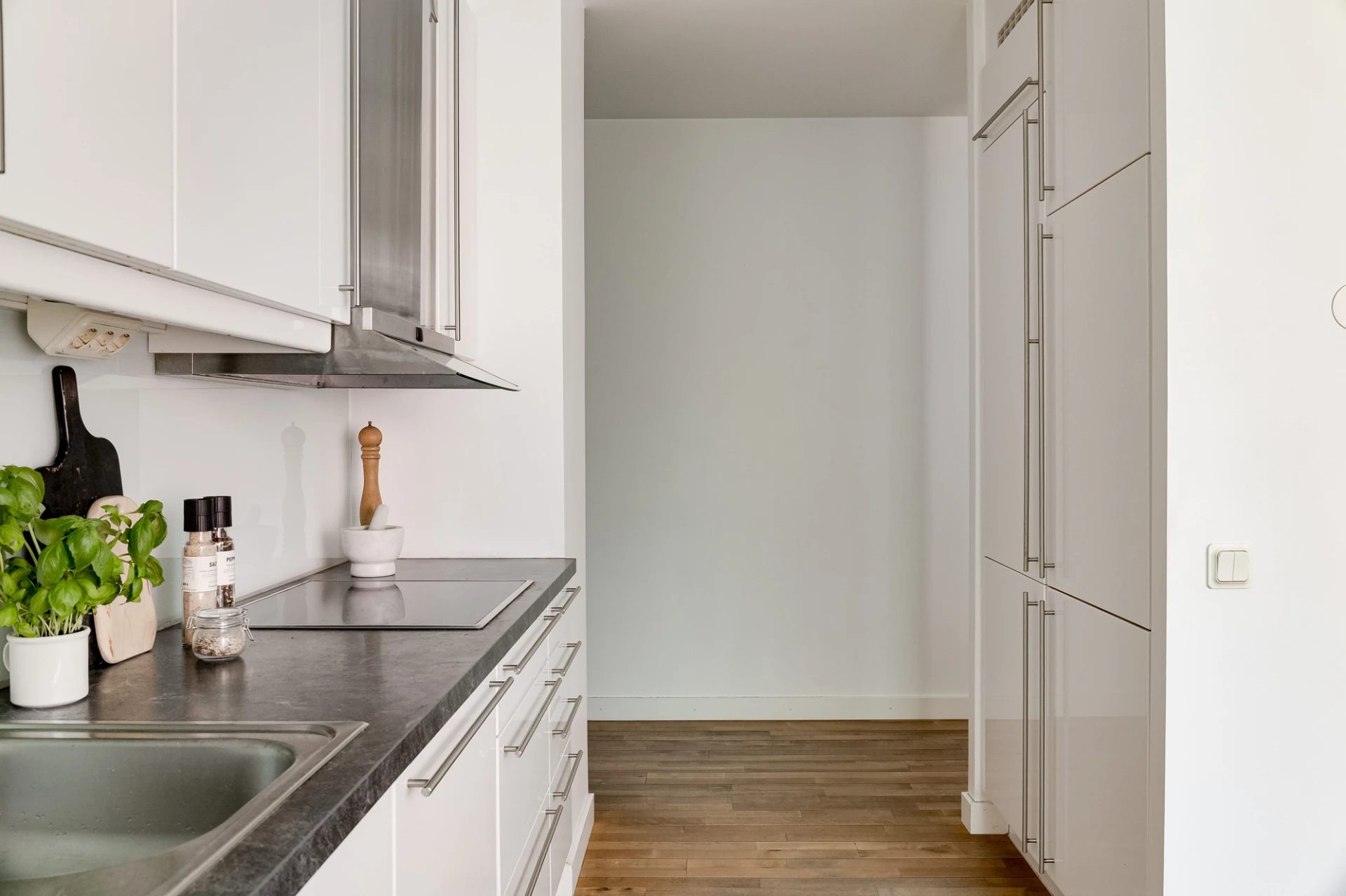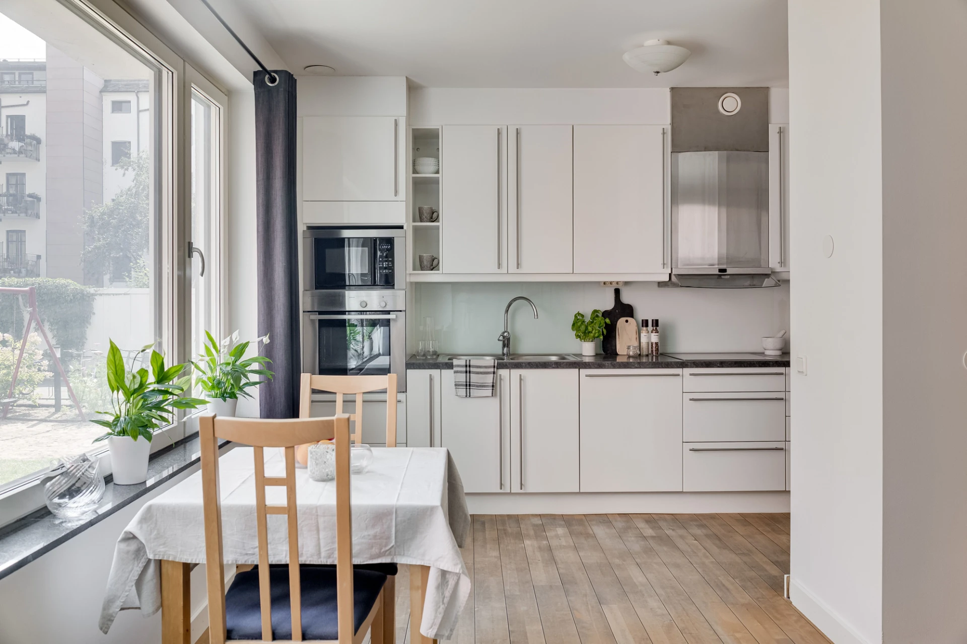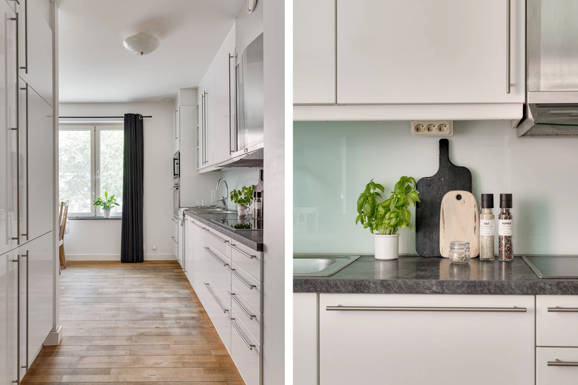 Skeppsgolv och vita väggar. Vit köksinredning med stänkskydd i glas ovan bänkskiva i laminat. Köket är utrustat med häll, fläkt, inbyggd mikrovågsugn, inbyggd ugn, integrerad diskmaskin, kyl och frys.