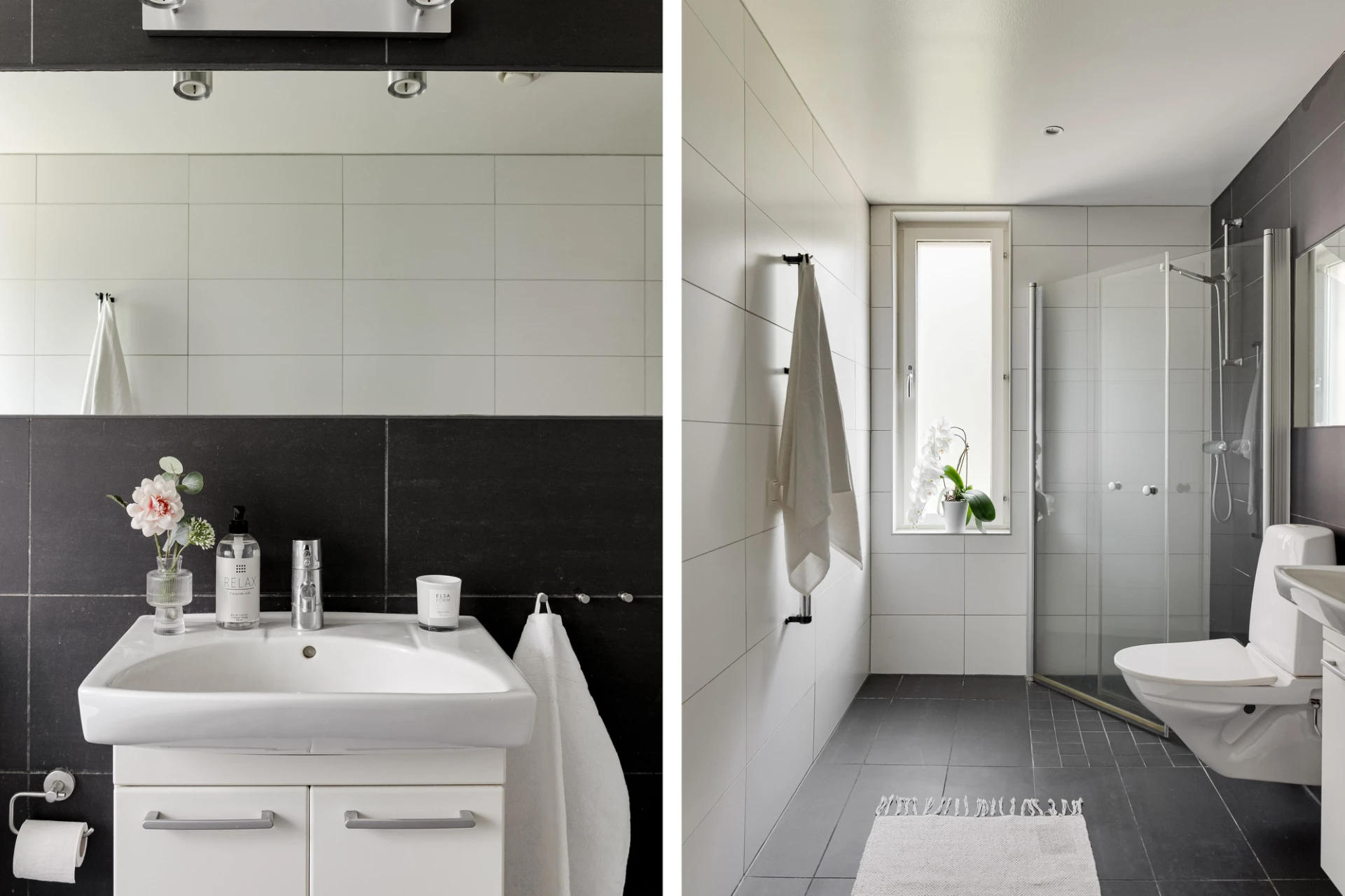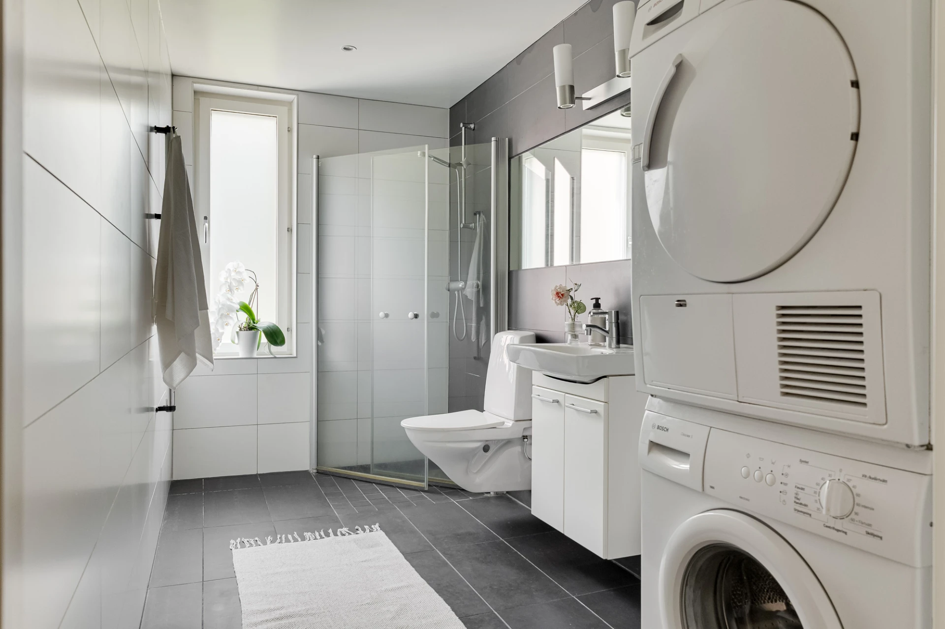 Grå klinker och vitt kakel. Badrummet är utrustat med wc, handfat med vit kommod, spegel, dusch, tvättmaskin och torktumlare.