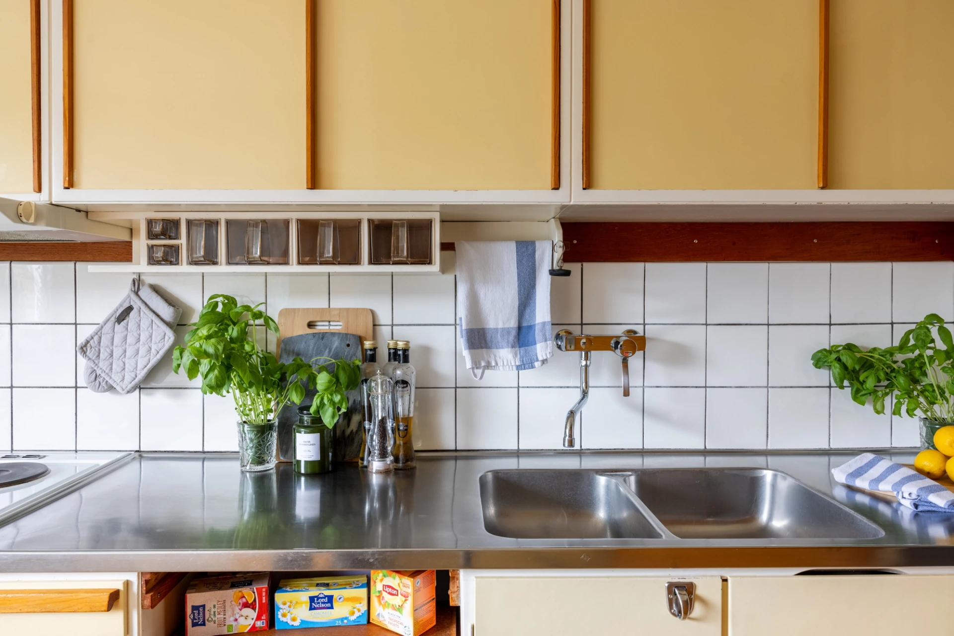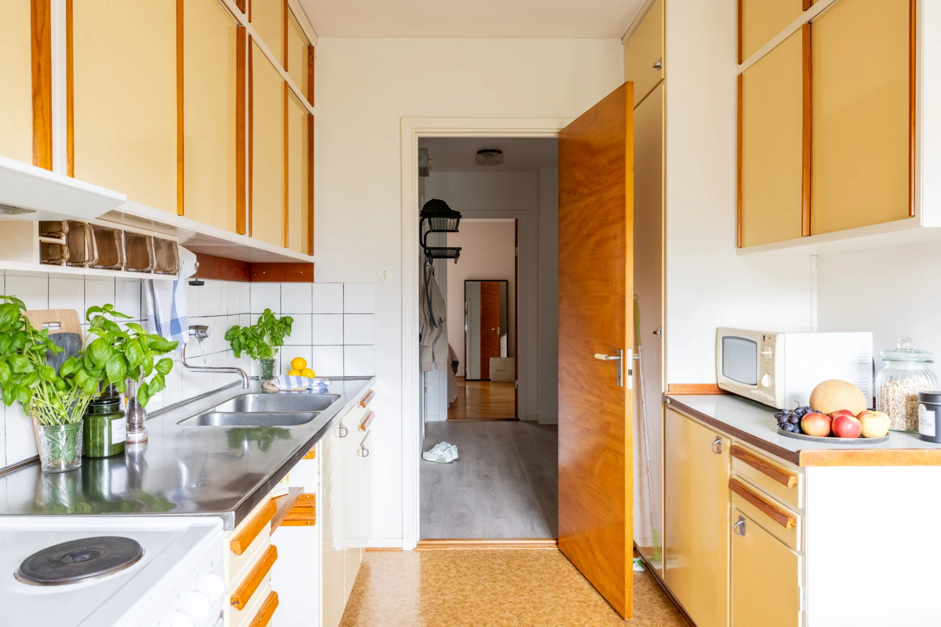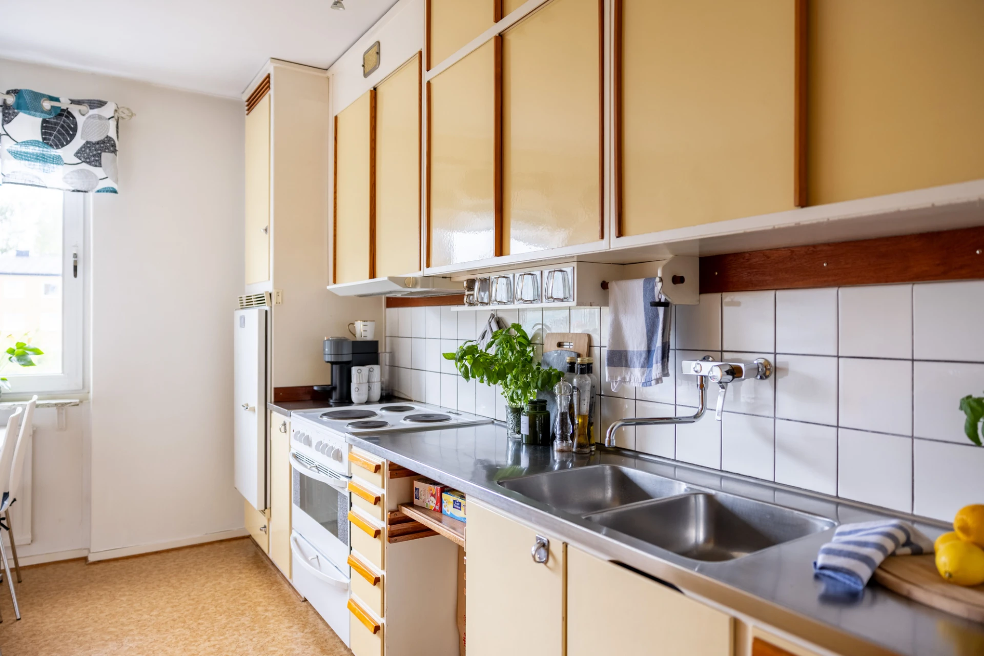 Ljust plastmatta och vita väggar. Bevarat originalkök med rostfri diskbänk och vit stänkskydd i kakel. Köket är utrustad med spris med ugn, fläkt, micro, vask och kyl med frysfack.