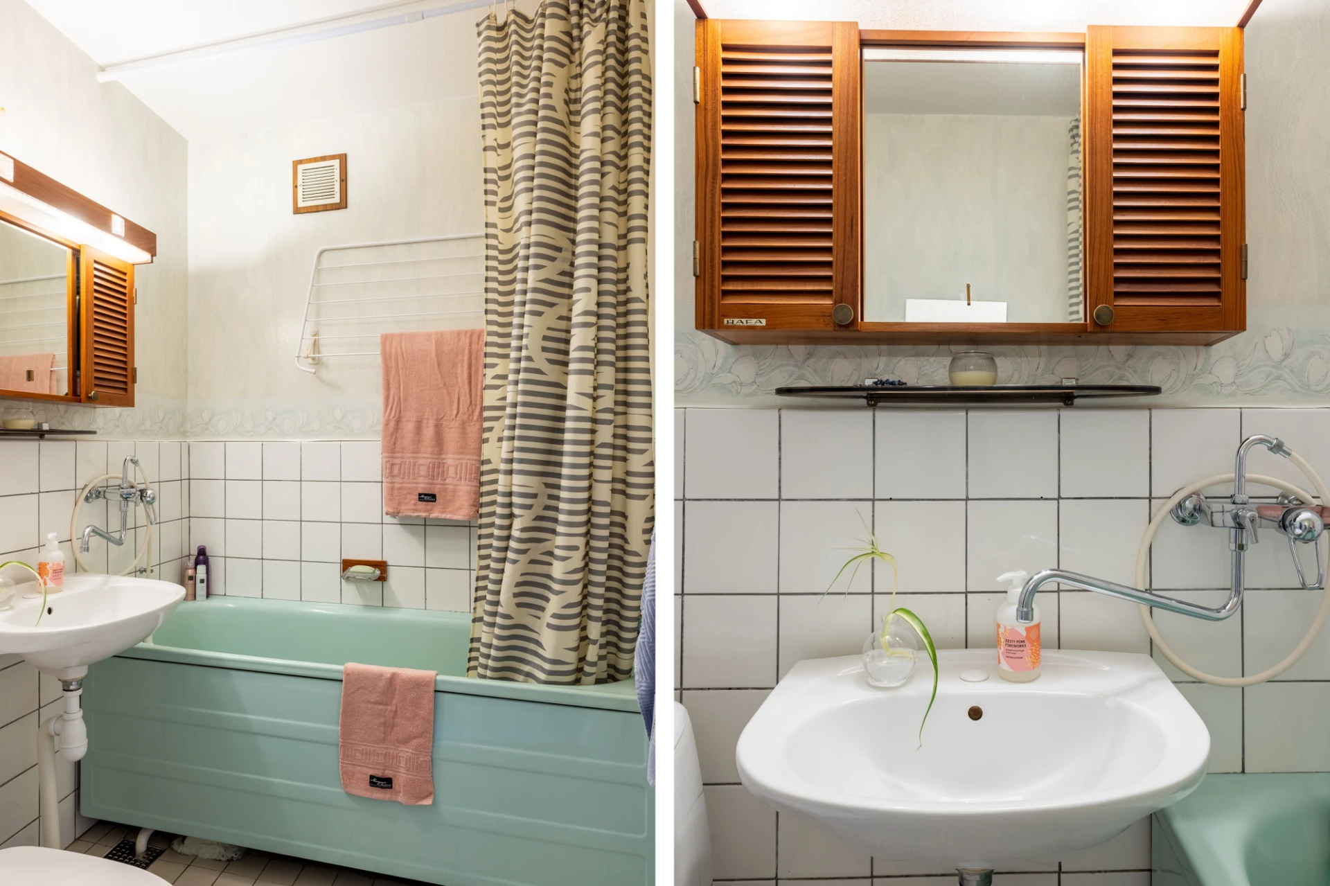 Halvkaklat badrum i vit kakel och grön plastmatta. Badrummet är utrustad med badkar, wc, spegelskåp och handfat.