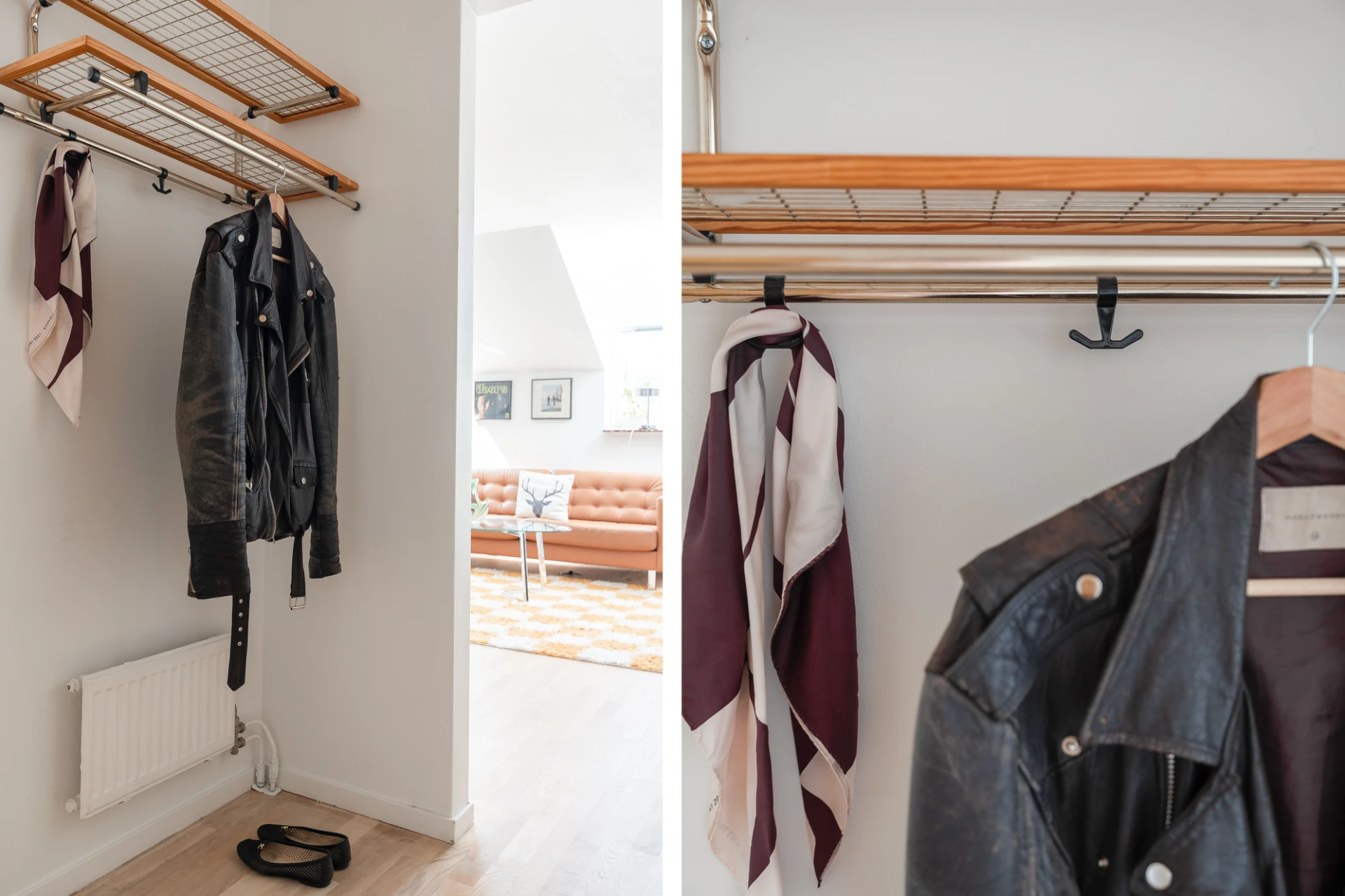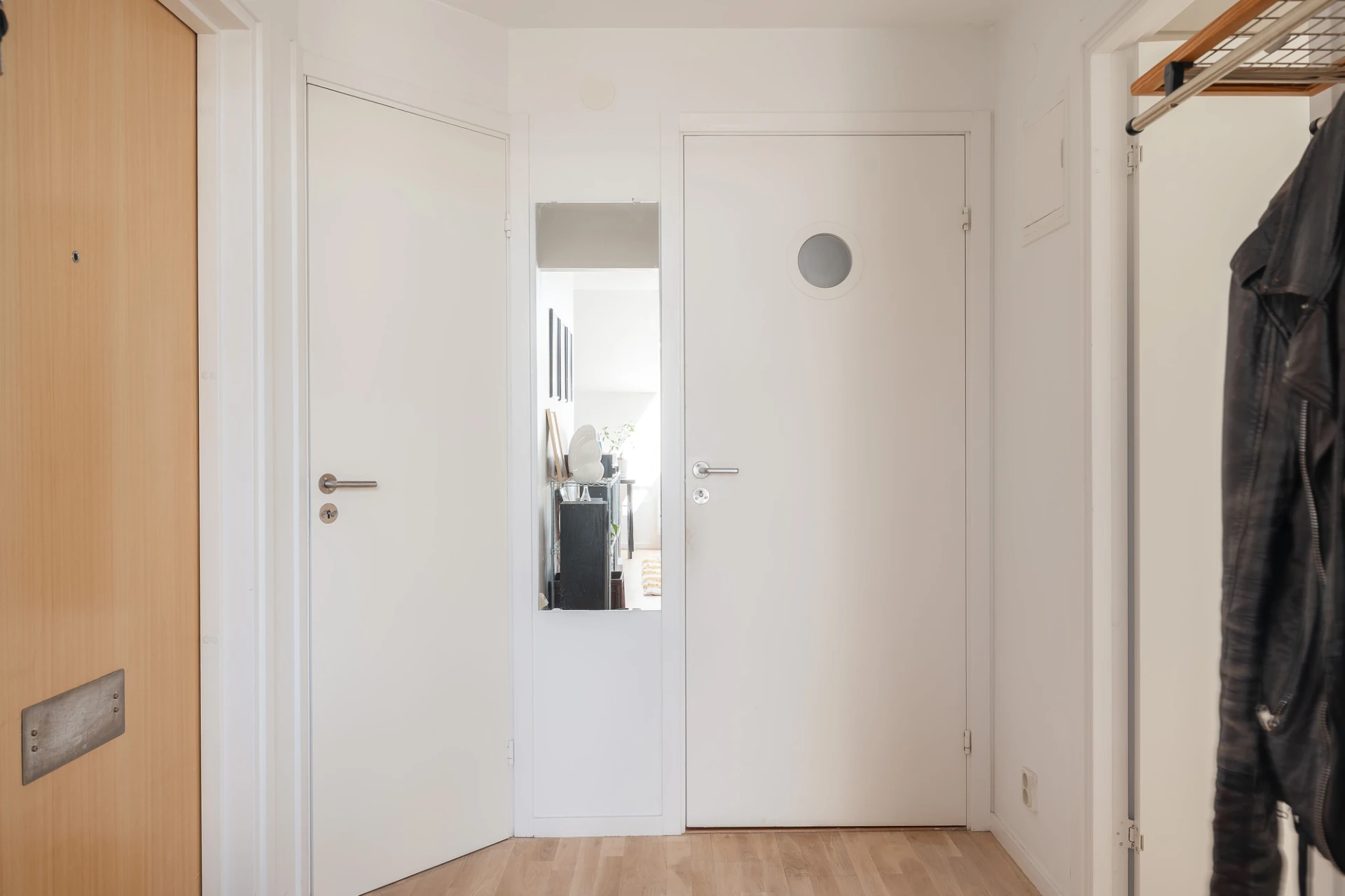 Välkomnande hall med plat för avhängning. Förvaring erbjuds i en rymlig klädkammare. Parkettgolv och vita väggar.