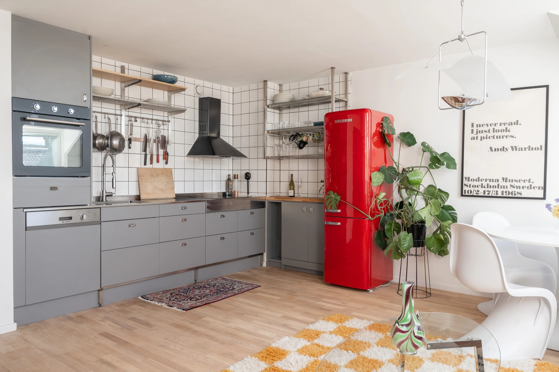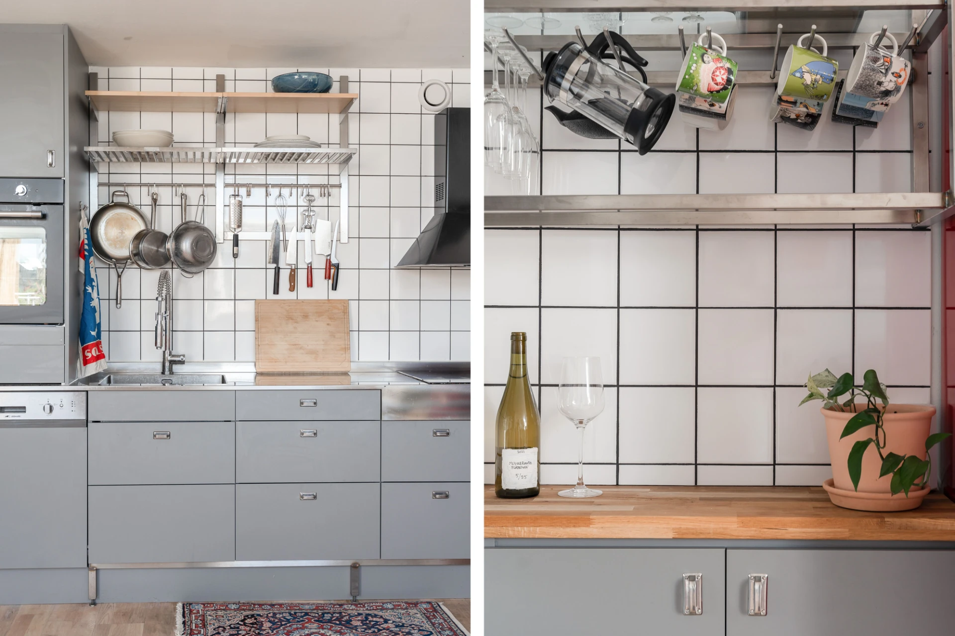 Grå köksinredning från HTH (från 2024) med vitt kaklat stänkskydd ovan bänkskiva i rostfritt. Köket är utrustat med spis, ugn, fläkt, diskmaskin och kyl/frys från Severin. Köket ligger i öppen planlösning mot matplatsen och vardagsrummet. Parkettgolv och vita väggar.
