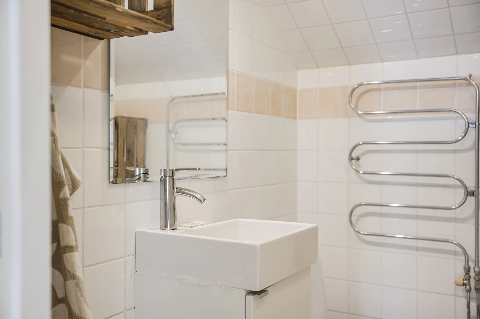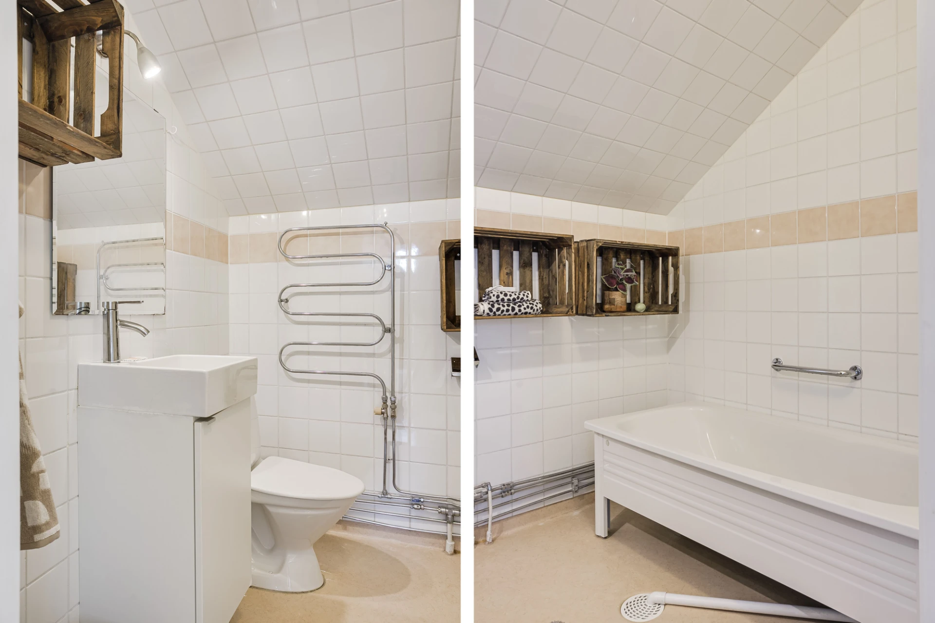 Ljus våtrumsmatta och vitt kakel. Badrummet är utrustat med badkar, handfat med vit kommod, wc, handdukstork och spegel.