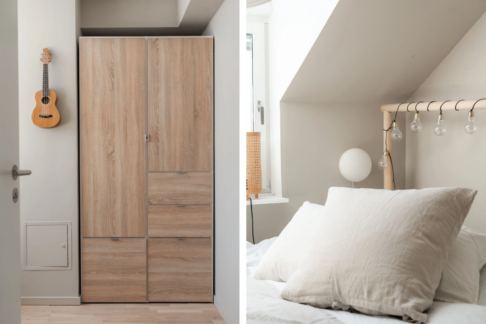 Rymligt sovrum på rofyllt läge. Förvaring ges i en garderob. Parkettgolv och beige väggar.