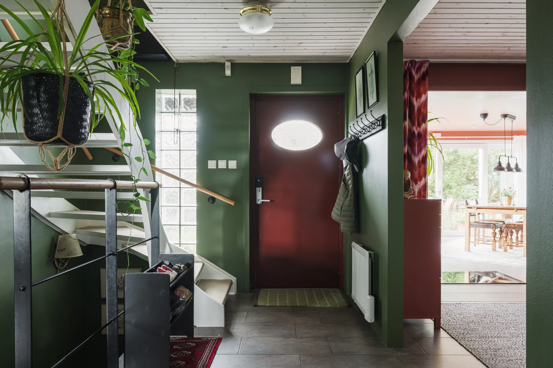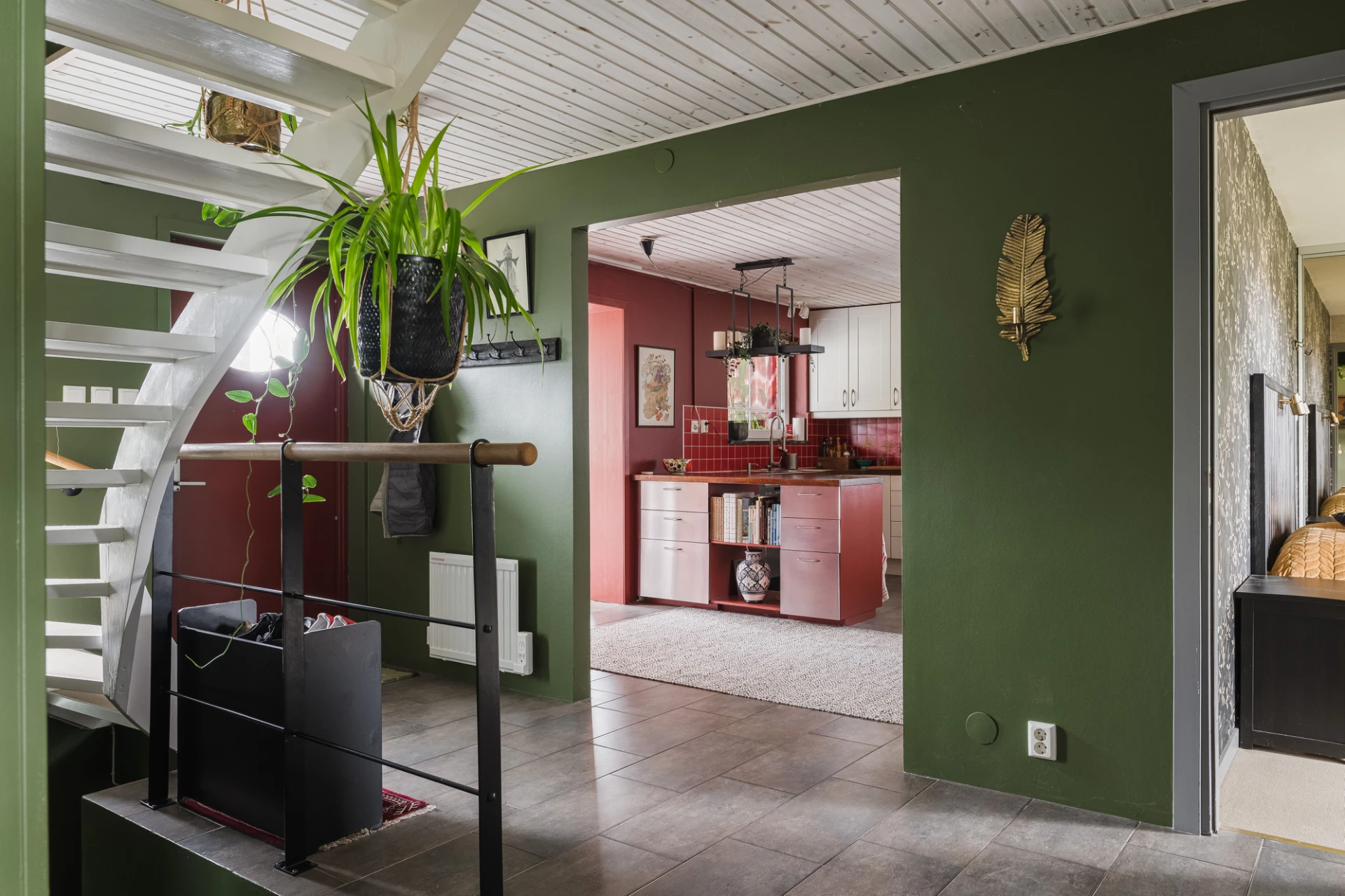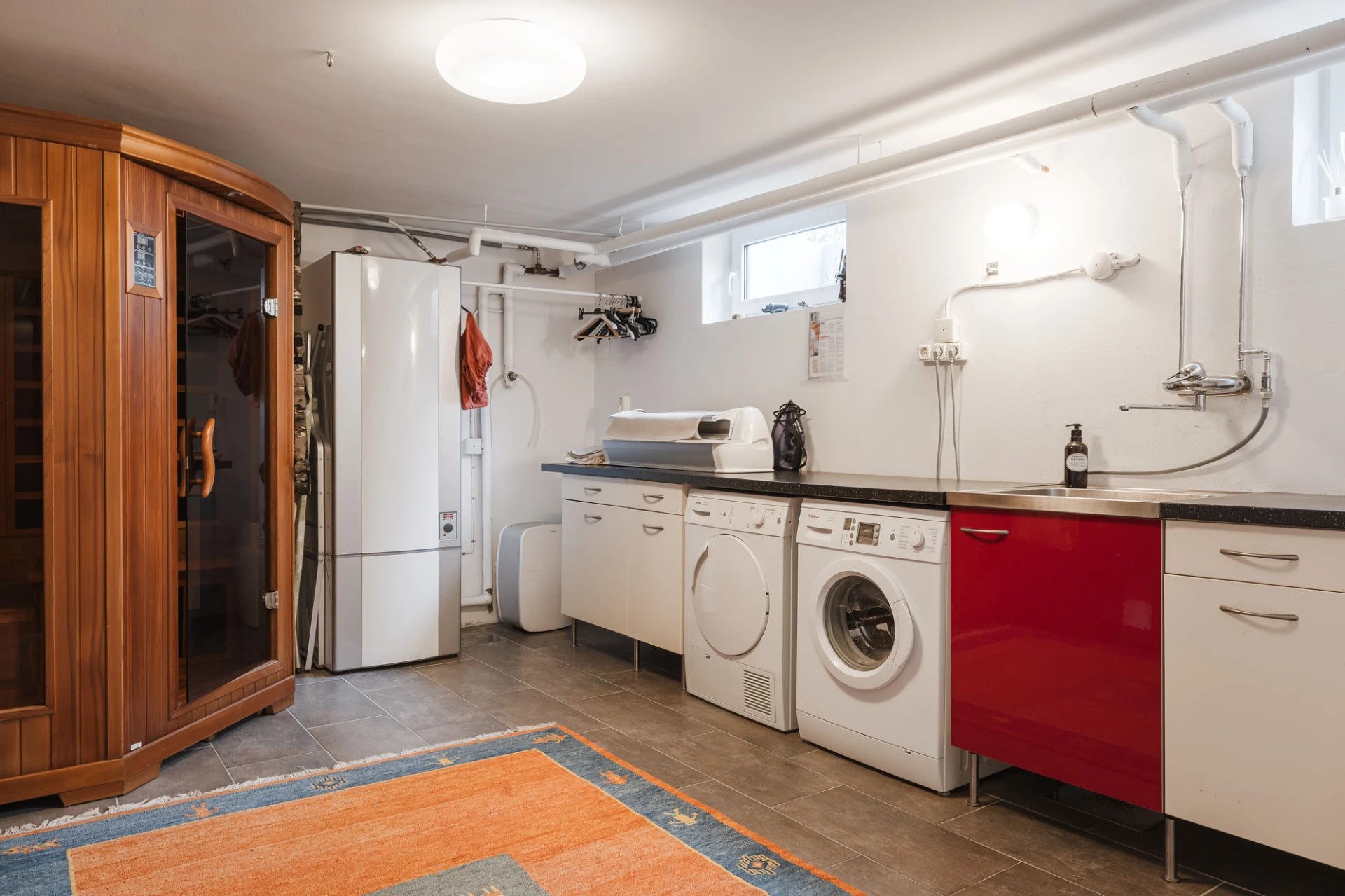 El med golvvärme i kök, badrum, matsal, v-rum, sov bv, tvättstuga, hall, källare