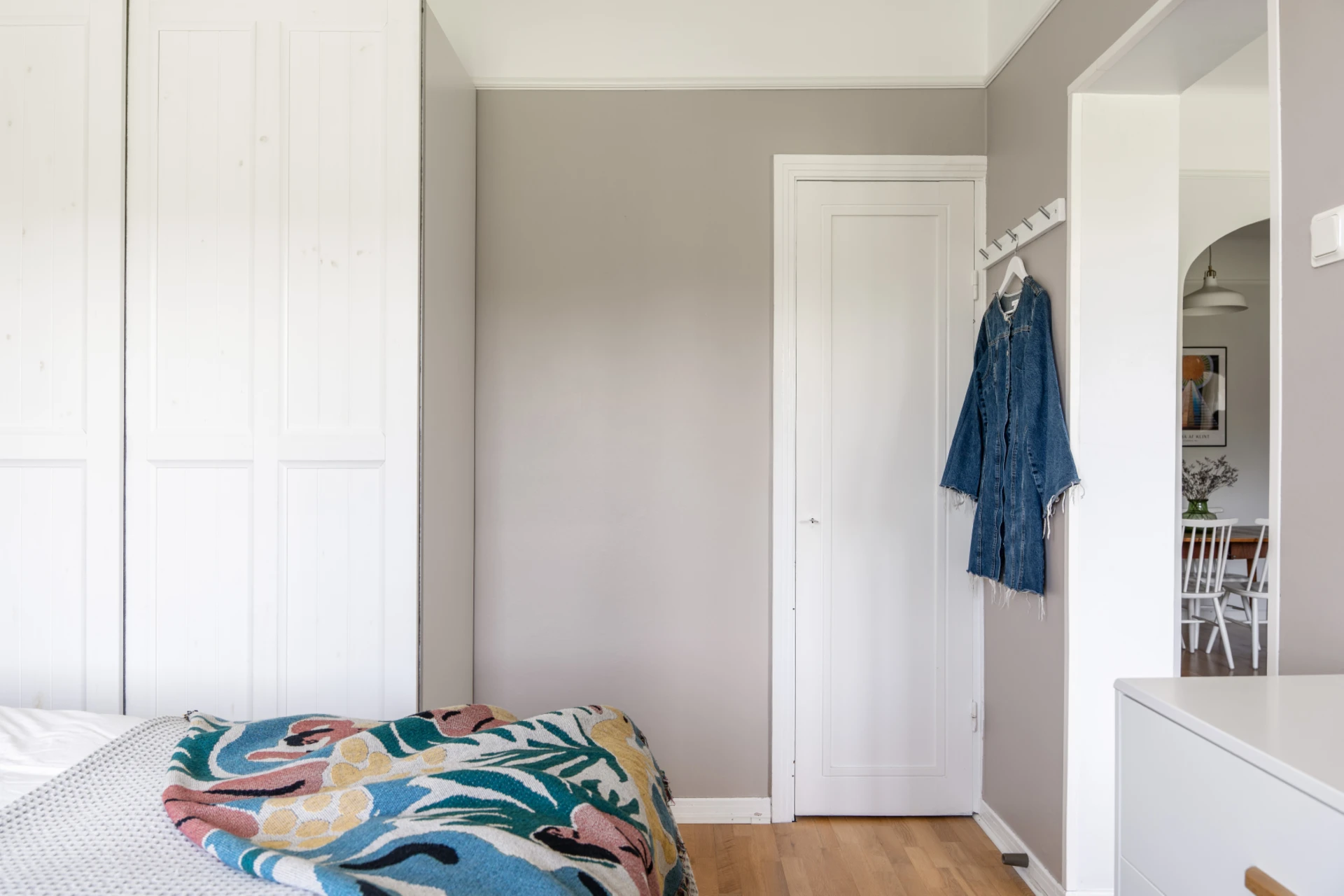 Parkettgolv och ljusgrå väggar. Förvaring i inbyggd garderob.
