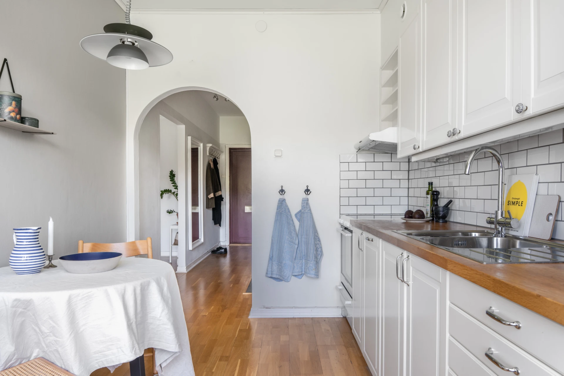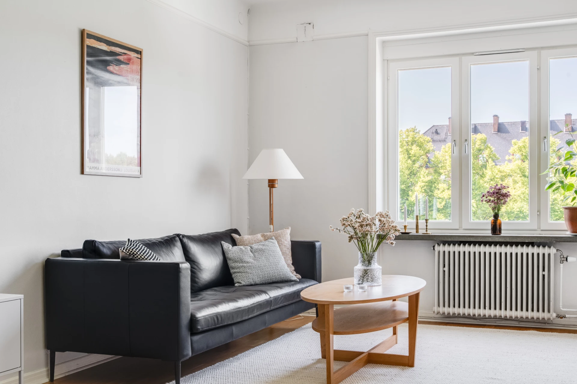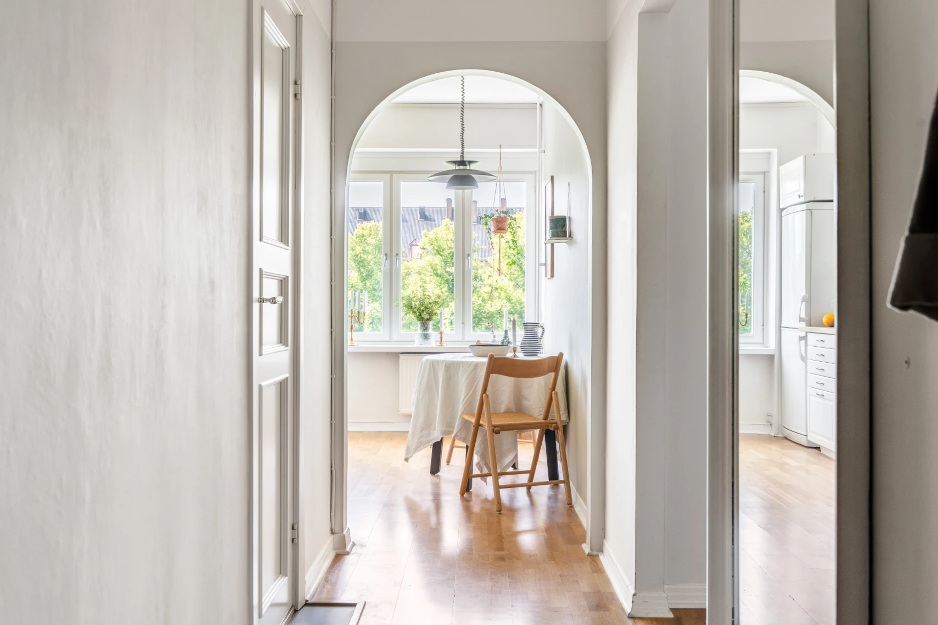 Nu har vi nöjet att presentera denna inbjudande 2,5:a högt upp i huset – en pärla där ljuset flödar in genom stora fönster med grönskande vy. Bostaden bjuder på en smart planlösning som skapar en generös känsla av rymd. Den praktiska halvan präglas en härlig och social matsal i direkt anslutning till det luftiga vardagsrummet - vilket tillsammans blir en naturlig plats att umgås med nära och kära. Genomgående parkettgolv, högt i tak och tidsenliga valv omfamnar oss med en enhetlig och karaktäristisk atmosfär. Det ljusa och inbjudande köket i lantlig stil med profilerade luckor och en praktisk diskmaskin, rymmer en matplats där vardagen kan få ta plats. Lägg därtill ett rofyllt sovrum med goda förvaringsmöjligheter och ett nyligen renoverat samt helkaklat badrum i stilren ton.