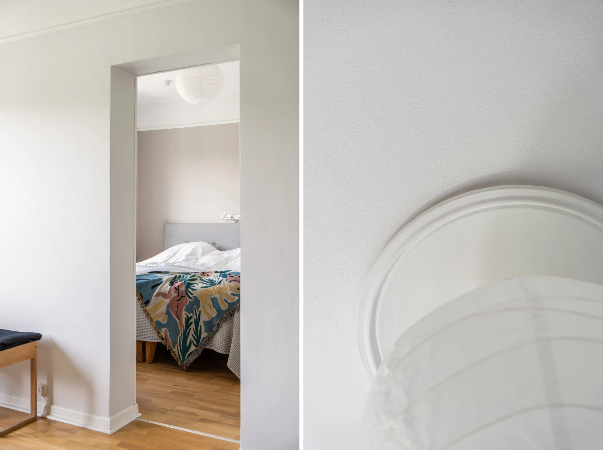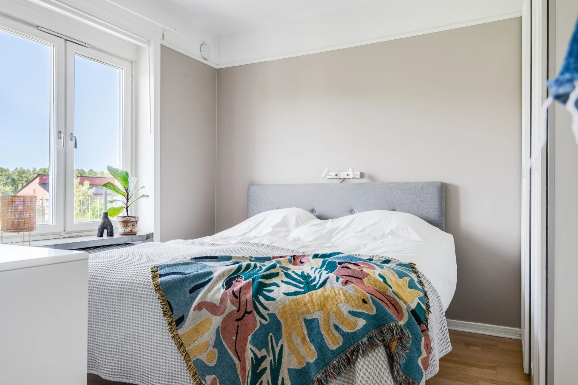Parkettgolv och sandfärgade väggar. Lamprosett. Förvaring i både garderob med skjutdörrar och inbyggd garderob.