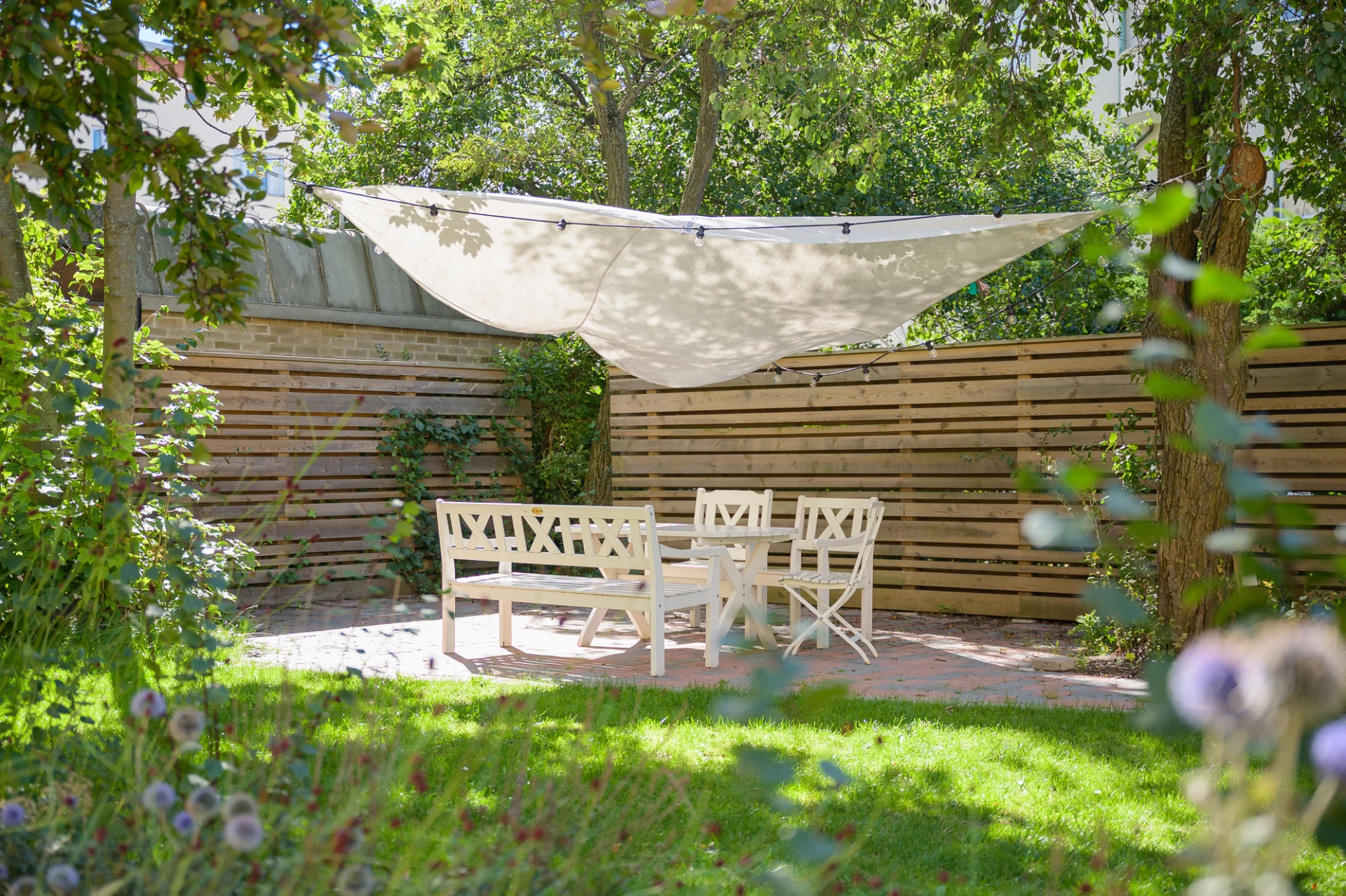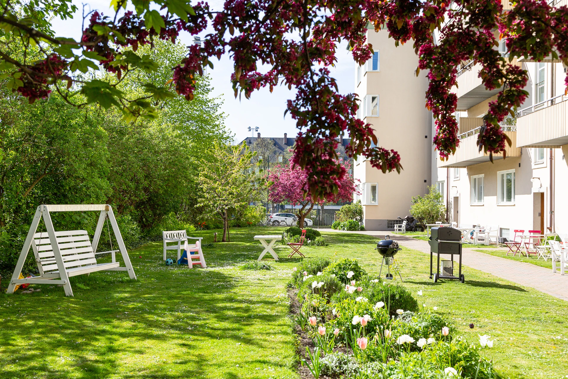 Föreningen har en underbar grön, lummig och social innergård med riktigt trädgårdskänsla. Här finns pallkragar för de boende att nyttja för olika odlingar. Under de varmare månaderna kan man nyttja föreningens utemöbler, grill och partytält kostnadsfritt.