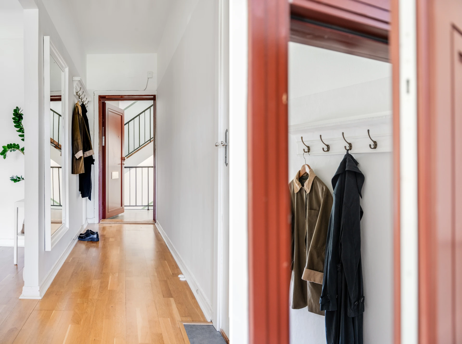 Parkettgolv och ljusgrå väggar. Plats för avhängning. Säkerhetsdörr.