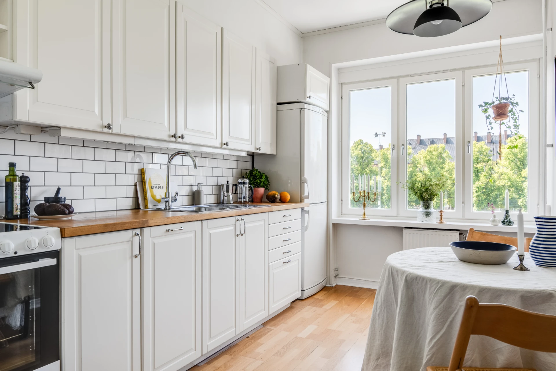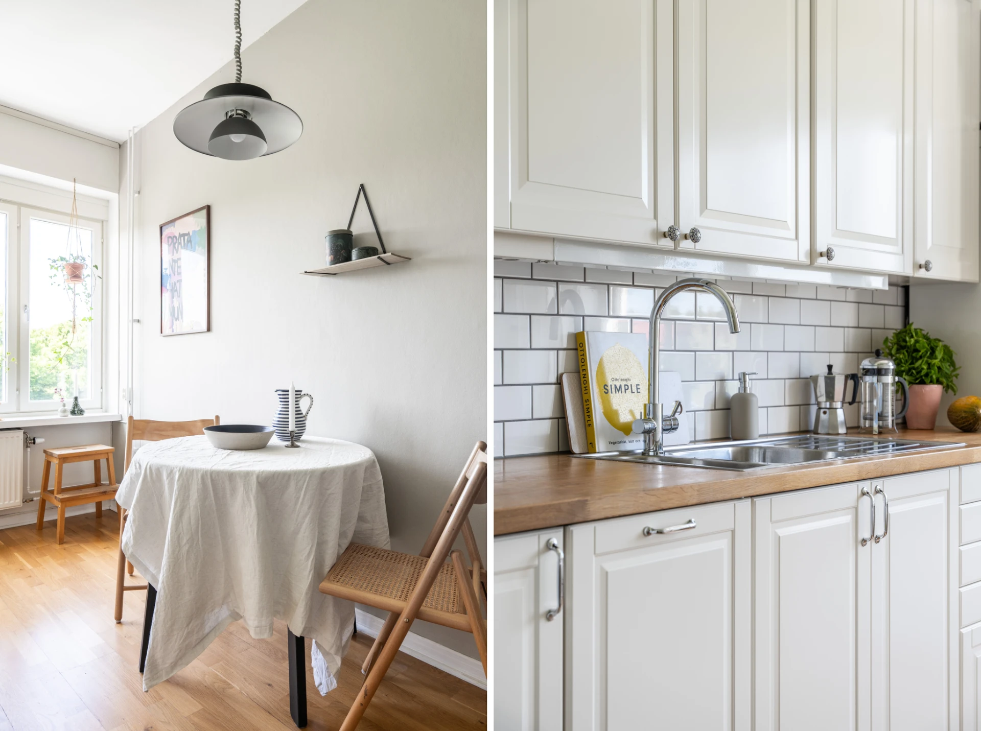 Parkettgolv och beige väggar. Vit köksinredning med profilerade luckor och vitt kakel ovan bänkskiva i ek. Köket är utrustat med kyl/frys, spis med induktionshäll, fläkt och integrerad diskmaskin. Matplats för 3-4 personer.
