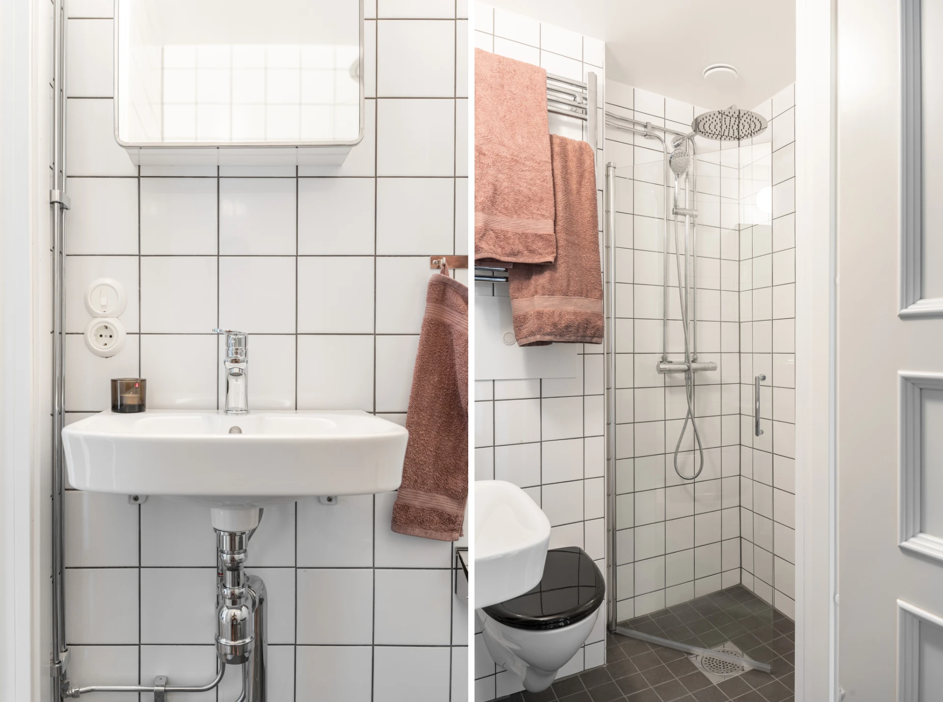 Grå klinker och vitt kakel. Badrummet är inrett med vägghängd wc, handfat, spegelskåp, dusch med takdusch och vikbara glasväggar samt handdukstork.