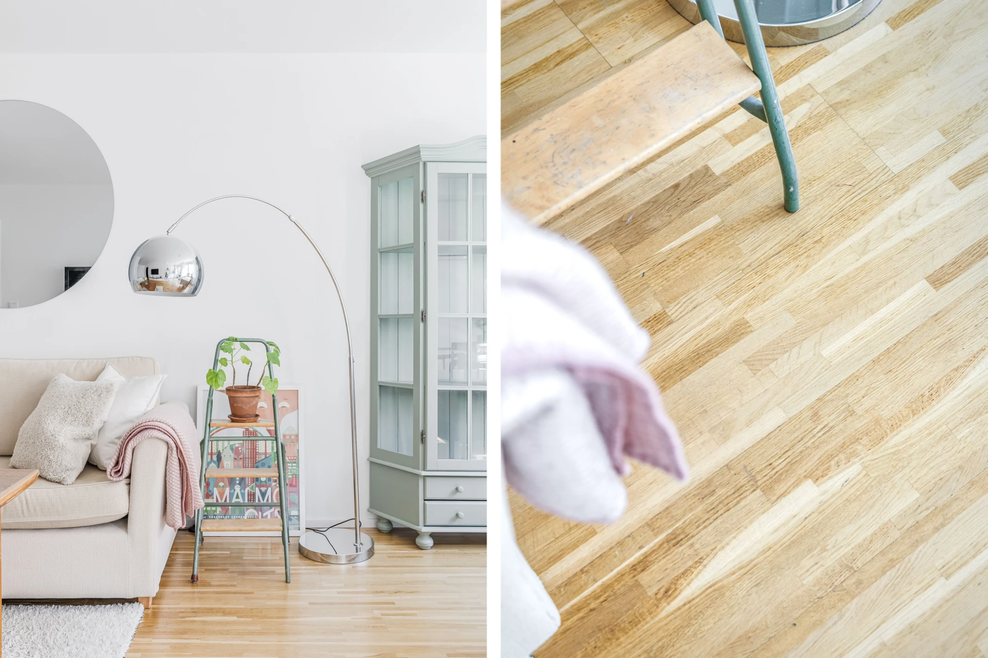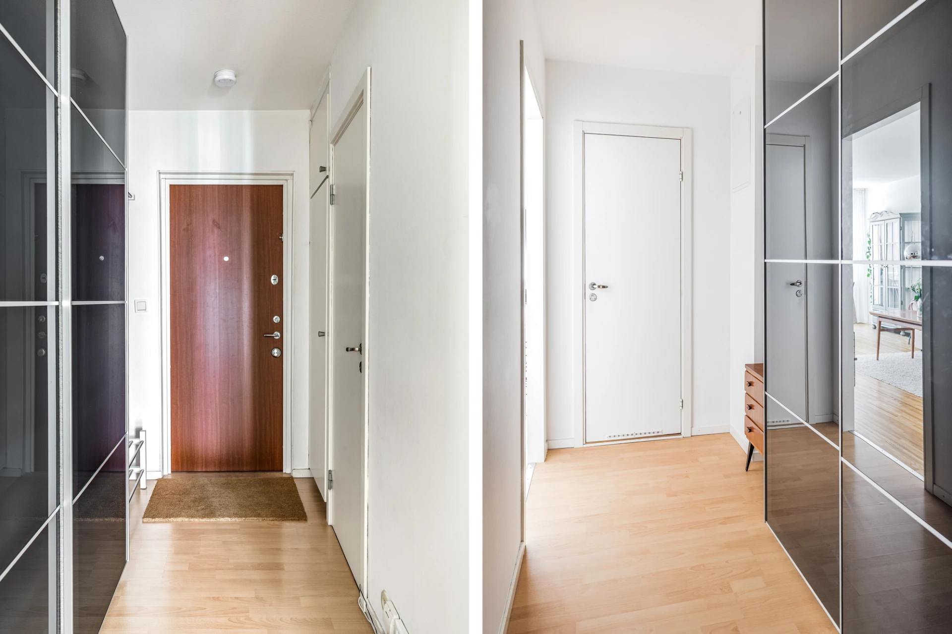 Ljust laminatgolv och vita väggar. Goda avhängningsmöjligheter och förvaring i garderob och walk-in closet.