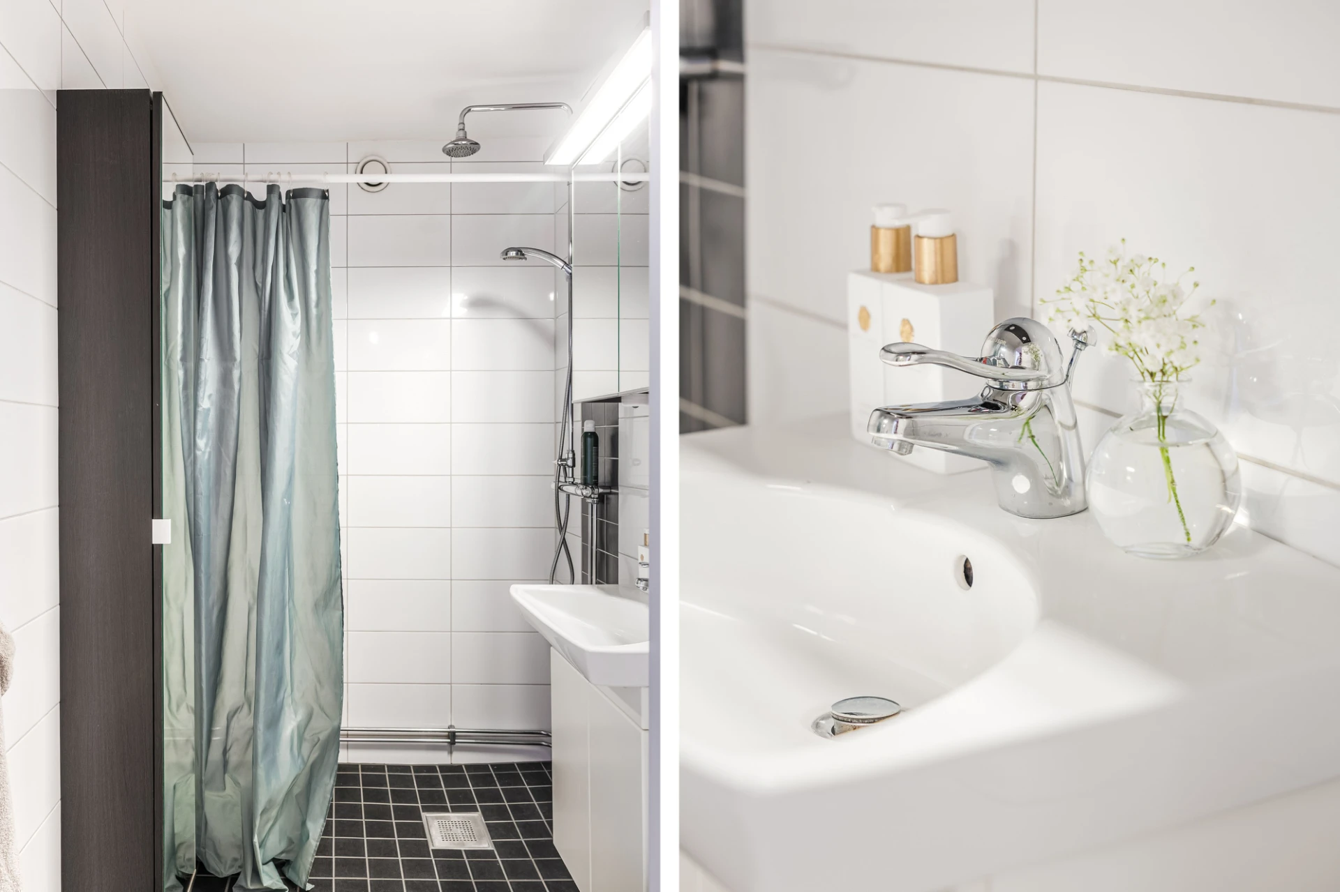 Grå klinker och vitt kakel. Badrummet är utrustat med WC, handfat med vit kommod, spegelskåp, vägghängt förvaringsskåp och dusch.