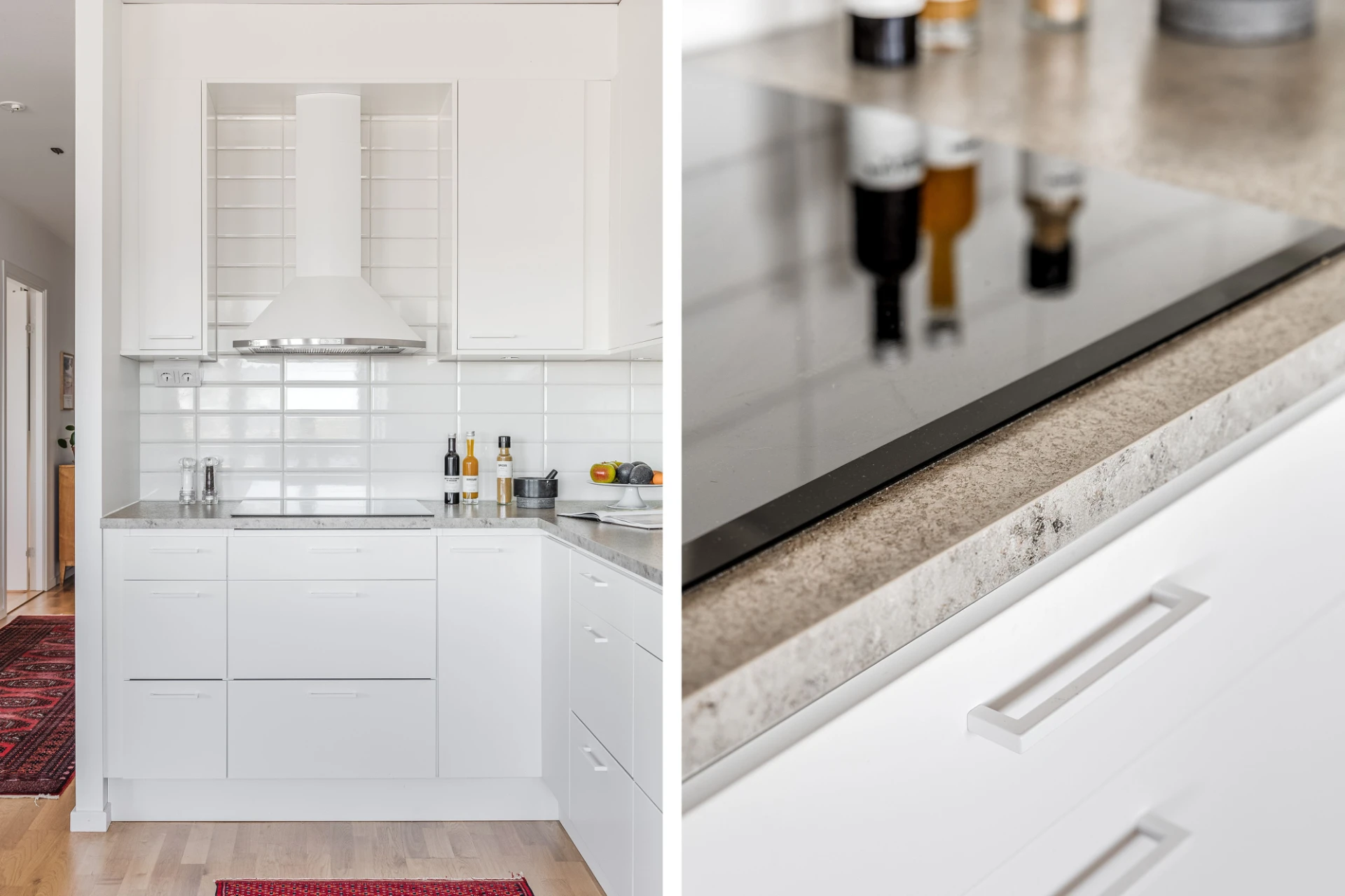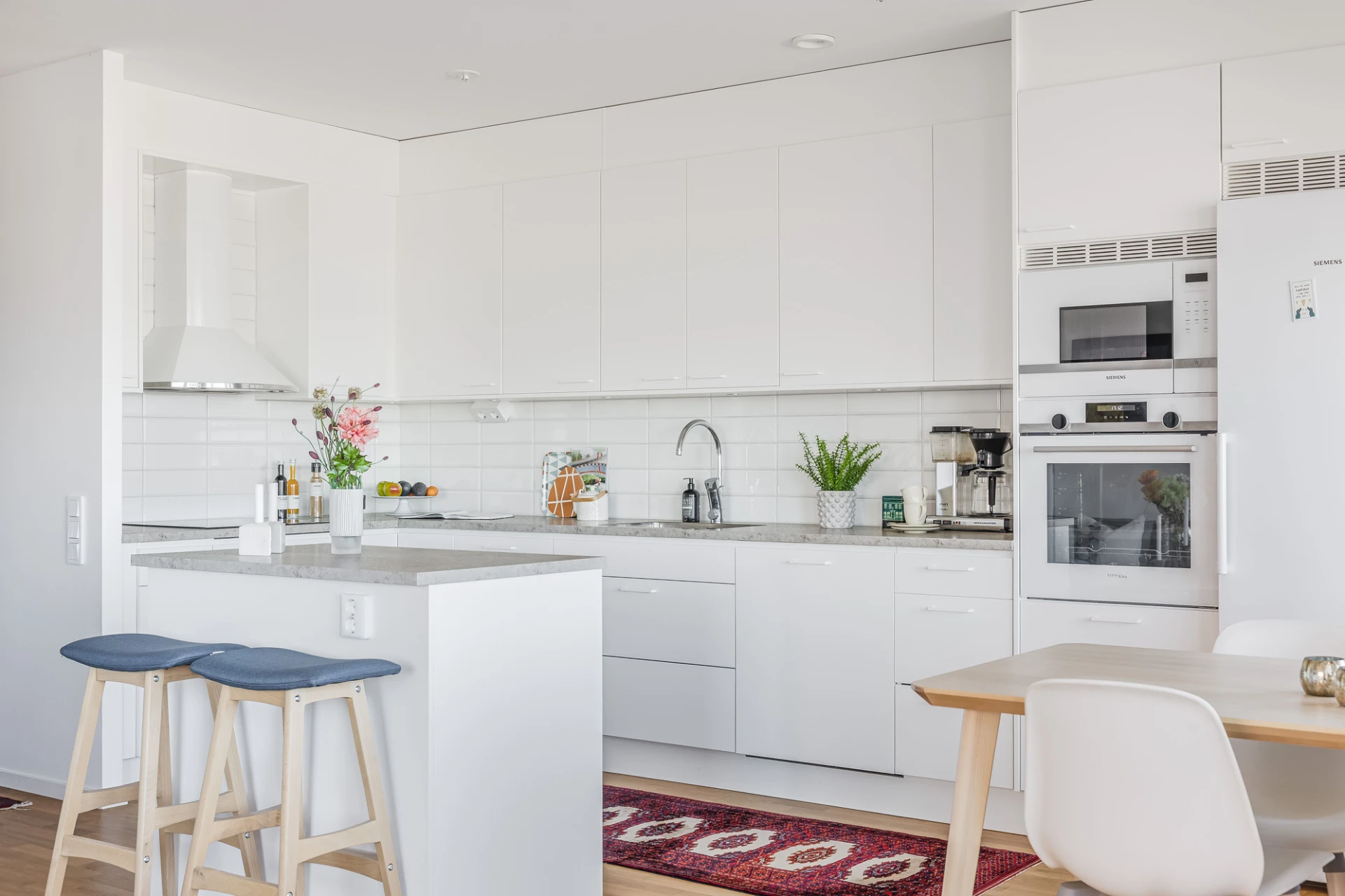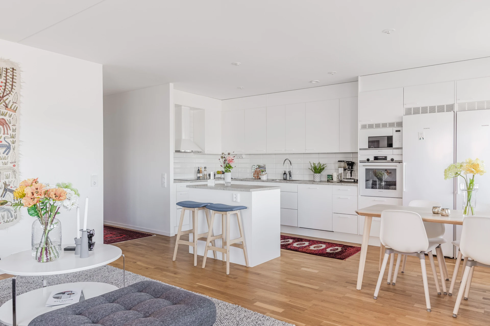 Parkettgolv och vita väggar. Vit köksinredning, vitt kakel och grå bänkskiva i laminat. Utrustat med kyl och frys i fullhöjd, spishäll, fläkt, inbyggd ugn, inbyggd mikrovågsugn samt integrerad diskmaskin. Köksö med sittplats och förvaring. Köket ligger i öppen planlösning med vardagsrummet och i anslutning finns plats för matbord.