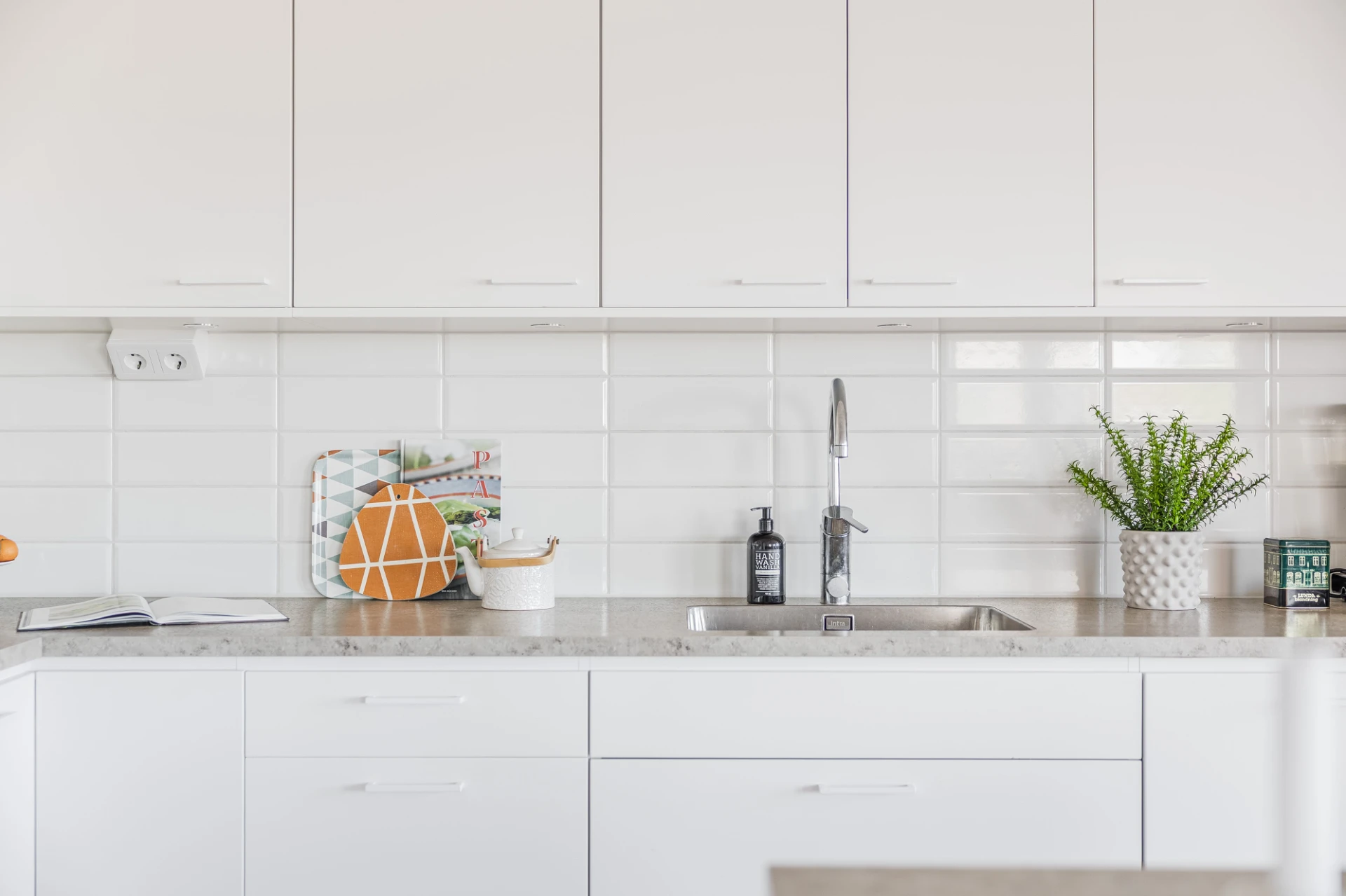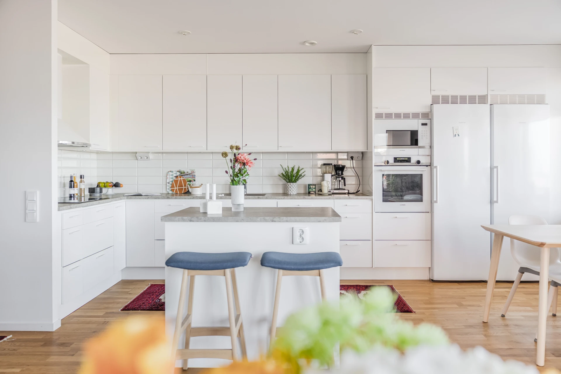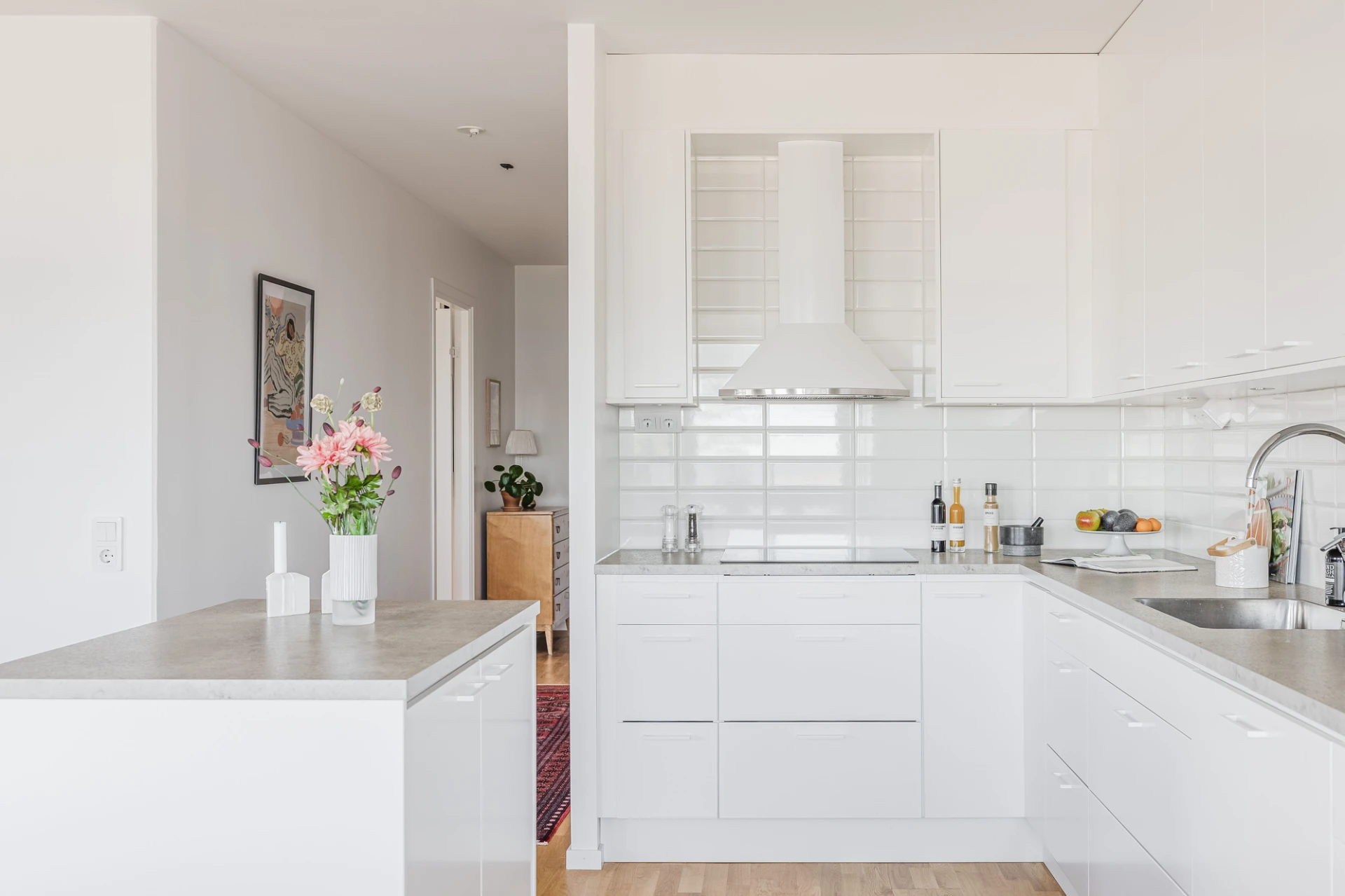Parkettgolv och vita väggar. Vit köksinredning, vitt kakel och grå bänkskiva i laminat. Utrustat med kyl och frys i fullhöjd, spishäll, fläkt, inbyggd ugn, inbyggd mikrovågsugn samt integrerad diskmaskin. Köksö med sittplats och förvaring. Köket ligger i öppen planlösning med vardagsrummet och i anslutning finns plats för matbord.