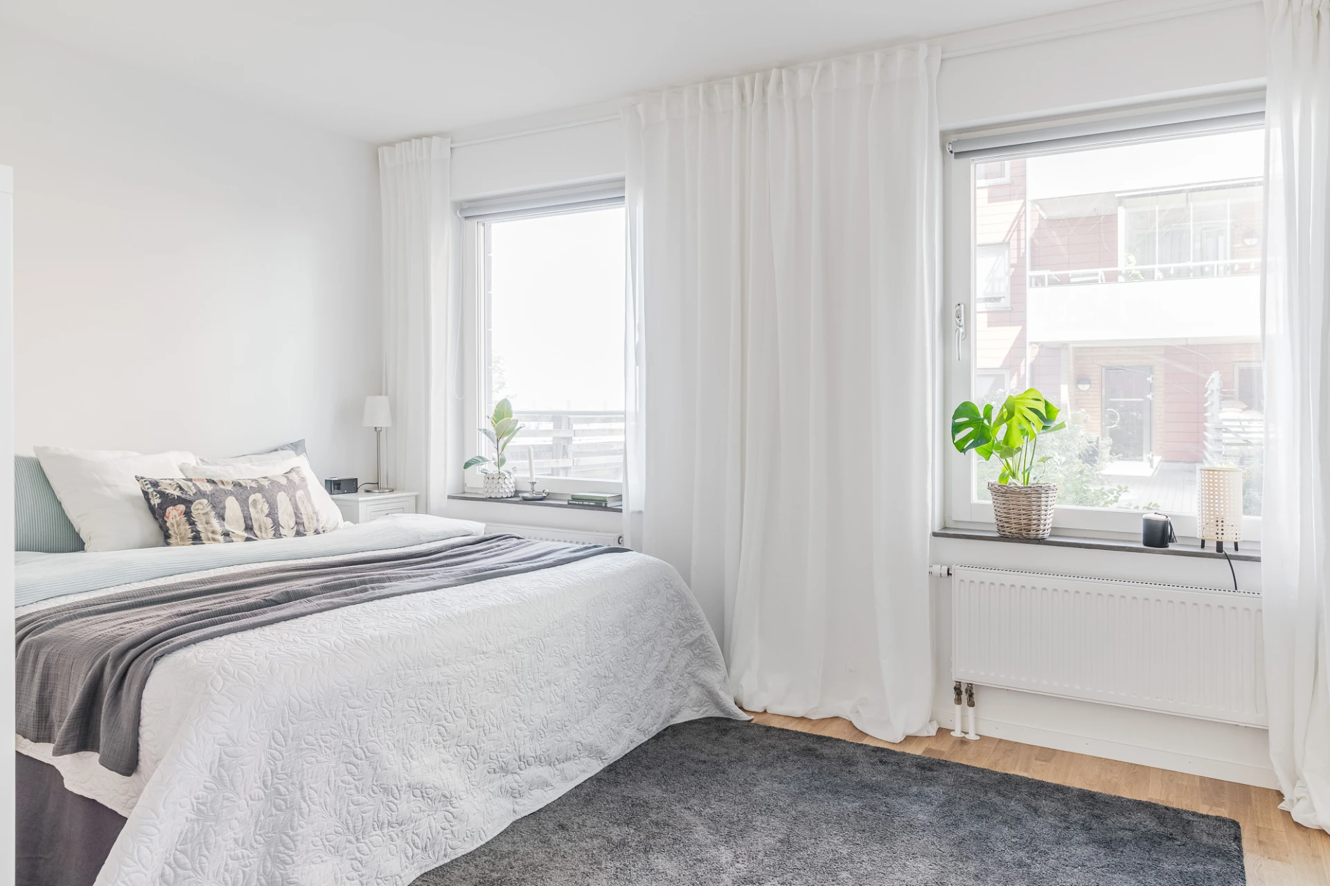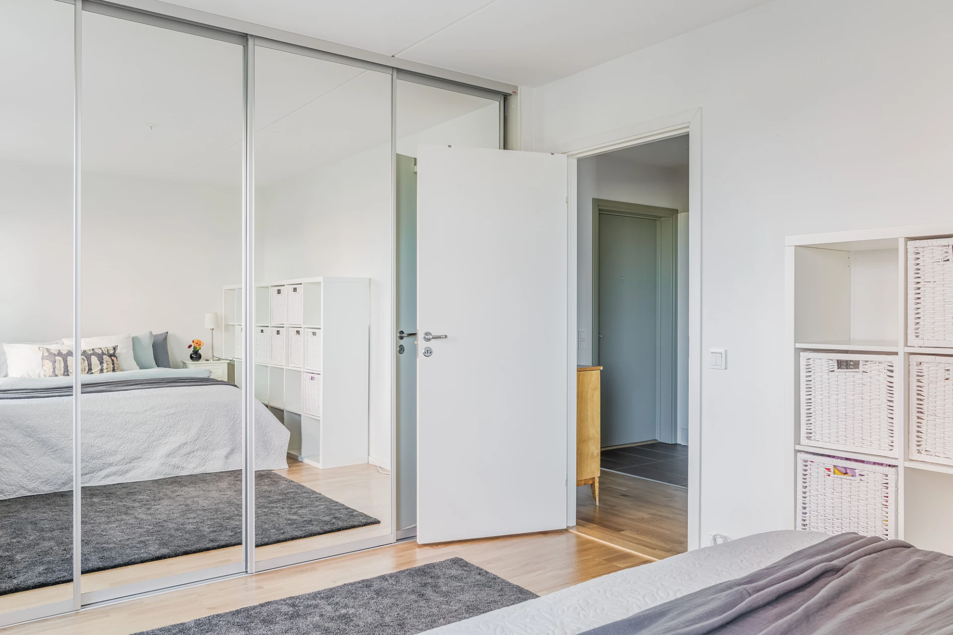 Parkettgolv och vita väggar. Plats för dubbelsäng. Förvaring i skjutdörrsgarderob med spegelglasdörrar.