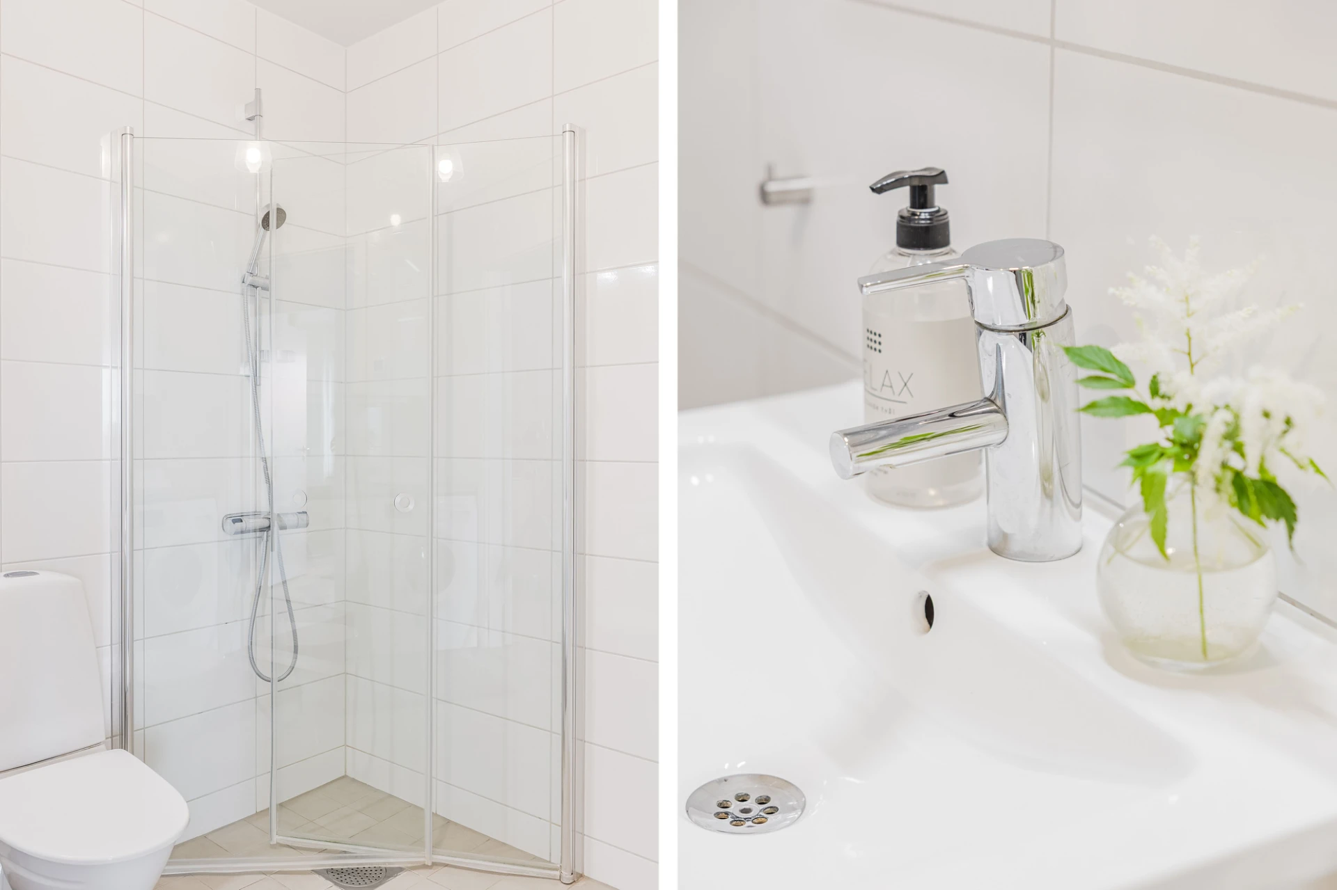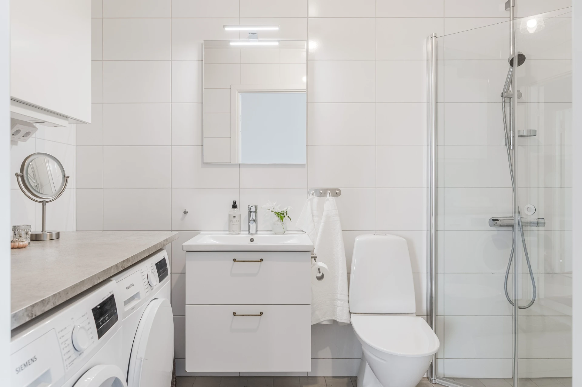 Grå klinker och vitt kakel. Utrustat med dusch med vikbara duschväggar, wc, handfat med vit kommod och spegel. Här finns även tvättmaskin och torktumlare med grå arbetsbänk i laminat samt vita väggskåp ovan.