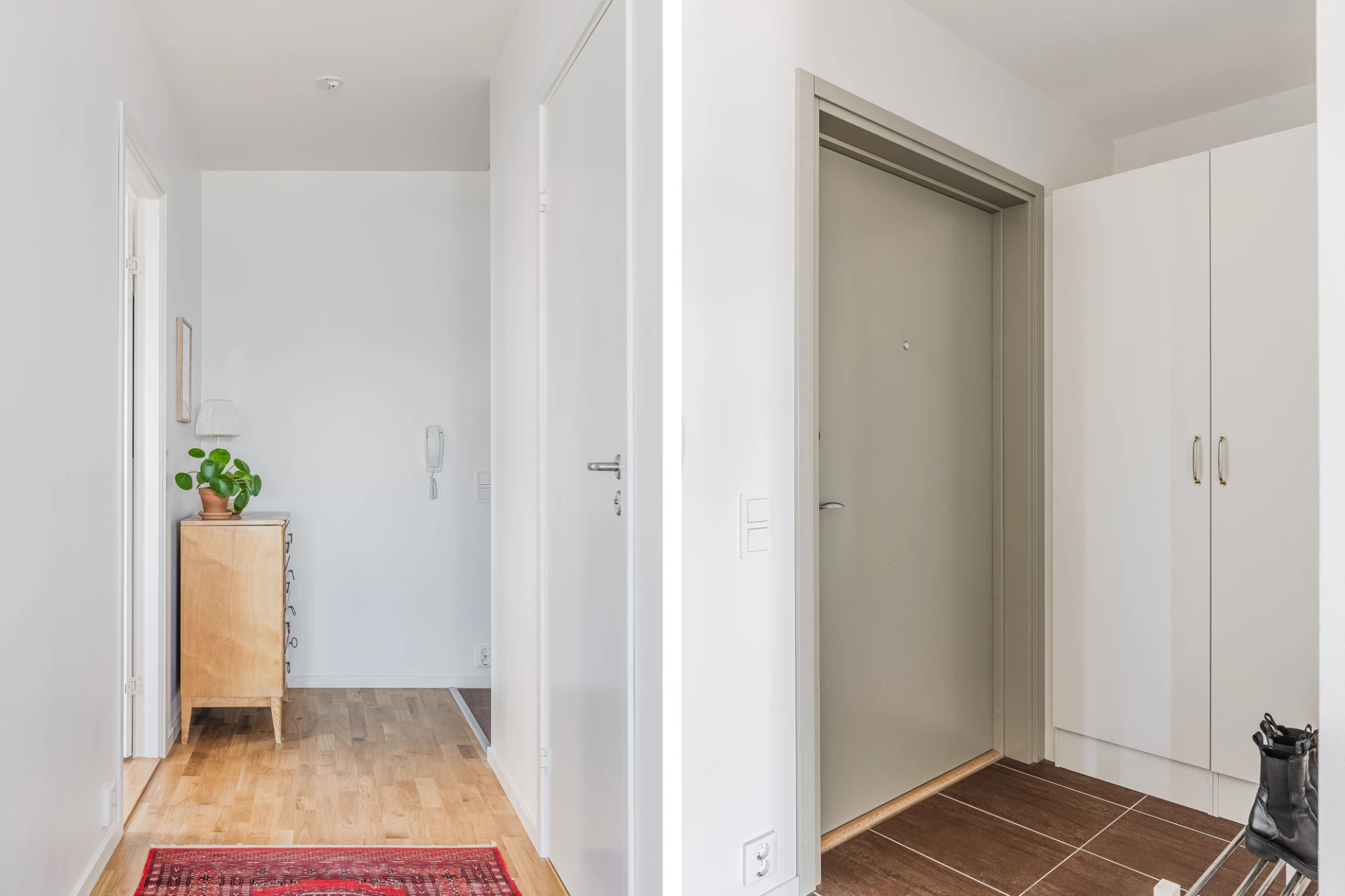 Brun klinker i entré och parkettgolv i hall samt vita väggar. Förvaring i garderob och städskåp.