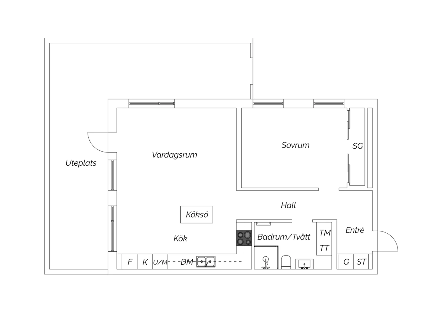 Parkettgolv och vita väggar. Fönster i två väderstreck och utgång till uteplats.