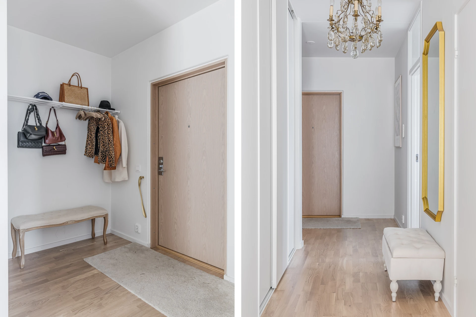 Parkettgolv och vita väggar. Plats för avhängning och förvaring i skjutdörrsgarderober.
