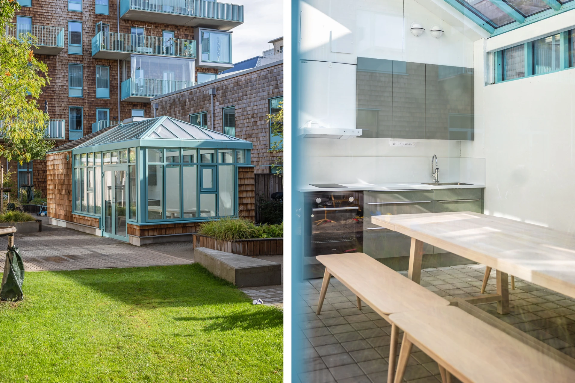 Mitt i Karnapshuset möts bostäderna kring en härlig, öppen och grön innergård. Här finns en gemensam och vinterisolerad trädgårdspaviljong med samma arkitektoniska signatur samt återkommande materialval. Dessutom eleganta växtlådor, frodiga blomsterrabatter, sittplatser och buskage. I föreningen erbjuds även en föreningslokal med pentry och badrum som kan nyttjas till såväl fest som övernattningslägenhet.