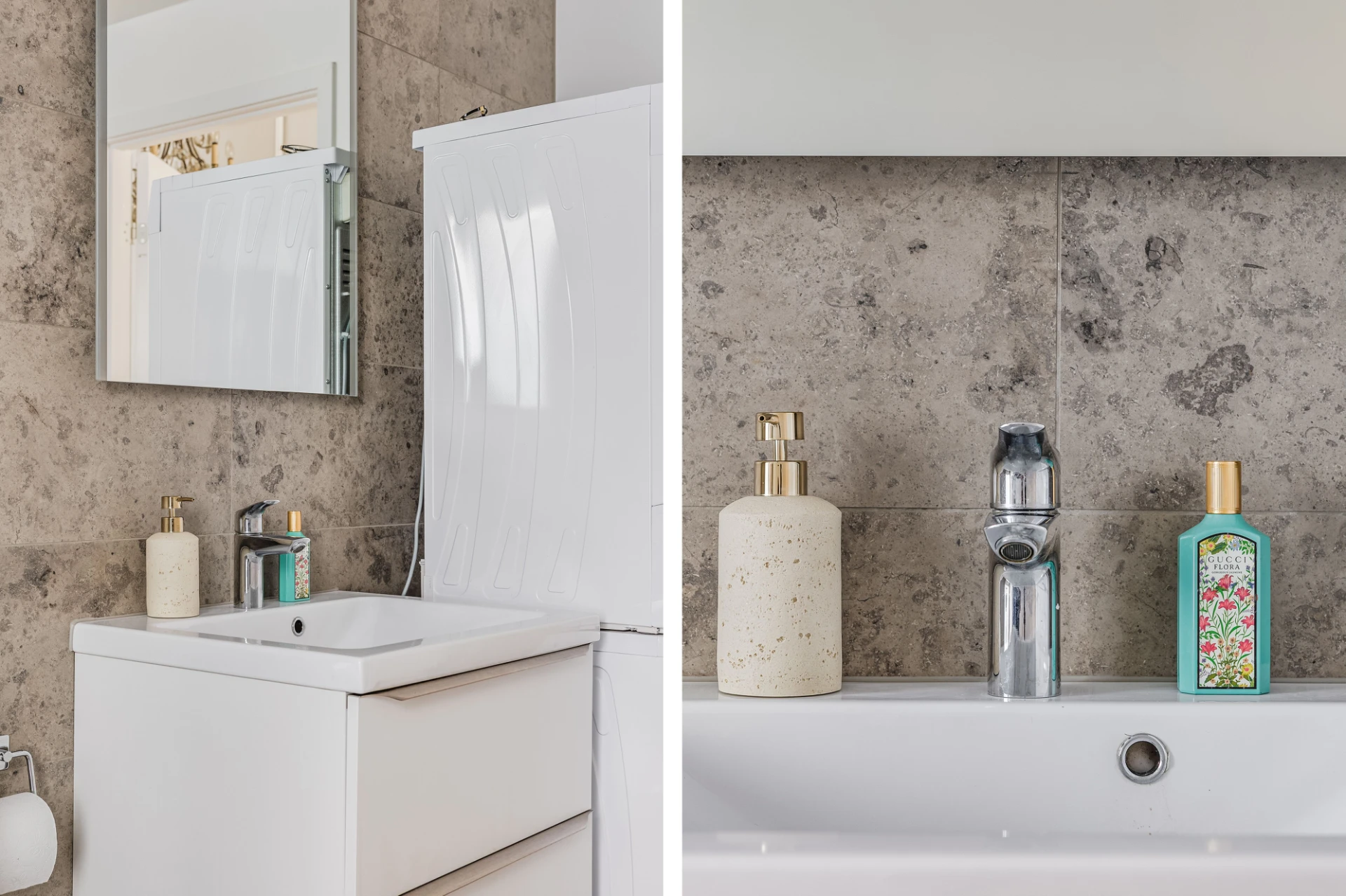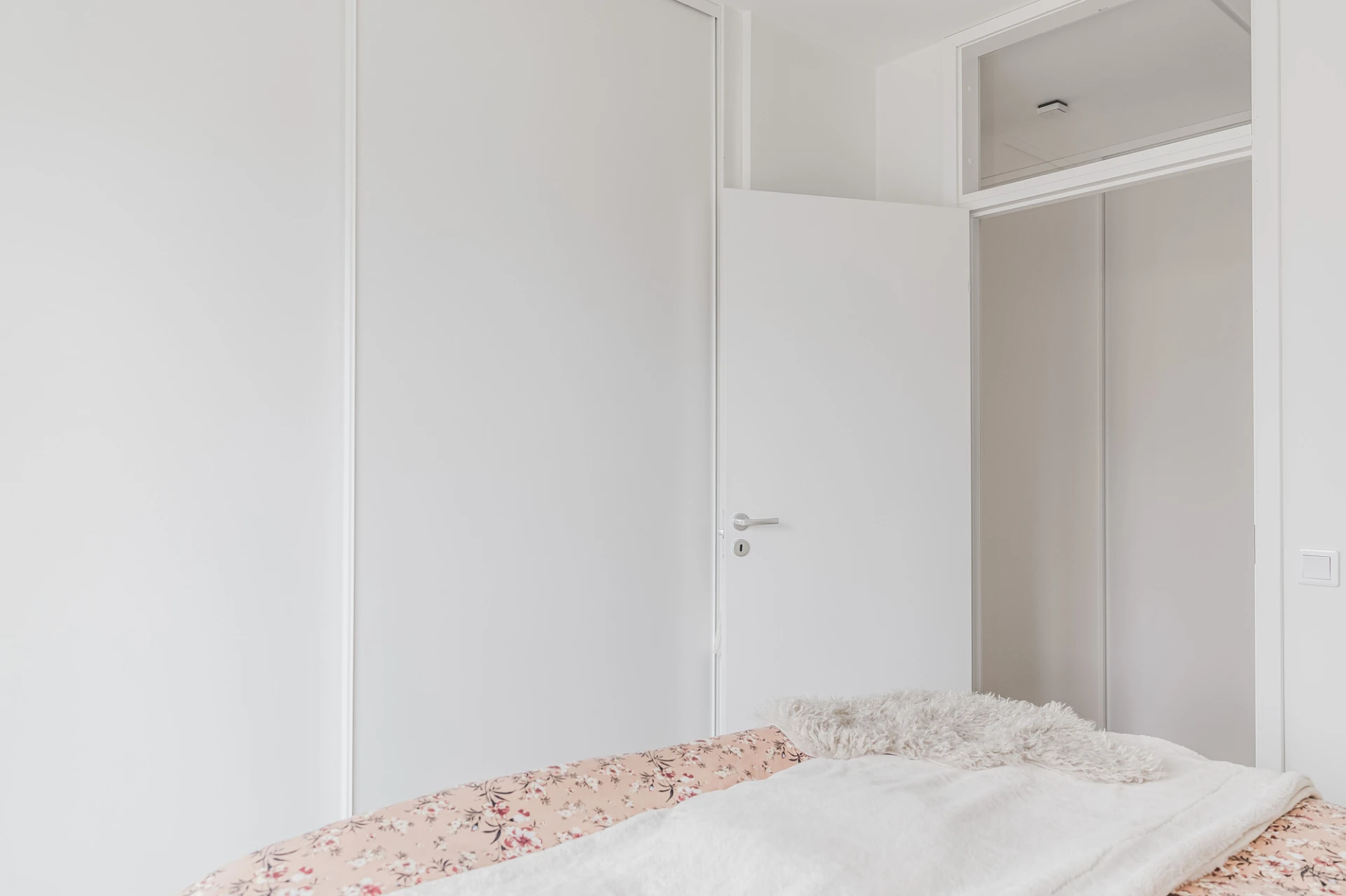 Sovrummet är rymligt och erbjuder gott om förvaring i en praktisk skjutdörrsgarderob. Det smakfullt inredda badrummet är både stort och funktionellt, utrustat med tvättmaskin och torktumlare för extra bekvämlighet.