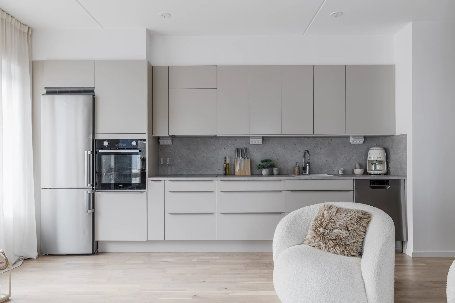 Parkettgolv och vita väggar. Beige köksinredning med grå bänkskiva och skänkskydd. Köket är utrustat med kyl/frys, inbyggd ugn, diskmaskin, häll och fläkt.