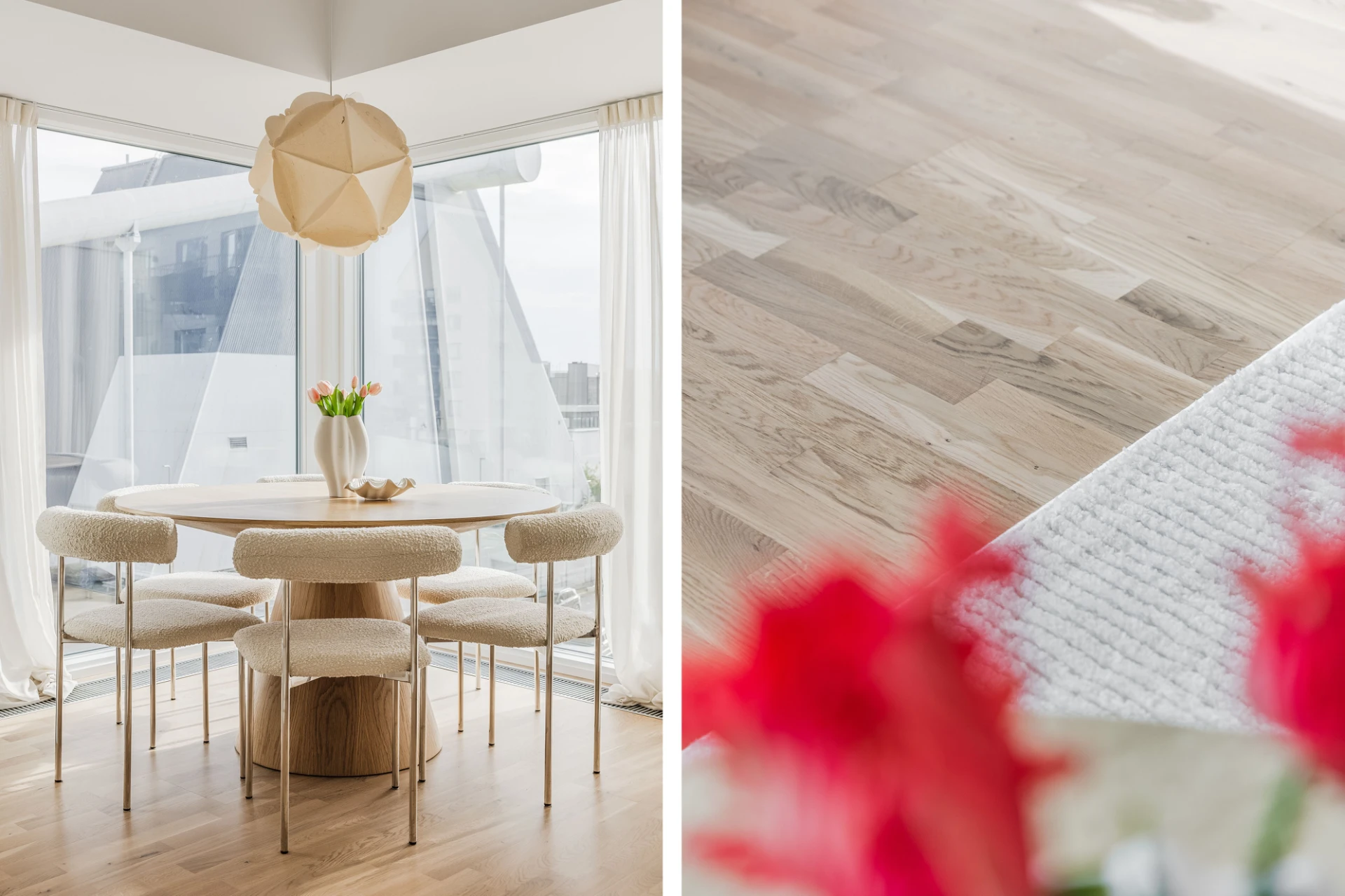 Parkettgolv och vita väggar. Plats för soff-och matgrupp. Utgång till balkong.