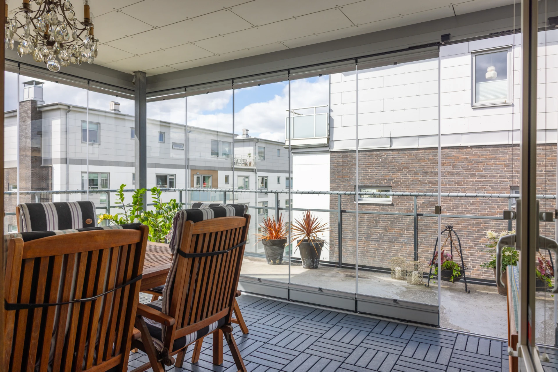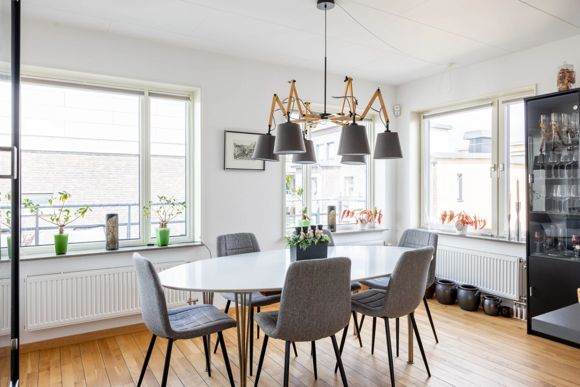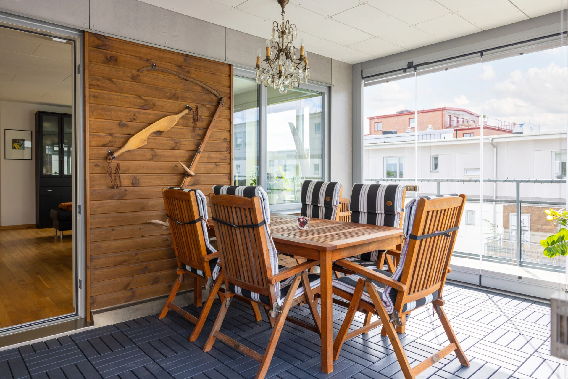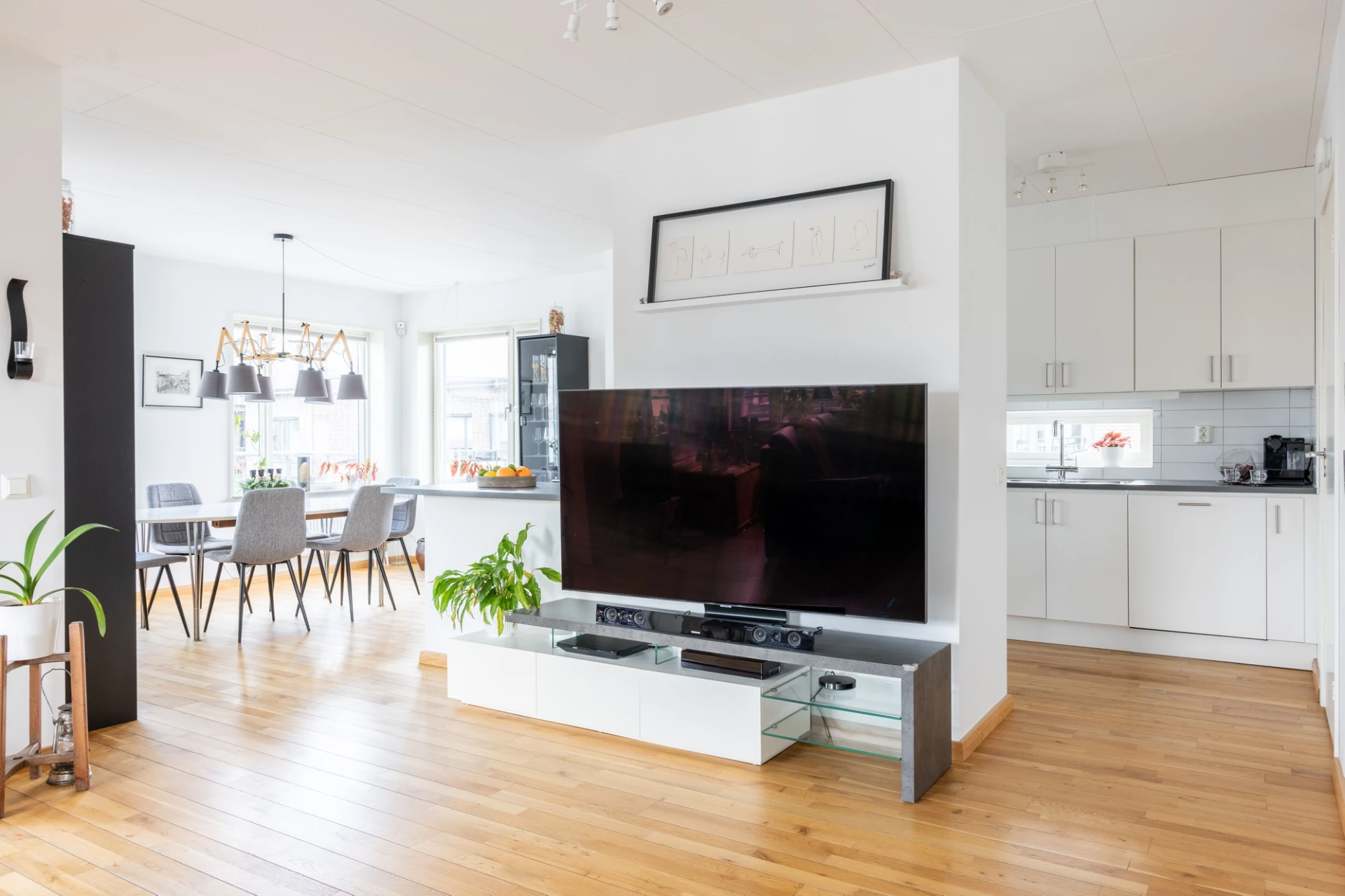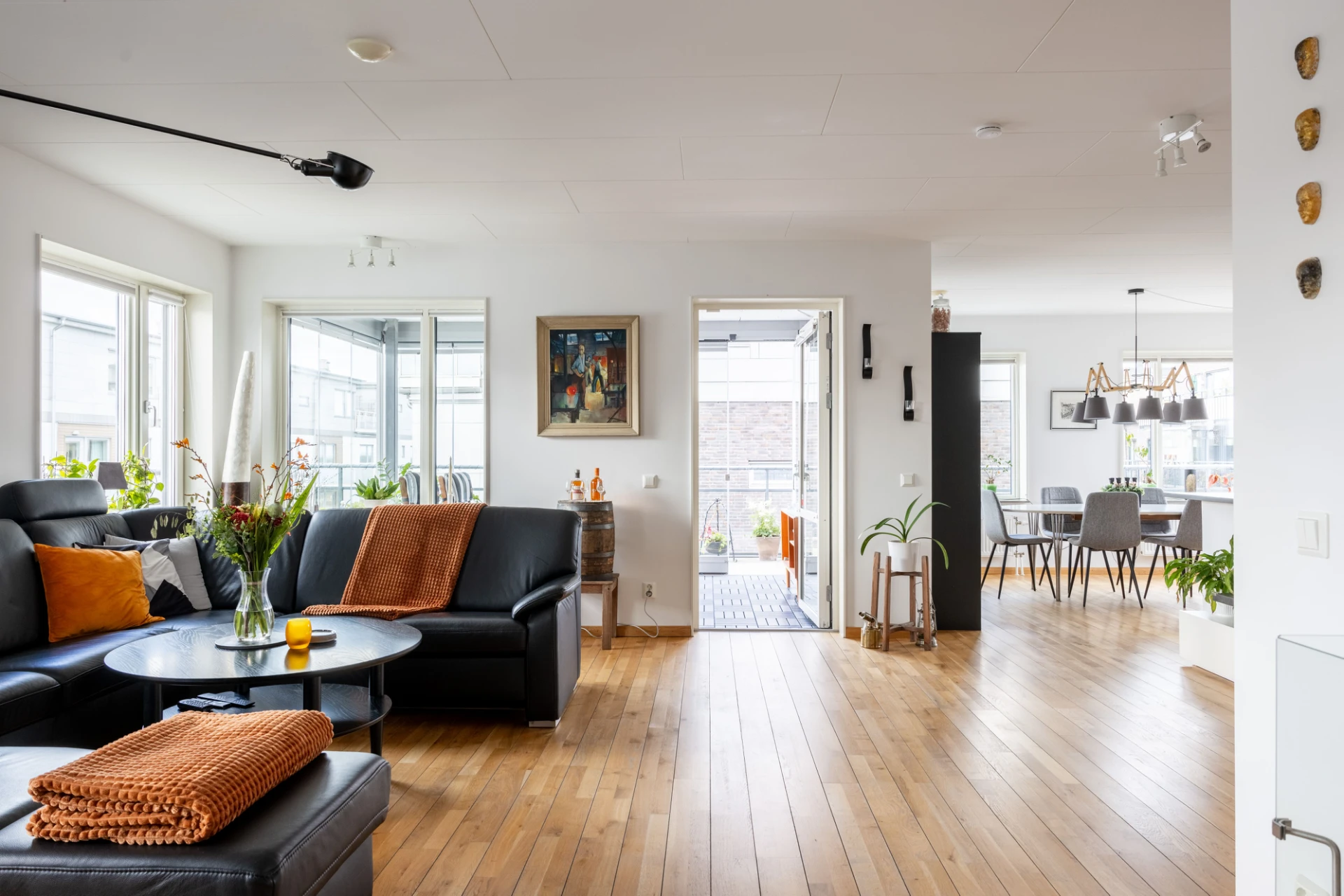 Skeppsgolv och vita väggar. Utgång till inglasad del av terrass.